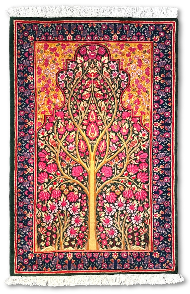 ミヒラブの曲線シルエットに収められた、ケルマン産『生命の樹』のデザインです。ケルマンらしい溢れんばかりの花々に加え、太く脈々と伸びる幹や枝からも、華やかながらもどこか力強い生命力を感じさせられます。じっくり見ると実は基調に深緑が用いられ、まるで青々とした森の中で花々が満開を迎えているかのごとく。また黄色の差し色が天から差し込む木漏れ日のようで、タペストリーとしても申し分のない、物語のある幻想的なデザインです。約1.5cmのたっぷりの厚みで、触れても眺めてもケルマンの豊かさに浸れる一枚となっております。 IDNo. PB890039 産地 : 南イラン・ケルマン 素材 : 縦糸 綿、パイル ウール サイズ : 約124×81(cm) ※ 表記は両端のフリンジを含まないサイズです。 ✴︎こちらの商品には滑り止めをサービスでお付け致しておりますので、お届けしてからすぐにお使い頂けます。 ✴︎ウール用洗剤で手洗いできます。商品お届け時に「絨毯のお手入れ」に関するご説明も併せてお送り致します。