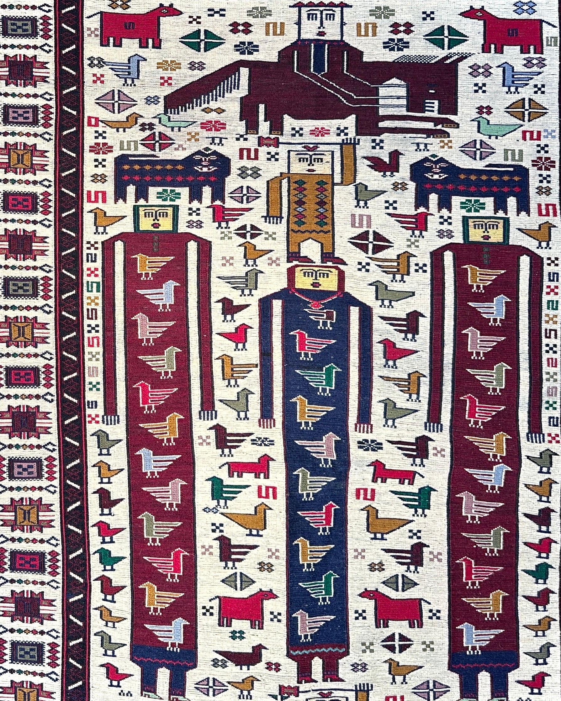 胴長人間達に動物まみれ!?少々情報過多なコミカルデザインのキリム、専門的に解説させて頂きます。