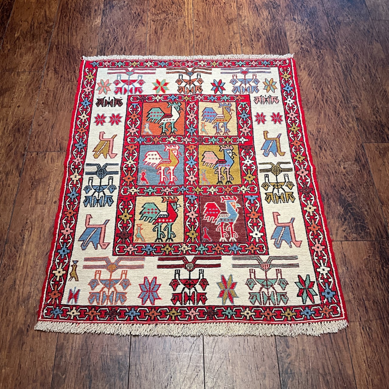 この地方はシャーサバン族と呼ばれる部族の人々が多く暮らしています。シャーサバン族はイラン最北西部において、他民族の侵攻からペルシャ帝国の領土を守っていたことで知られています。この地域で織られるキリムは「ソマック織り」と呼ばれる、大変手の込んだ技法で緻密に織られています。この「ソマック織り」は極細の糸でしっかりと固く巻き付けるよう二重に織られていますので、複雑なデザインも緻密に、そして鮮明に表現することができます。