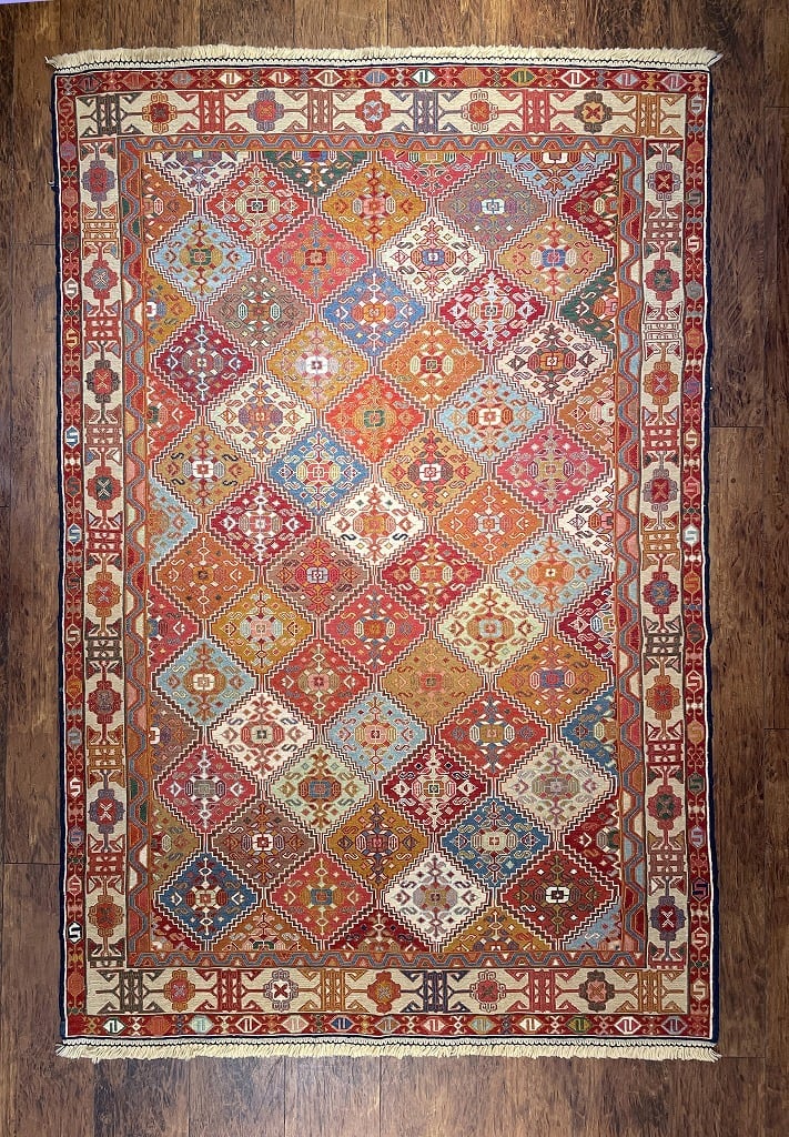 この地方はシャーサバン族と呼ばれる部族の人々が多く暮らしています。シャーサバン族はイラン最北西部において、他民族の侵攻からペルシャ帝国の領土を守っていたことで知られています。この地域で織られるキリムは「ソマック織り」と呼ばれる、大変手の込んだ技法で緻密に織られています。この「ソマック織り」は極細の糸でしっかりと固く巻き付けるよう二重に織られていますので、複雑なデザインも緻密に、そして鮮明に表現することができます。
