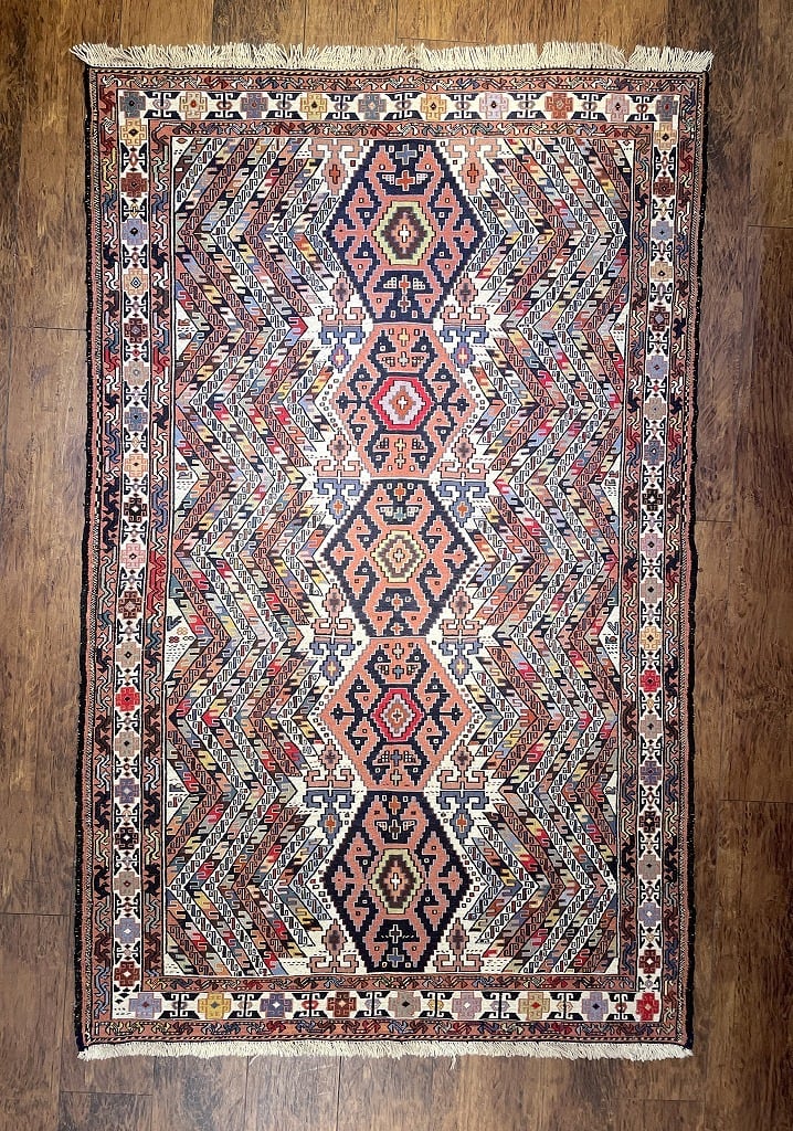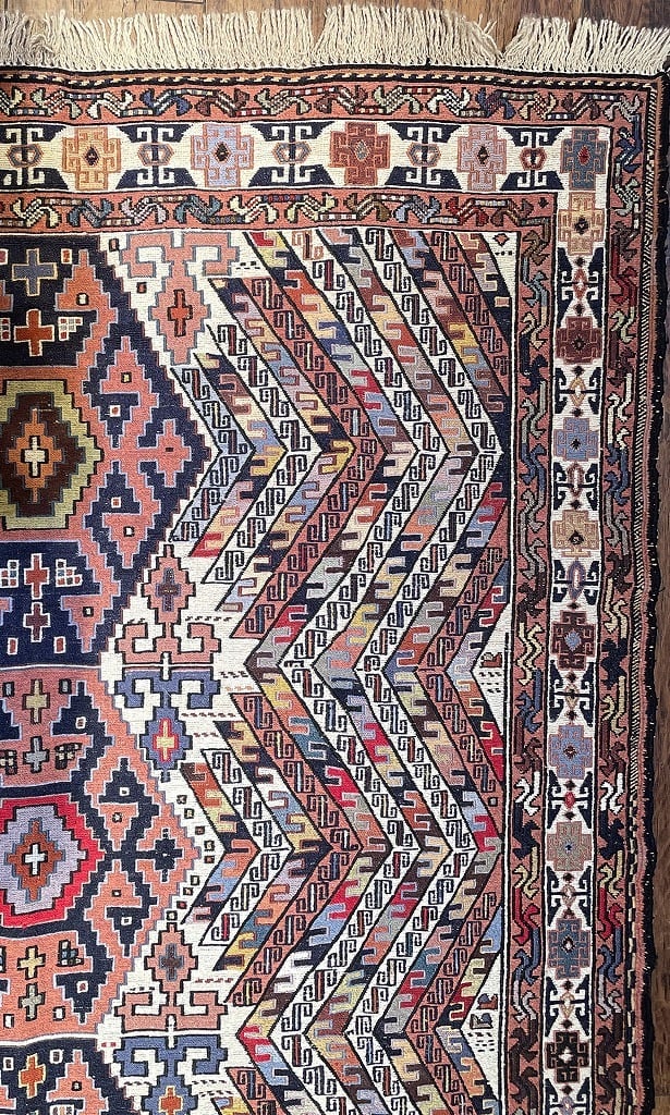 この地方はシャーサバン族と呼ばれる部族の人々が多く暮らしています。シャーサバン族はイラン最北西部において、他民族の侵攻からペルシャ帝国の領土を守っていたことで知られています。この地域で織られるキリムは「ソマック織り」と呼ばれる、大変手の込んだ技法で緻密に織られています。この「ソマック織り」は極細の糸でしっかりと固く巻き付けるよう二重に織られていますので、複雑なデザインも緻密に、そして鮮明に表現することができます。