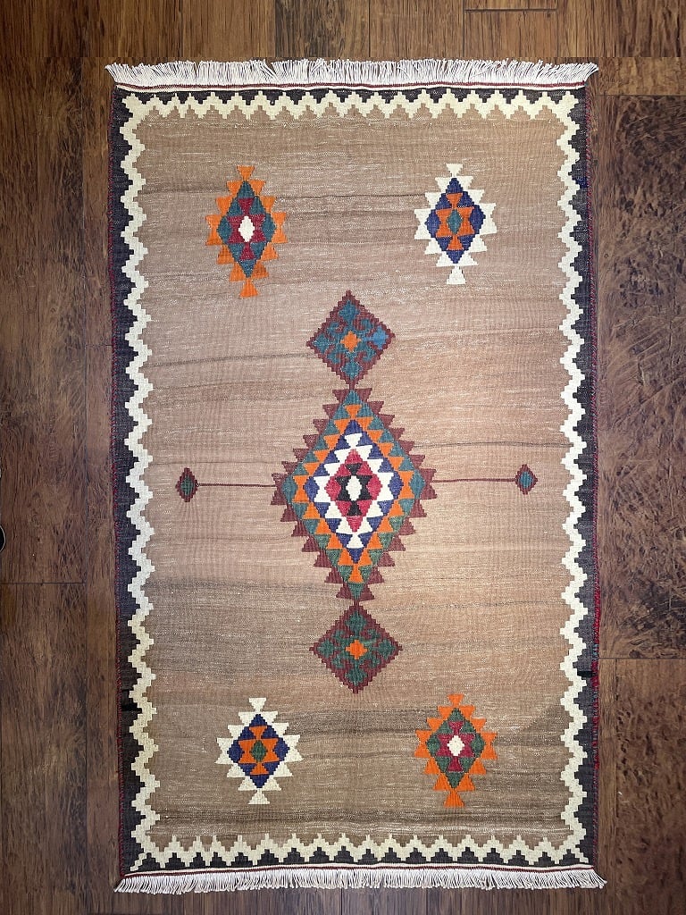 基調のブラウンとデザインの一番外側に焦げ茶色は染めていない原毛です。素朴なデザインですが、くっきりと織り込まれた紋様はシーラーズのキリムらしさを感じさせます。