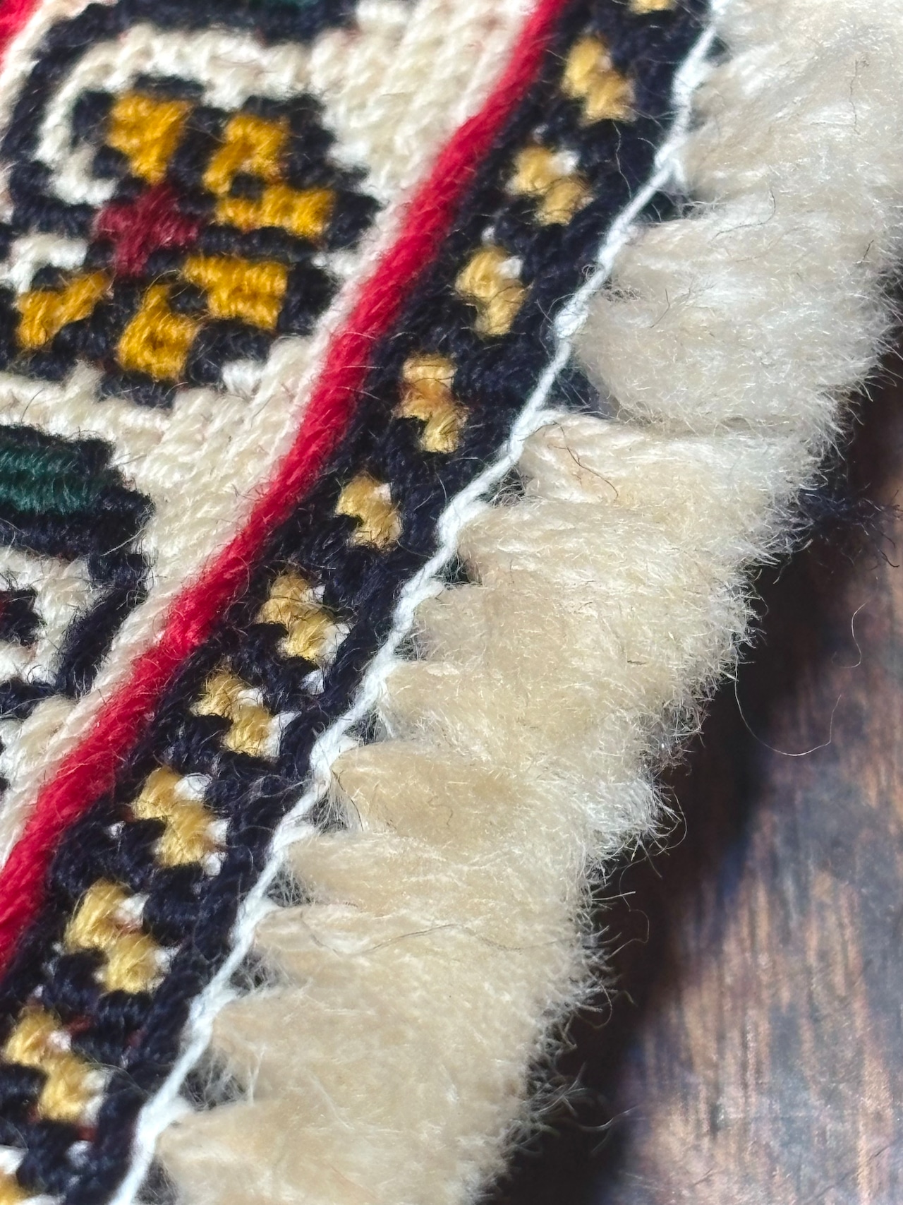 「コルクウール」と呼ばれる羊の肩〜首回りの、細くしなやかな毛を用いて織られた、大変上質な肌触りのキリムです。他の産地のキリムと比較して、上下にフサとして出ている縦糸の本数が多く、またその毛がふんわりとしていることが、素材と織りの良さを物語っています。