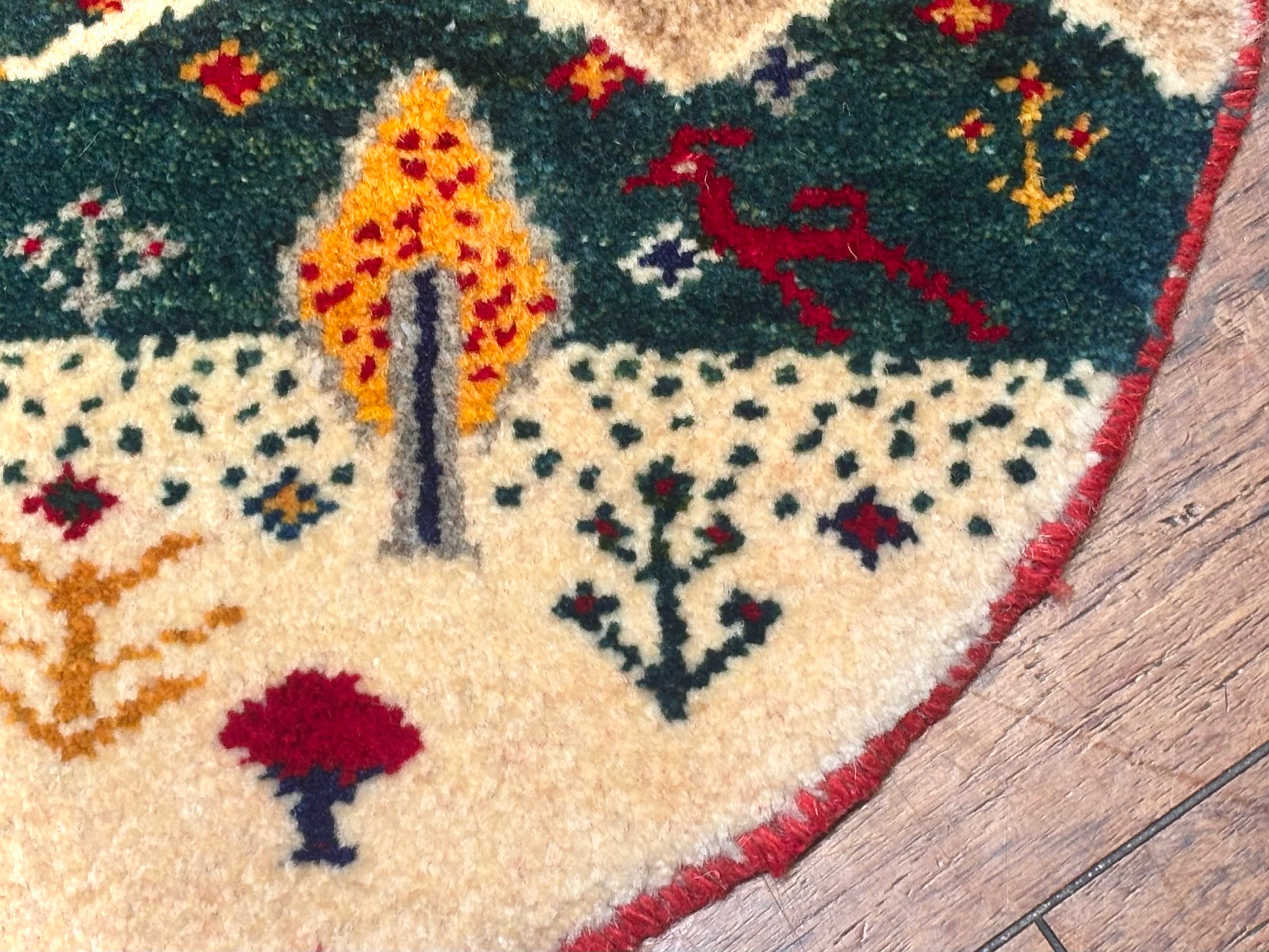 当店では、〈正方形〉と〈円形〉の2種類のタイプのミニギャッベをご用意致しております。円形タイプは、より細めの上質なウールが用いられていることから、織りが細かく、曲線や細密な表現が活かされた景色や動物(ライオン・ラクダ)など、個性的なデザインが揃います。
