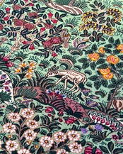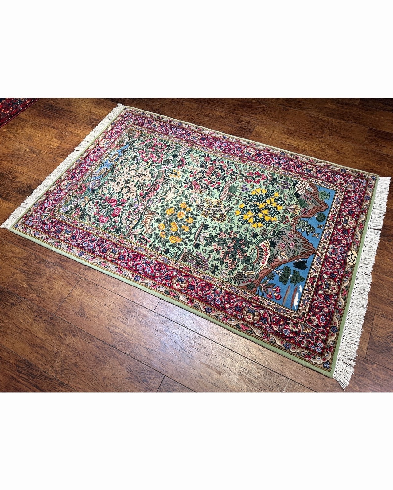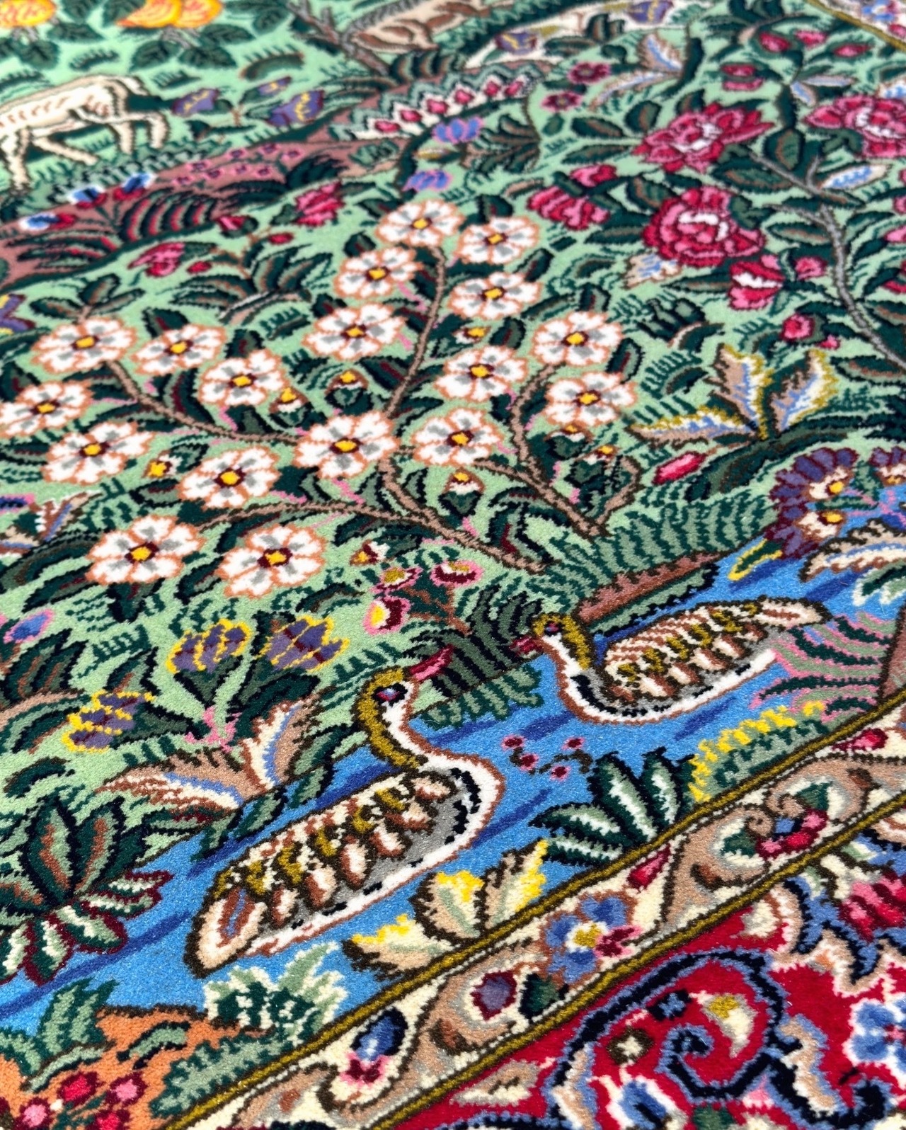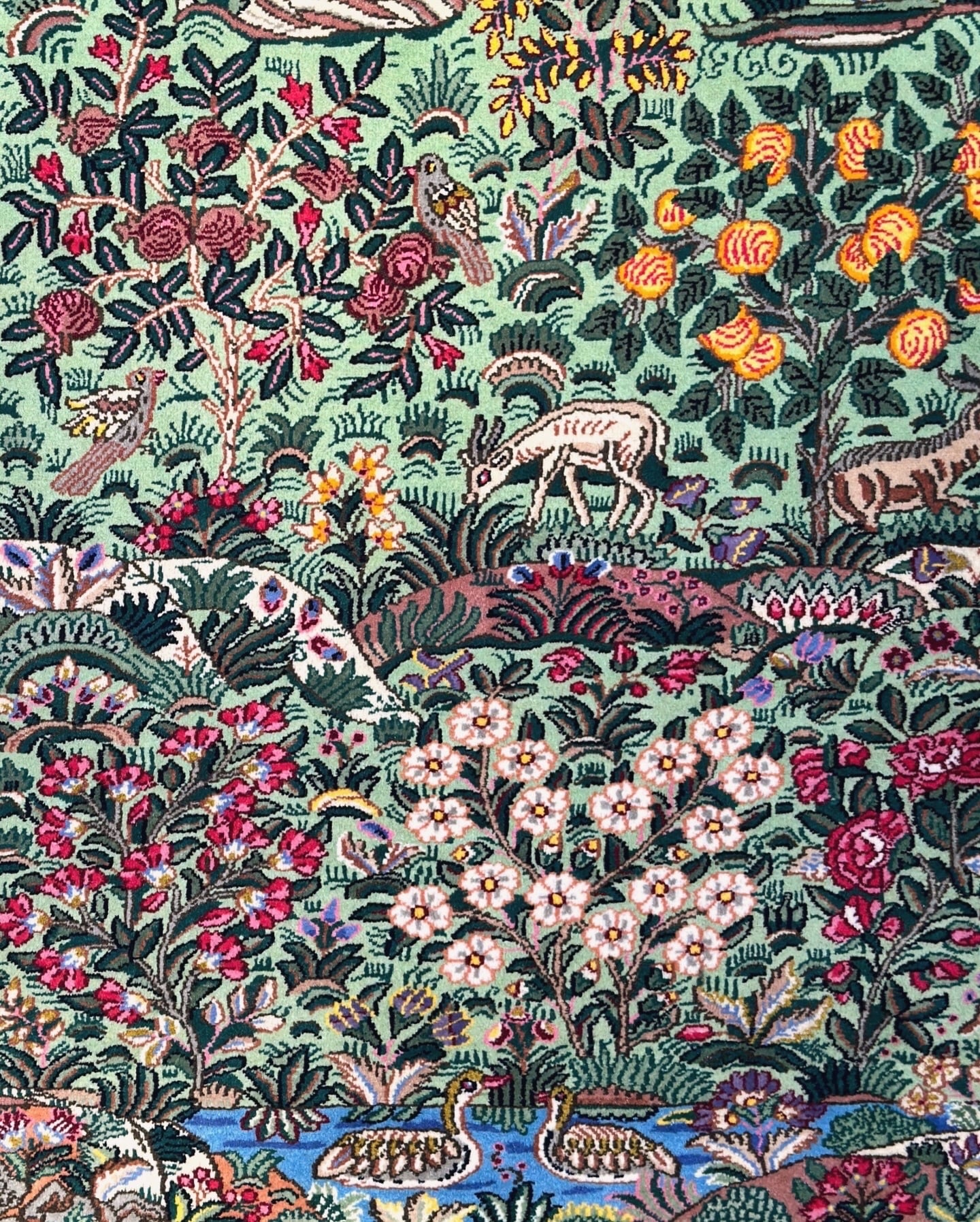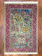 ケルマン産のウール絨毯です。ペルシャ的な理想のオアシス像を絨毯に投影した豊かなデザインとなっています。ミントグリーンの軽やかな基調が珍しく、ケルマン特有の華やかなデザインの高揚感を明るく高めています。ザクロや洋梨など、描かれる果実の種類も様々〜ケルマンを象徴する花々の描写をより生命力溢れるものに昇華しています。水辺から山、そして青空までリピートの箇所が一切なく、どこを切り取っても絵になります。上部には『アルジョマン』と工房名も織り込まれております。ケルマン産は大きなサイズがよく織られる中、お部屋に取り入れて頂き易いサイズ感も魅力的です。是非あなた様のお部屋に、眺められる景色を敷き広げて下さいませ。