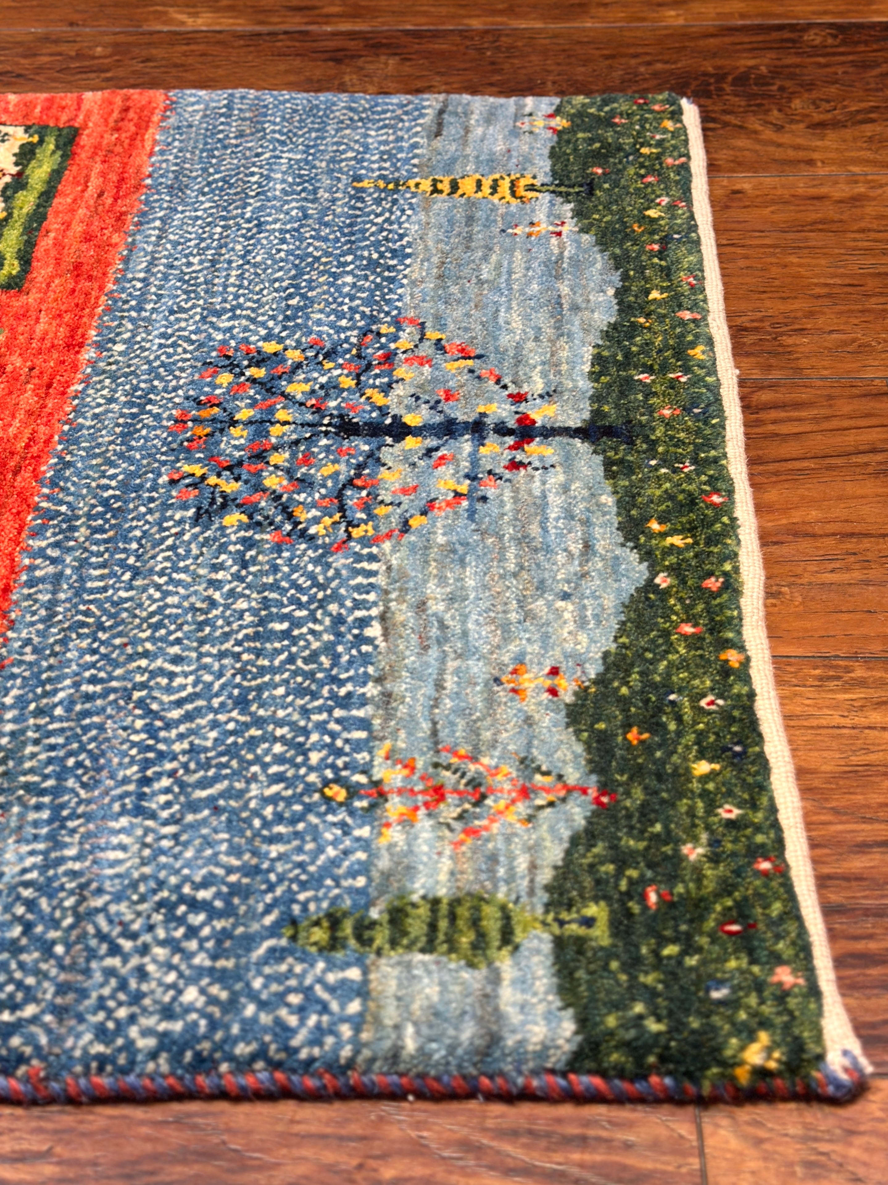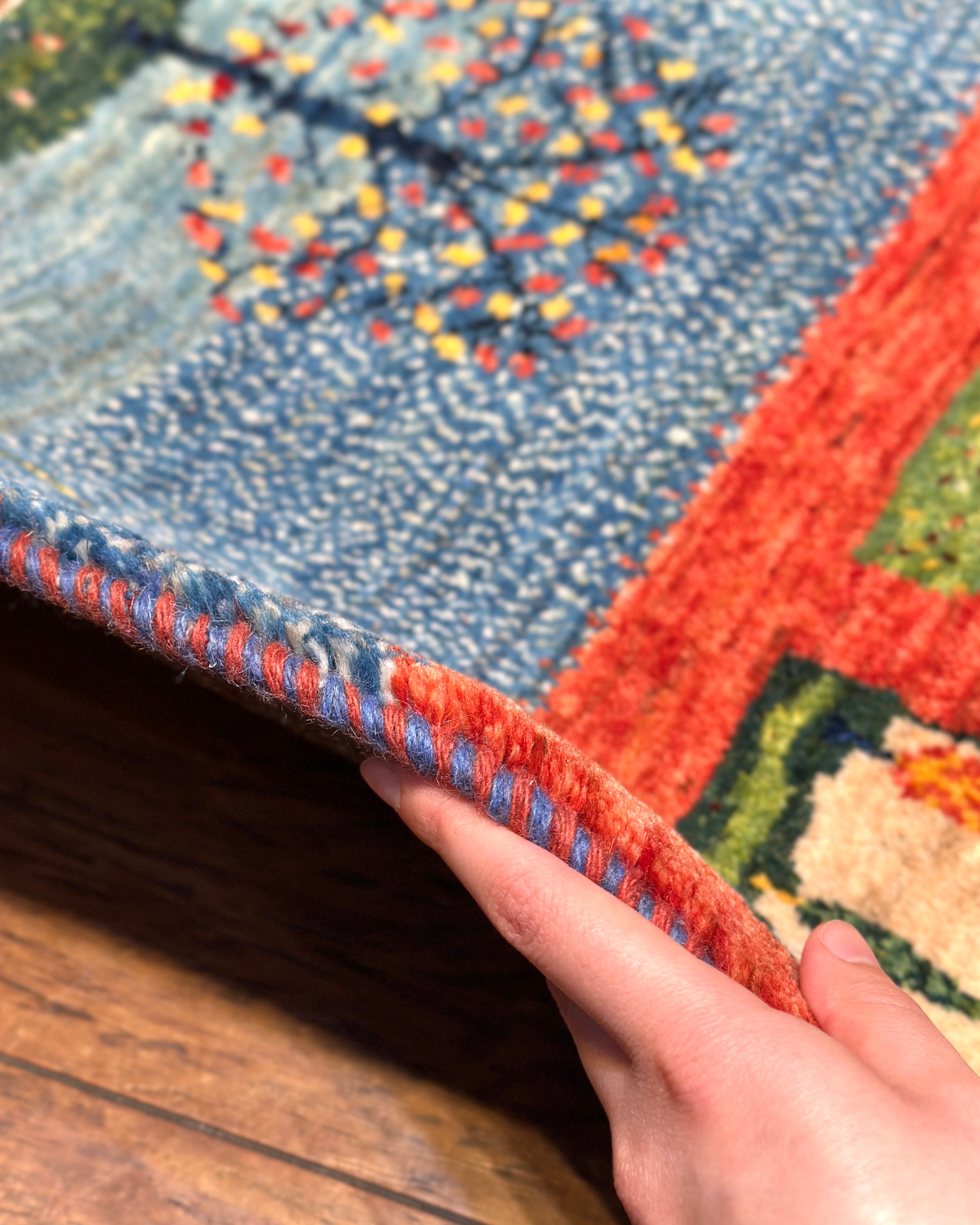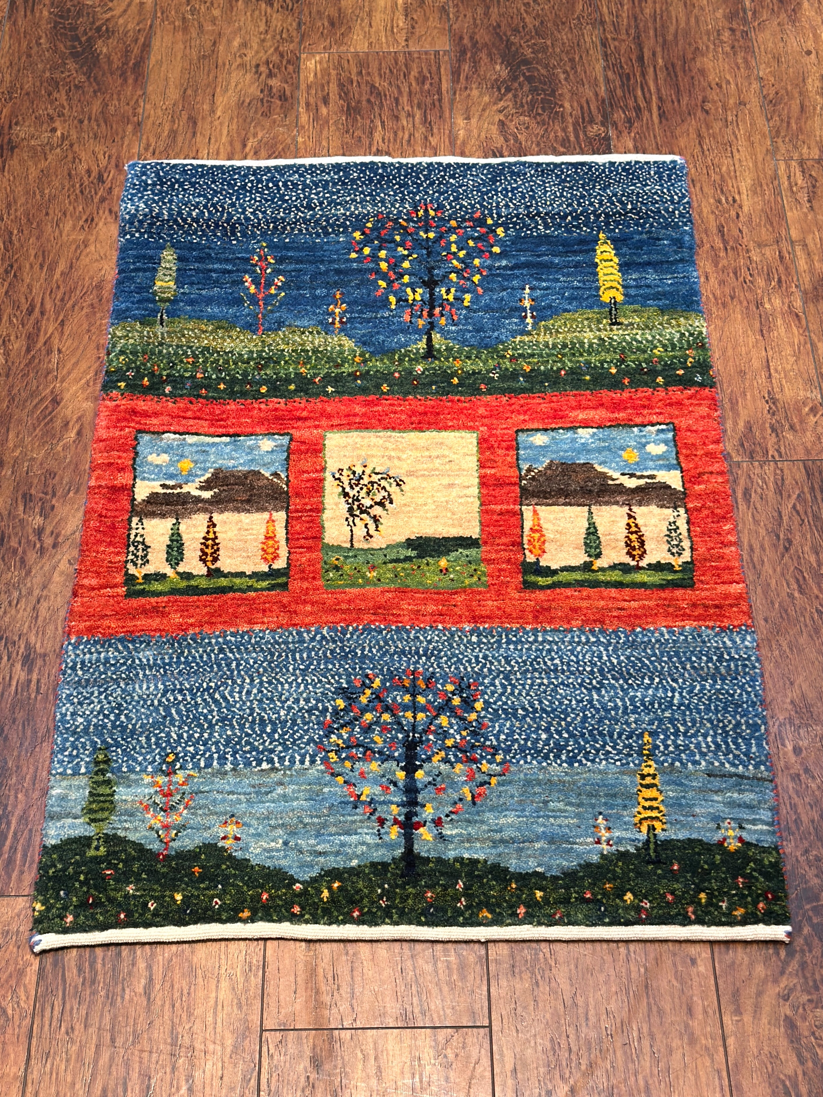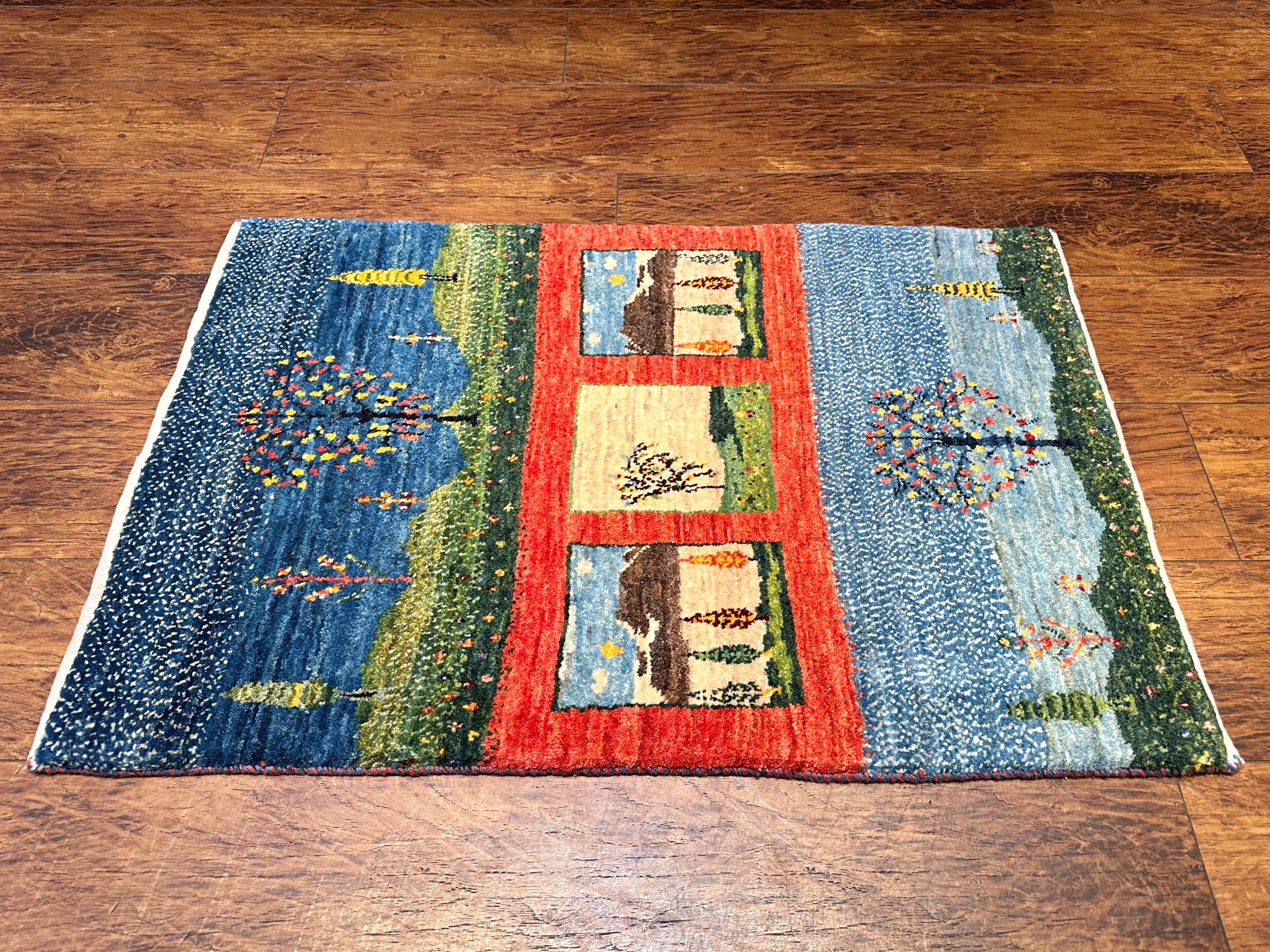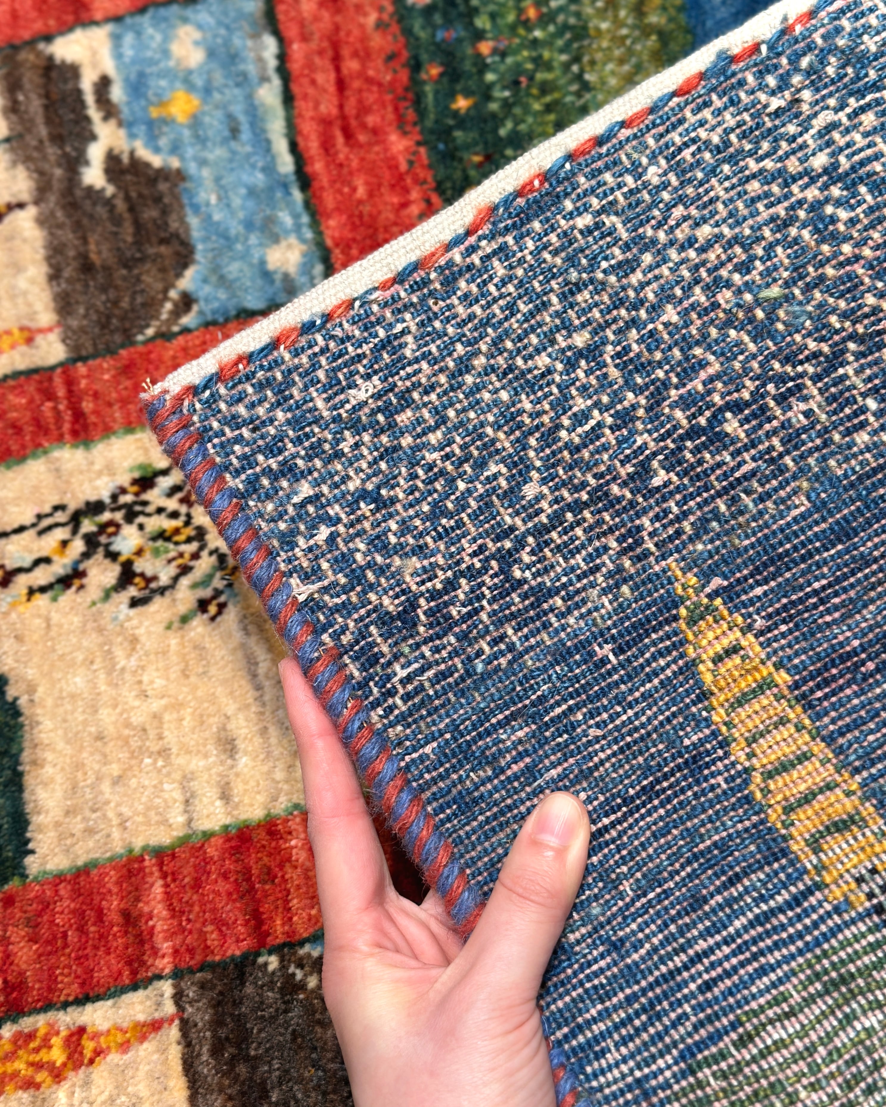1枚の中にいくつもの景色が広がる、のどかなデザインのギャッベです。草木染めの動きがある染め色に加え、ひと結び毎に色を変え、ドットで織られている箇所が多く、豊かなデザインの奥行きや深みが一層増して見えます。織りが緻密で草原の小花までも、細やかに織り上げられているのも見所です。中央は赤のボーダーで切り返しがあるのと、3つの格子が綺麗に並んでおり、横向きに敷いてもスッキリ整った印象。お玄関マットにはもちろん、タペストリーとしても抜群のデザインです。『 触れて、眺めて、癒される』そんな暮らしのワンシーンを、あなたのお部屋の中にも作りませんか?