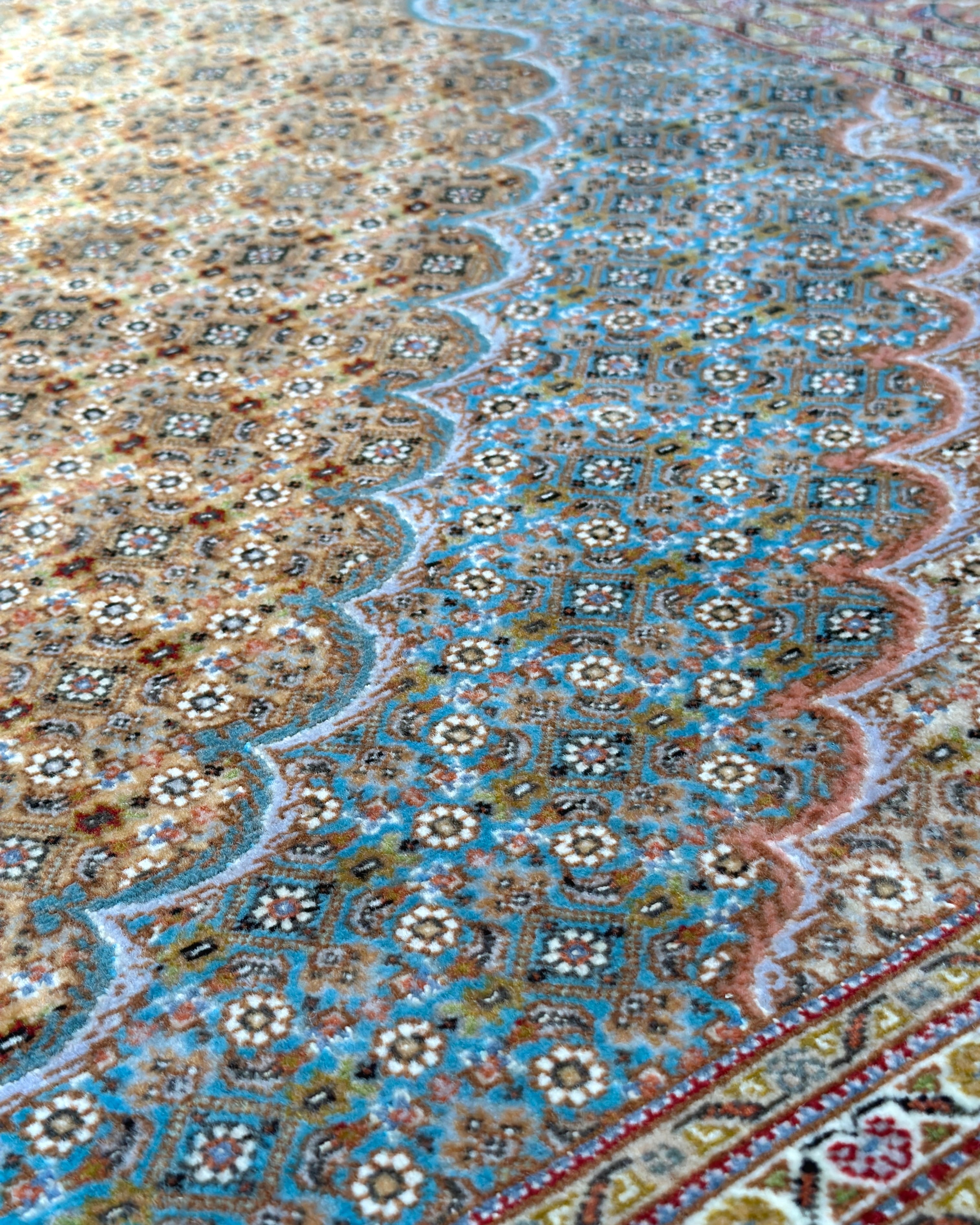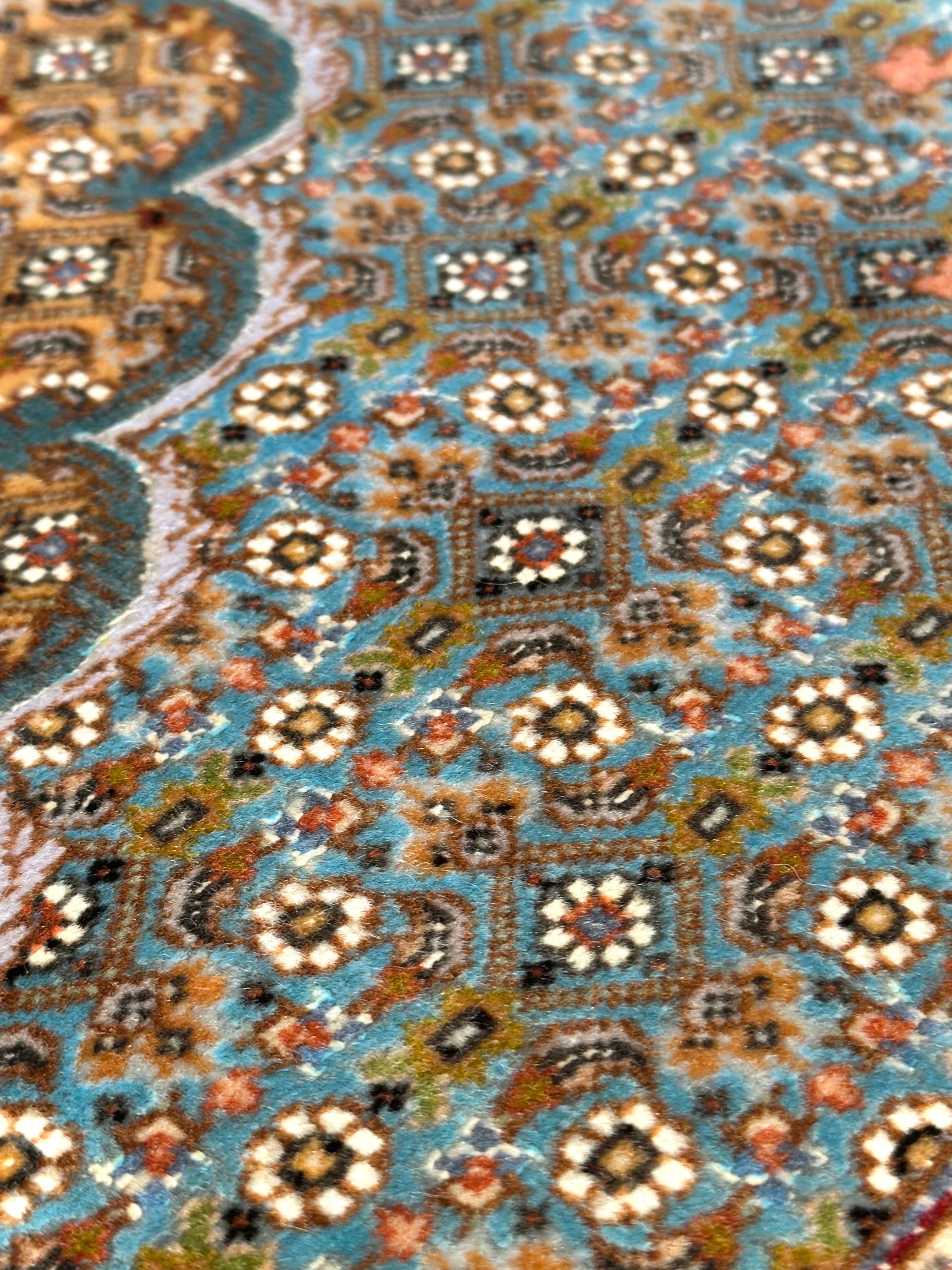そしてなんと言っても、古いタブリーズの特徴が出るのが【配色】です。青ピンク紫etc…とパステルカラーが各所に添えられ、現代物には見られない色の組み合わせが、マニア心をくすぐられる魅力的な一枚となっております。