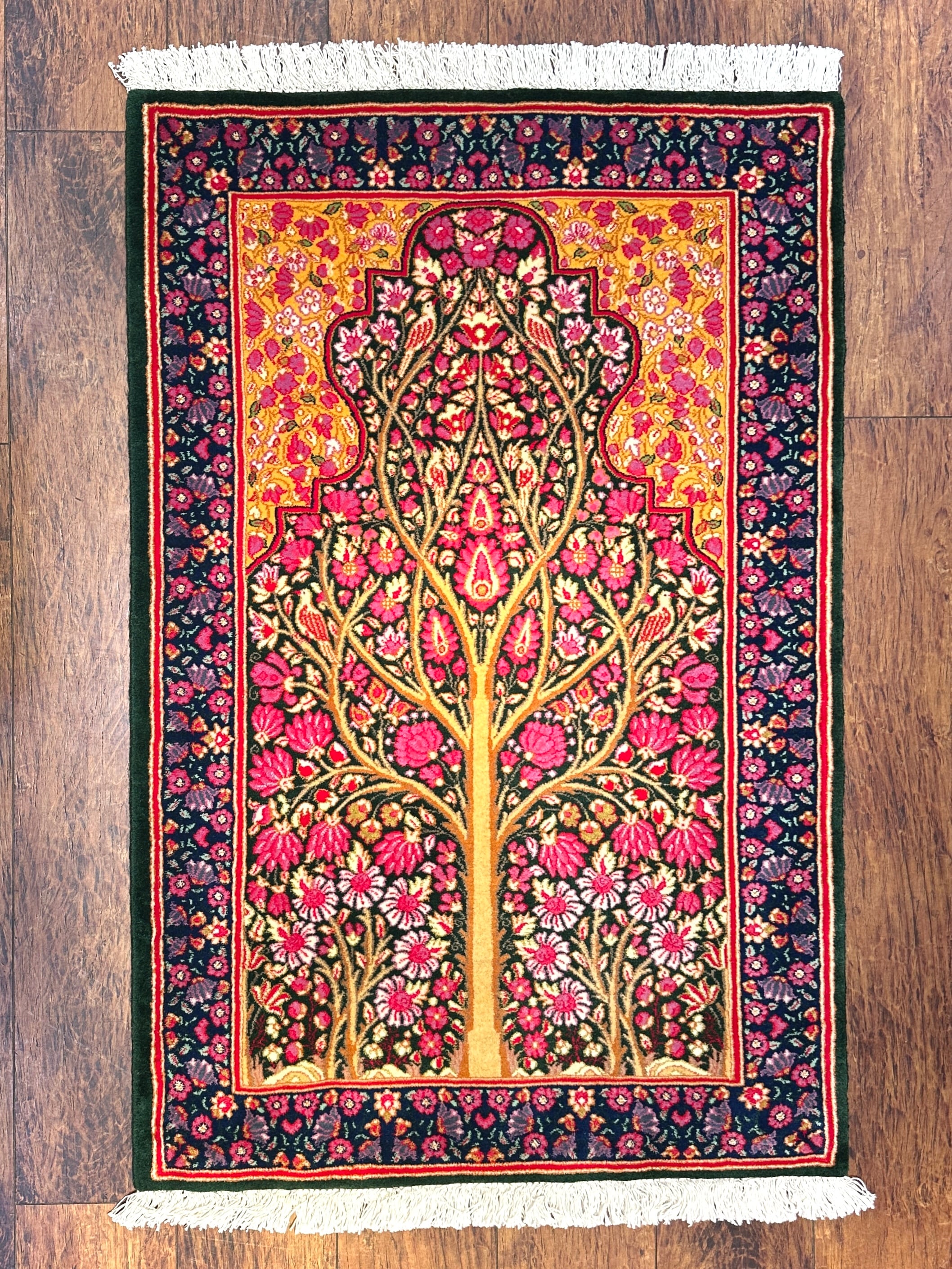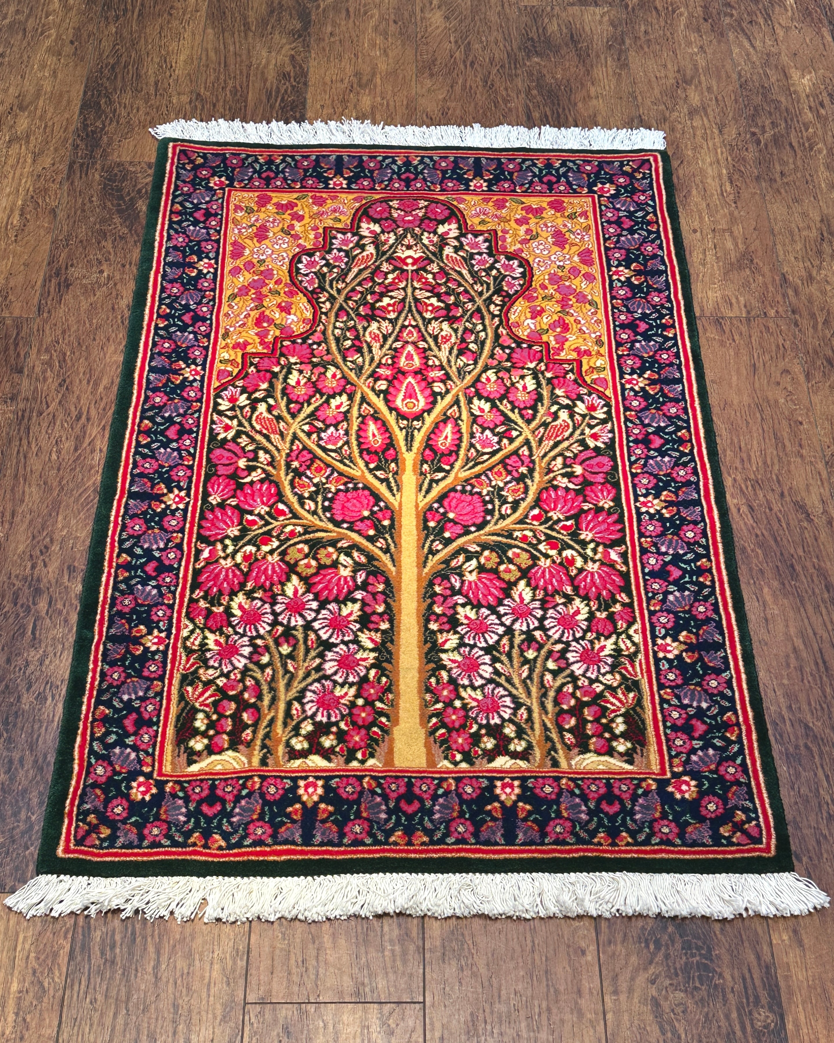 ケルマンの絨毯のデザインには、この地で先に行われていたショール生産の影響が見られます。ケルマンの美しいショールに関しては、マルコ・ポーロもその存在に触れており、当時のヨーロッパでは広く好まれていました。こうした歴史の中で、ケルマン独自の美的感覚が養われ、他に類をみない華やかな絨毯のデザインを作り上げています。