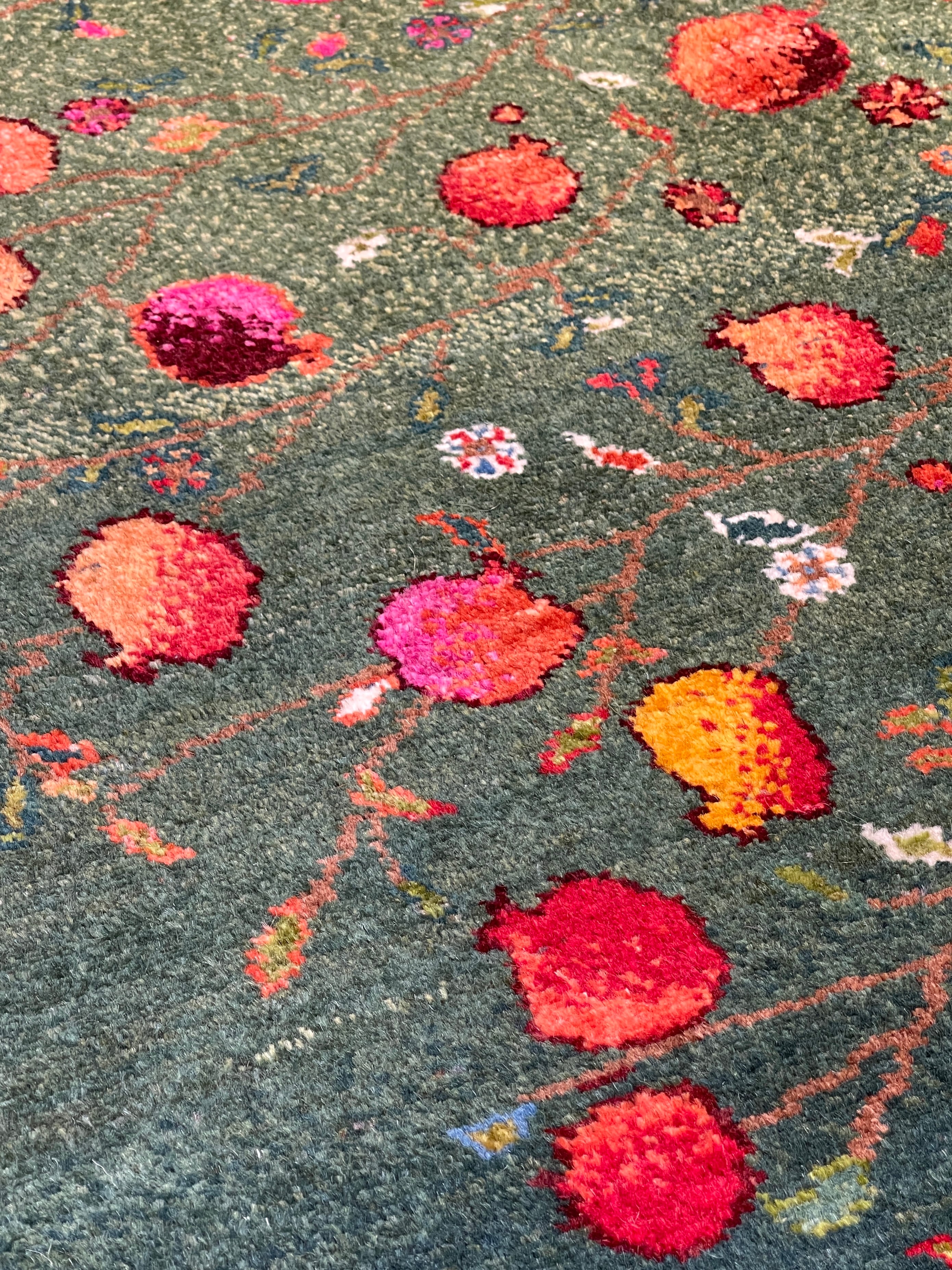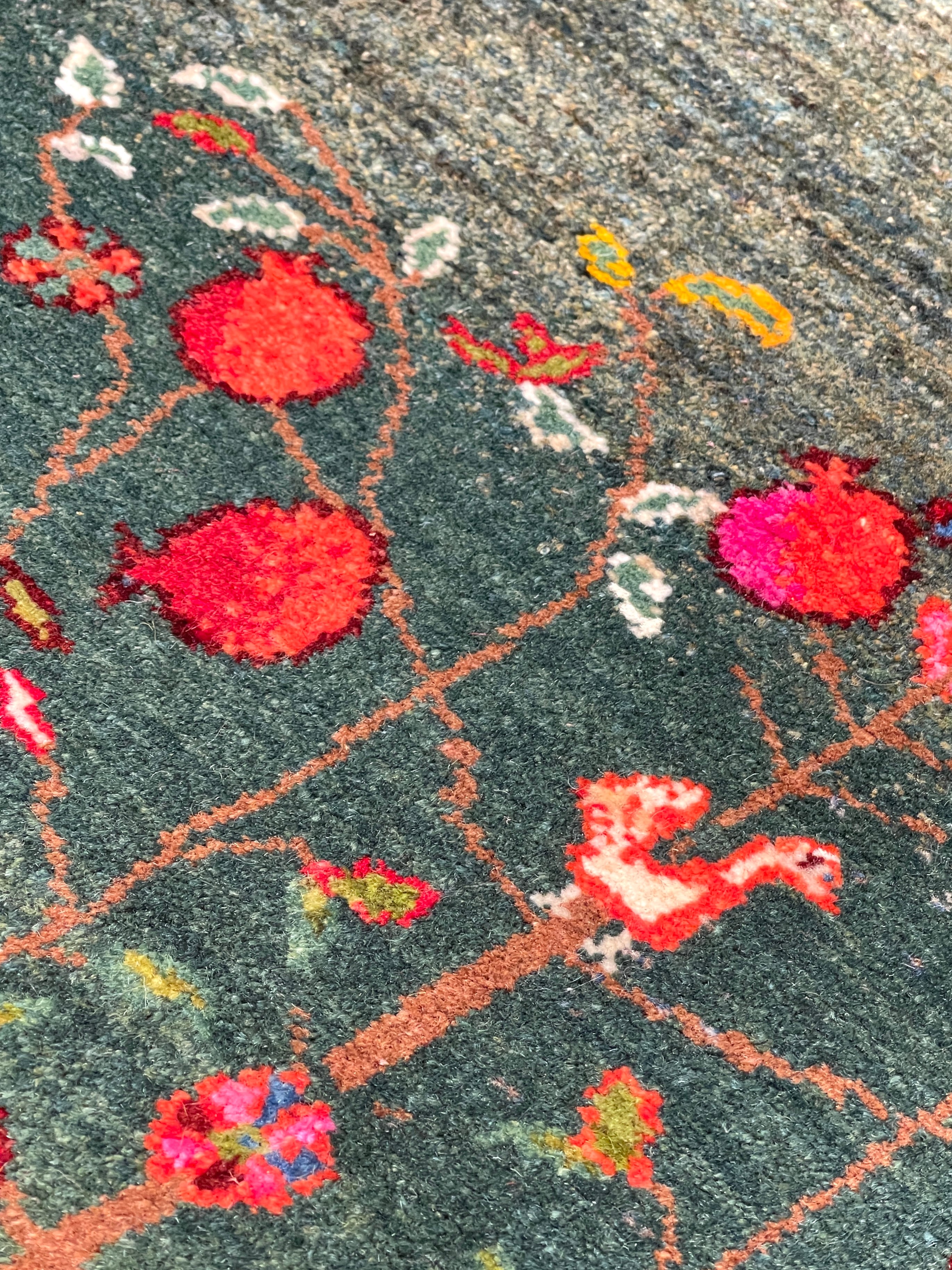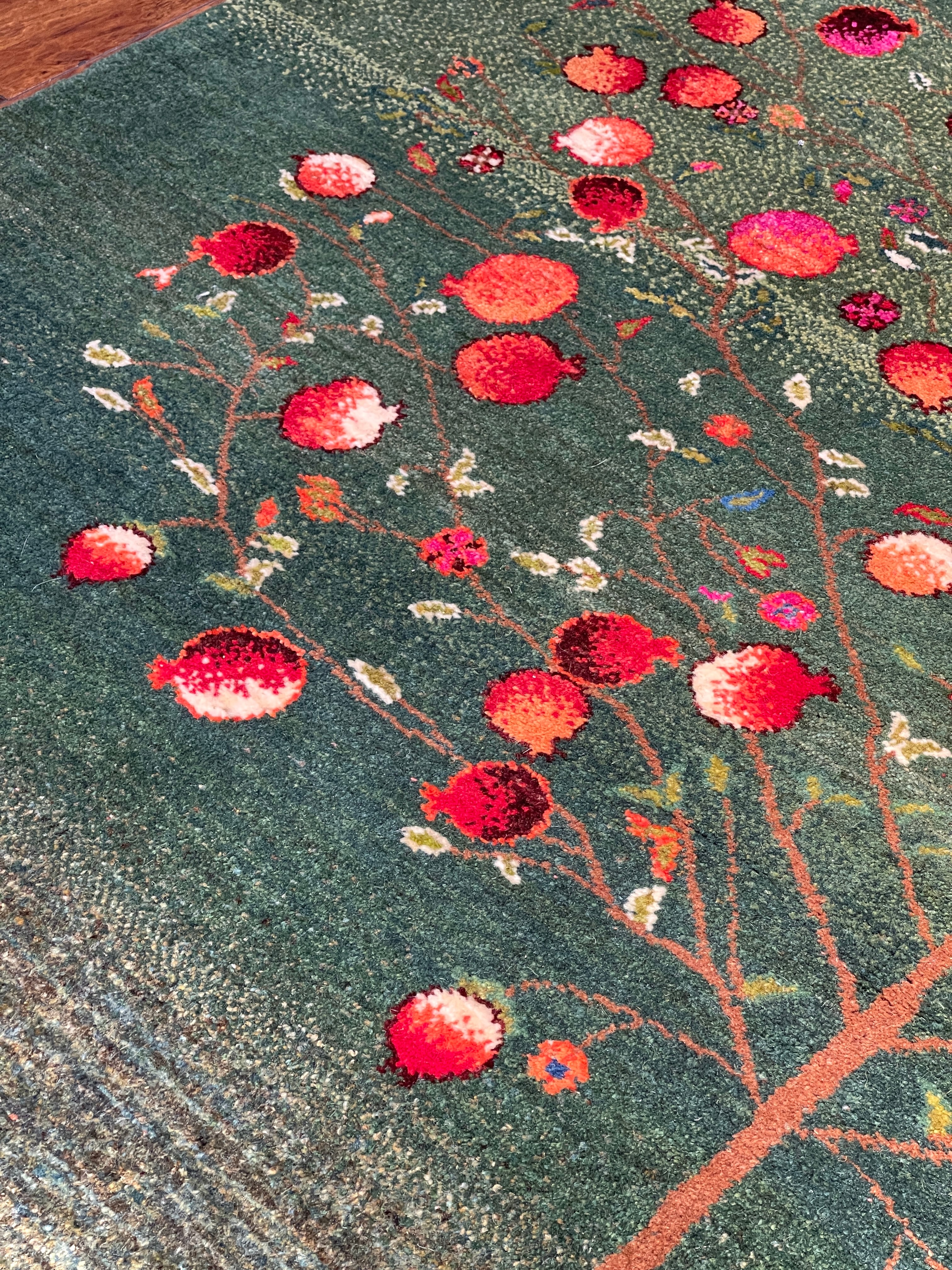 憧れの『ザクロの木』〜 緑を基調としたお品です。ザクロの木がたっぷりと幅を持って描かれ、柄と背景のバランスが理想的な黄金比となっています。『ザクロの木』という揺らがない大らかな存在感や豊かさが、存分に引き出されているように感じられます。