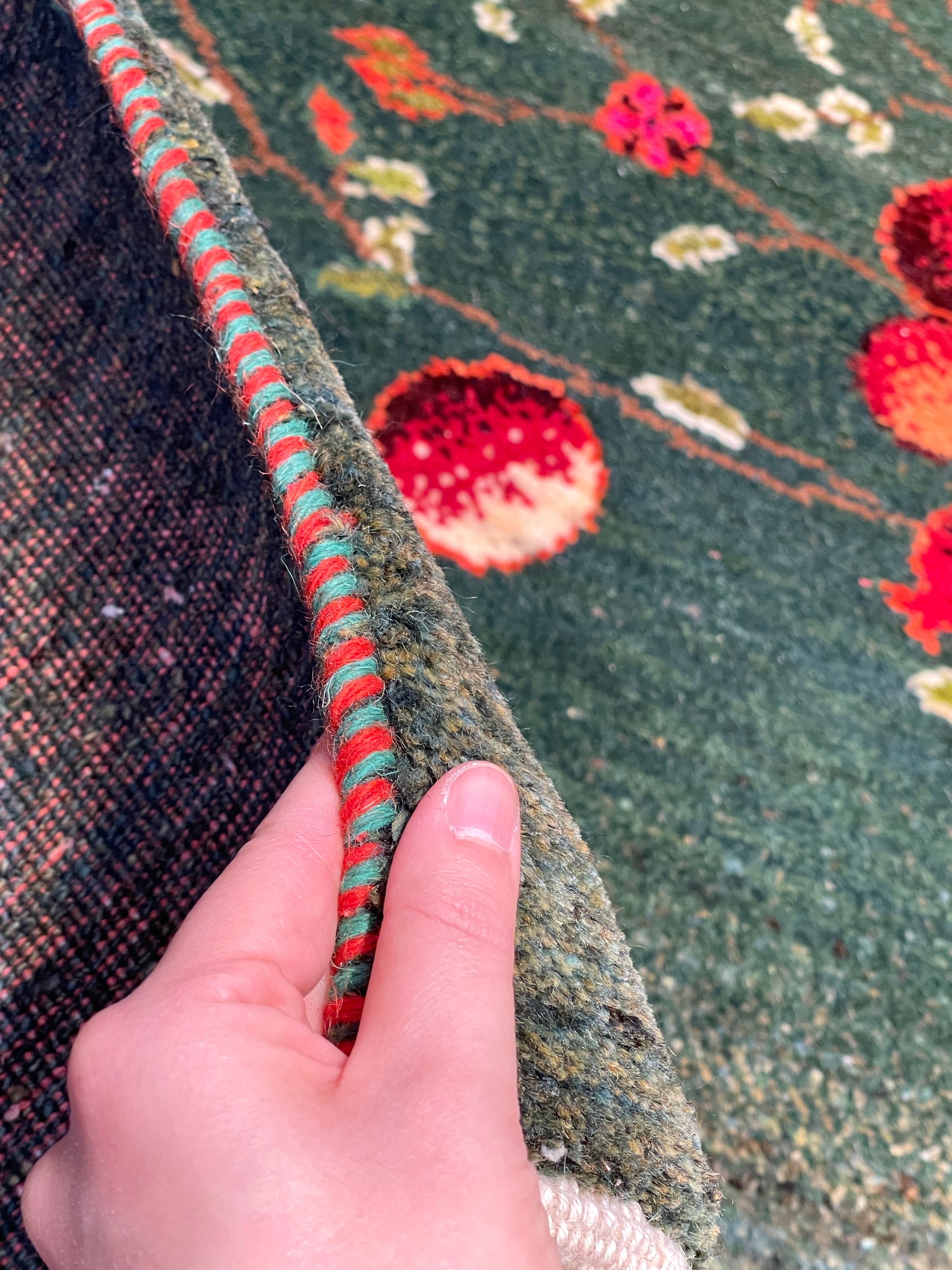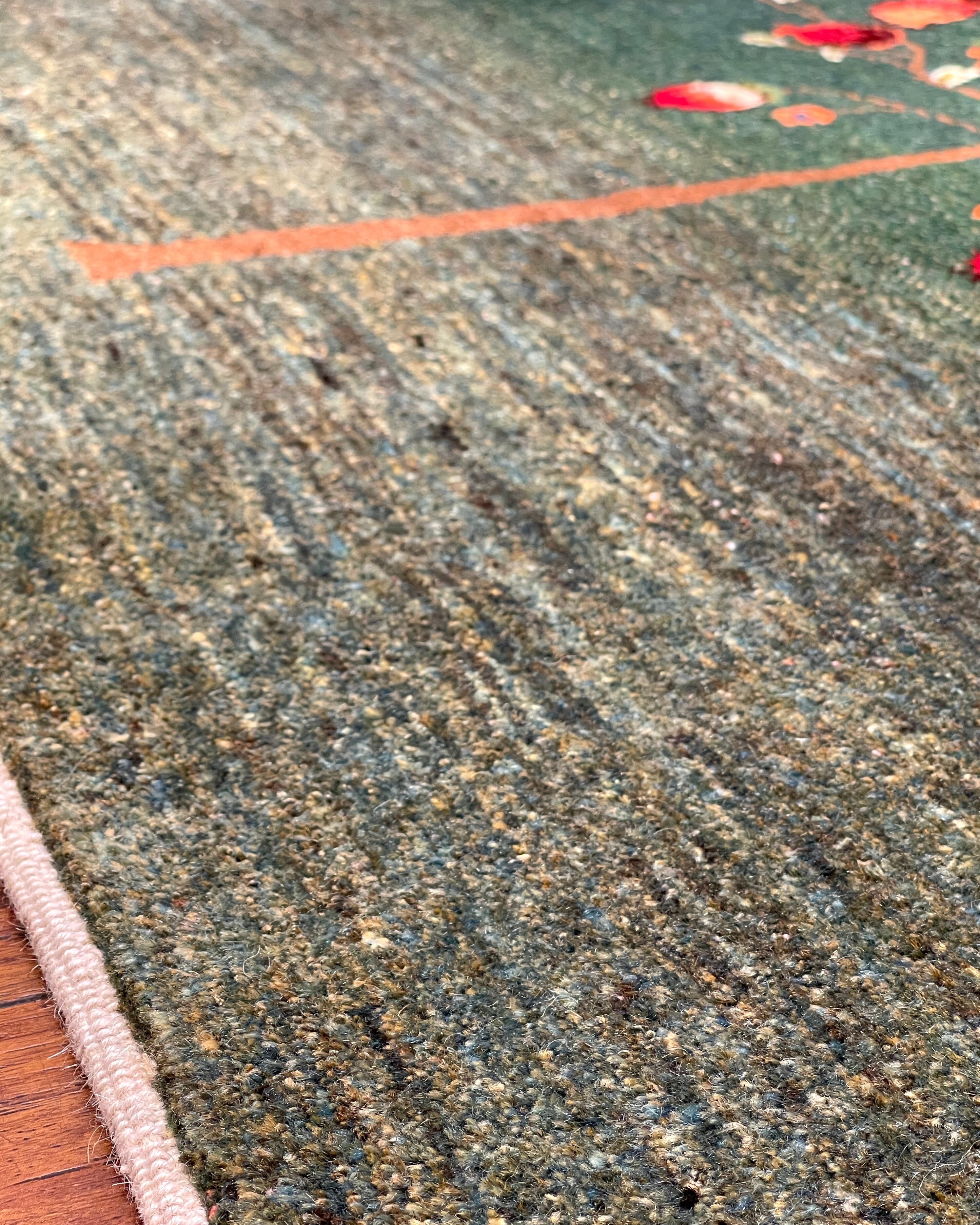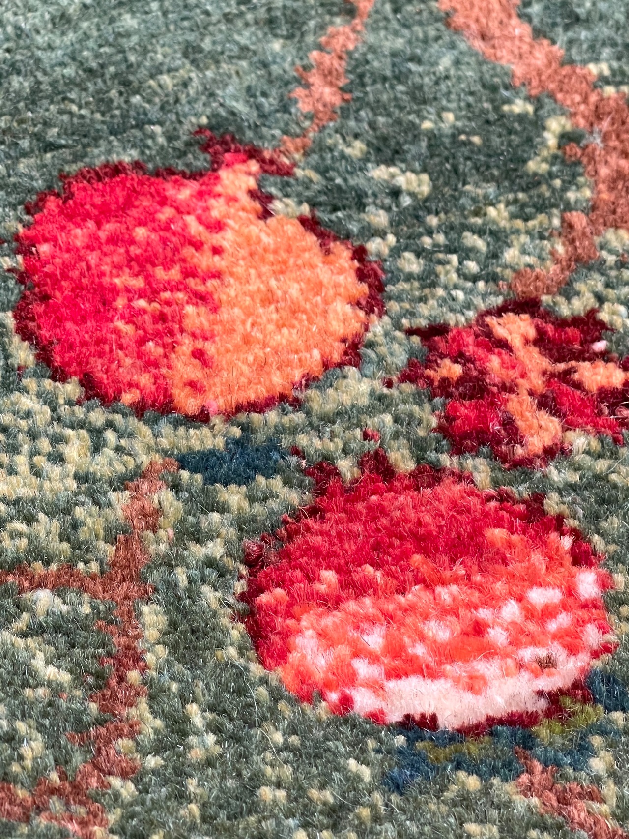 また基調は緑と言えど単色ではなく、黄緑や青緑など様々なトーンの緑がひと結び毎に複雑に織り交ぜられ、出来上がった自然な色の移ろいも見事です。