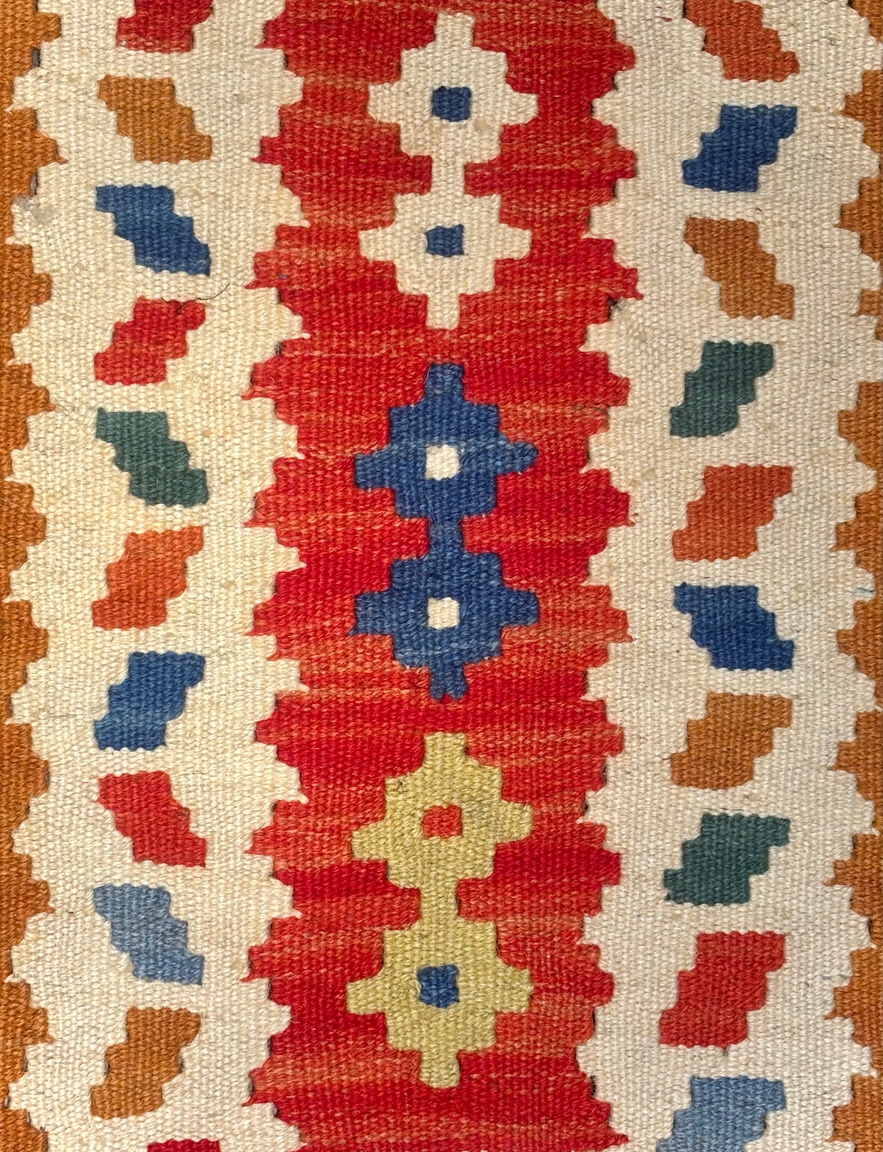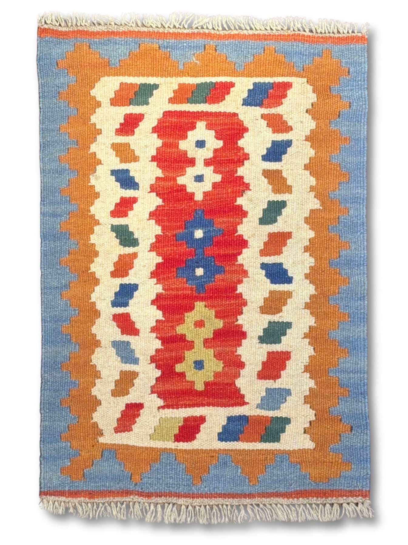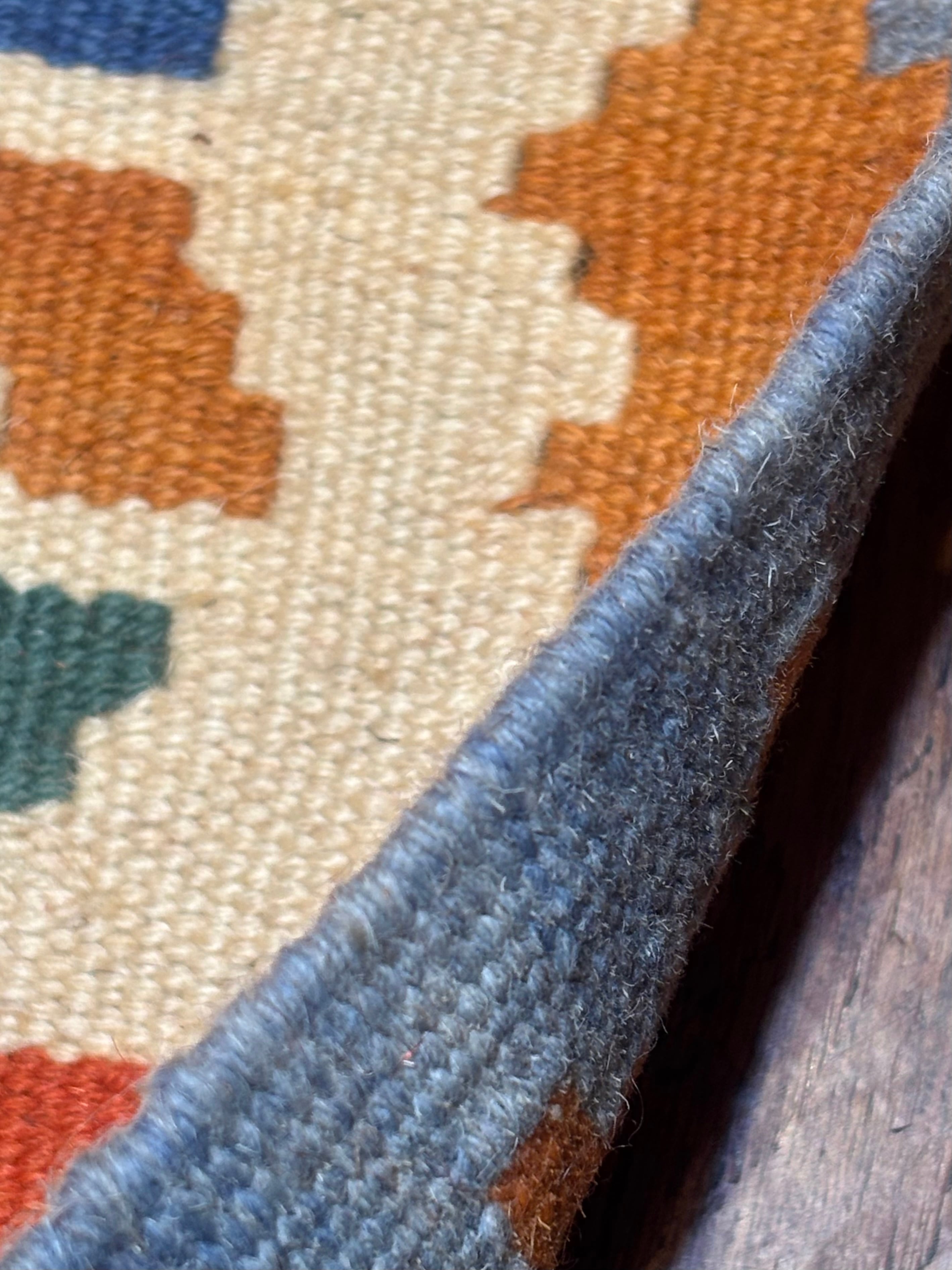 南西イラン・シーラーズ近郊で遊牧生活を営んできたことで知られる、カシュガイ族のキリムです。スタイリッシュなデザインですが、カシュガイ族に由来する伝統的な紋様と南イランらしい明るい色の組み合わせで織られています。デザインを構成する幾何学紋様は、遊牧生活の中で、厄除けや幸福への願いから生まれたものです。薄い織り上がりのキリムですが、ウールで織られているので床の冷たさを感じさせず、暑い季節でもスッキリとしたお使い心地で、オールシーズン活躍します。お玄関マットやベッドサイドとして、洗いやすいのでキッチンマットやワンちゃん、猫ちゃんのコーナーにもオススメです。両面お使いいただけます。
