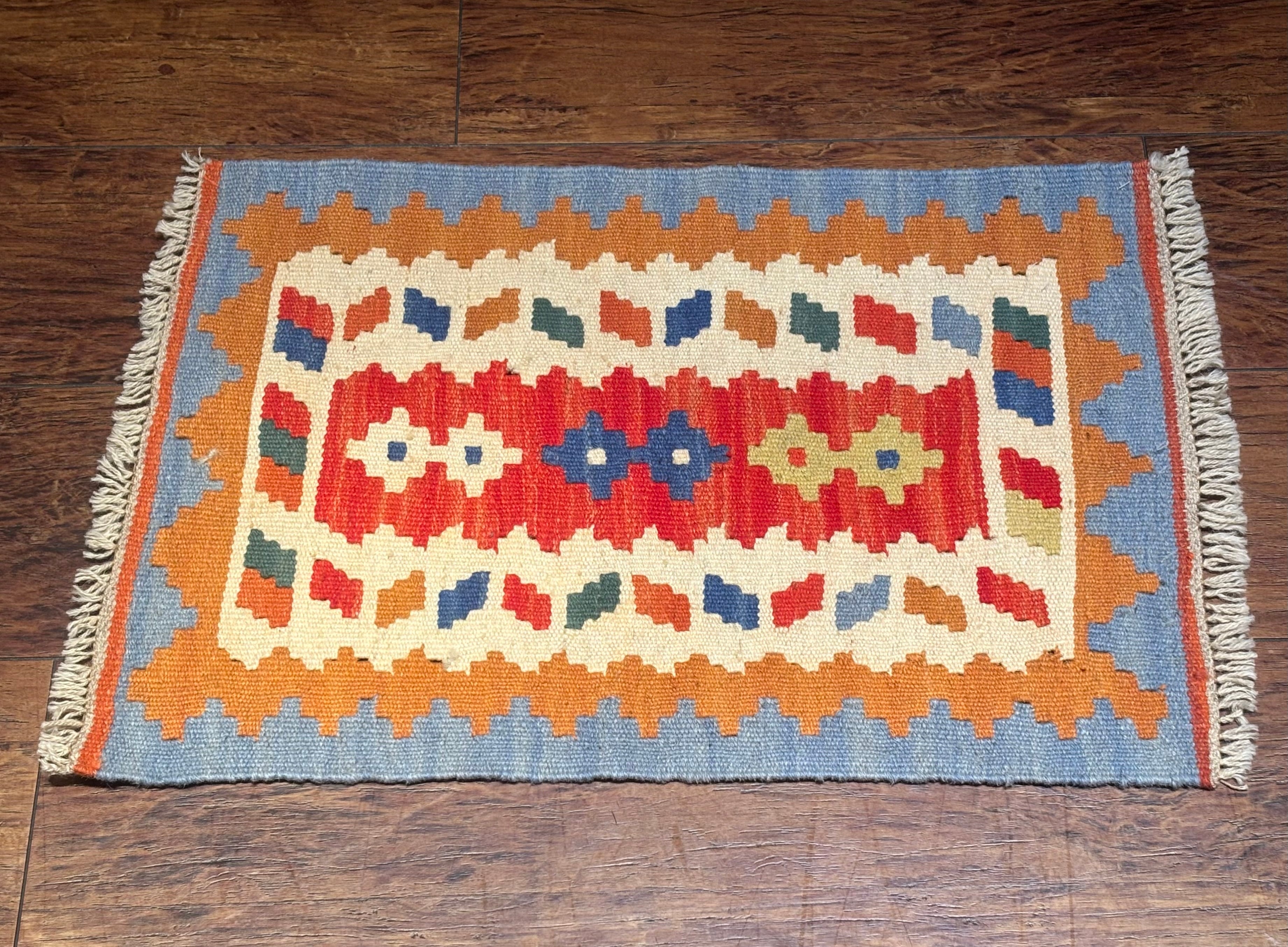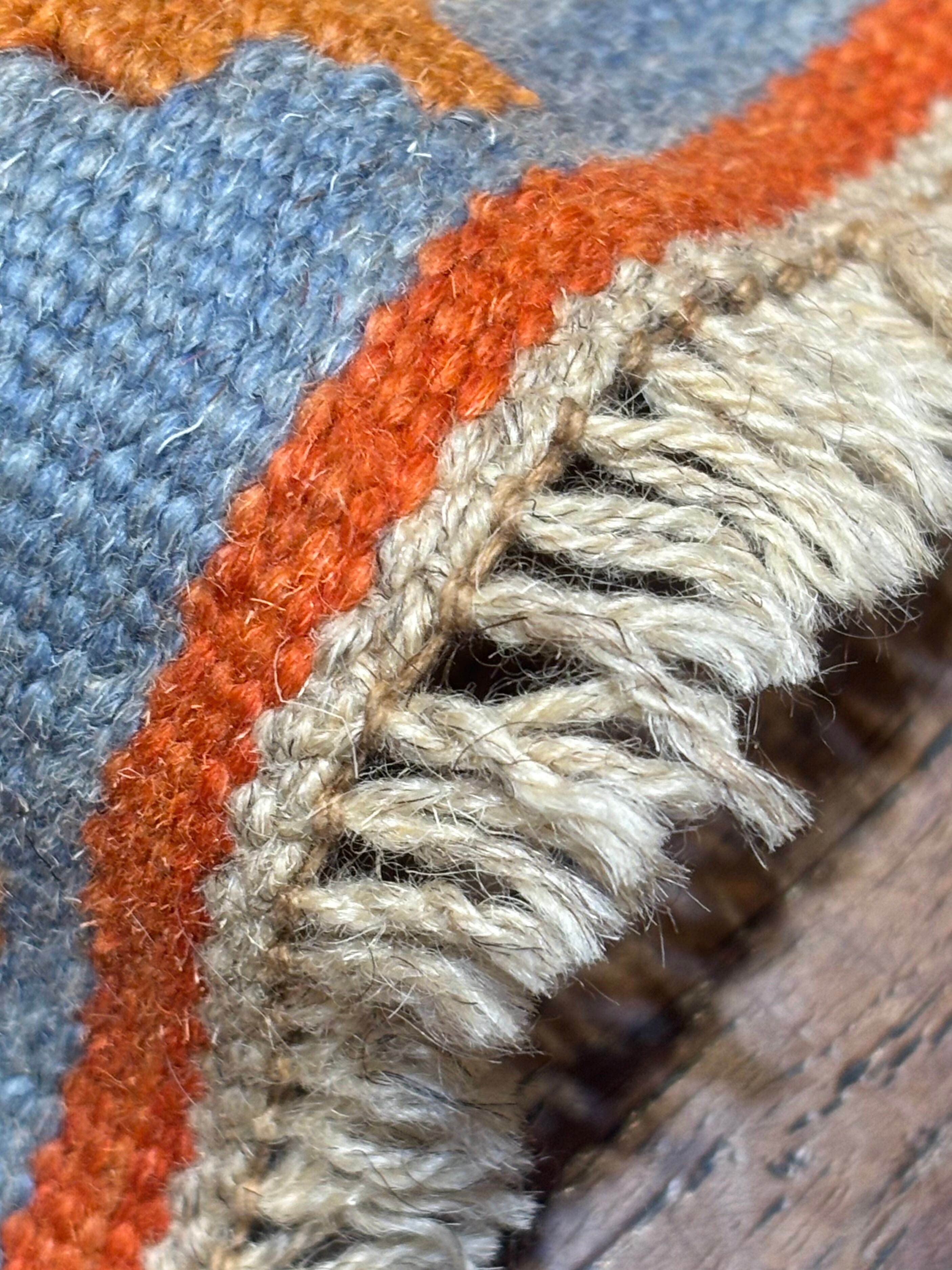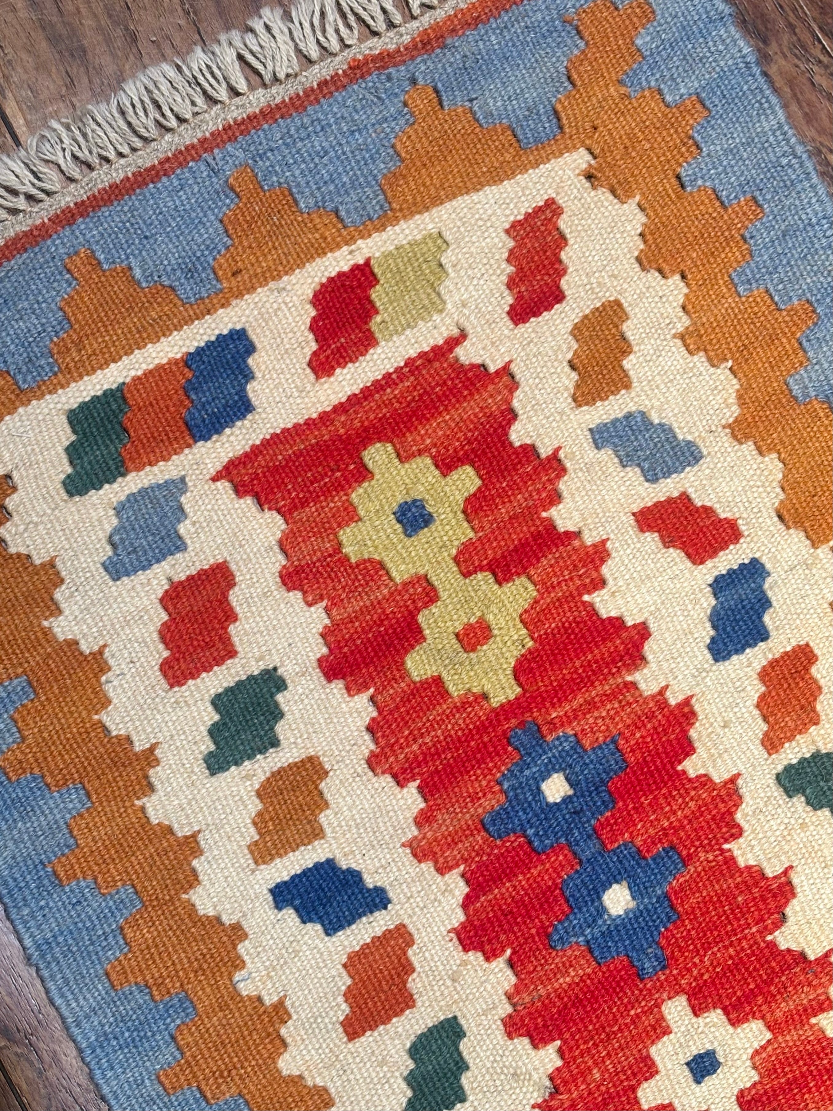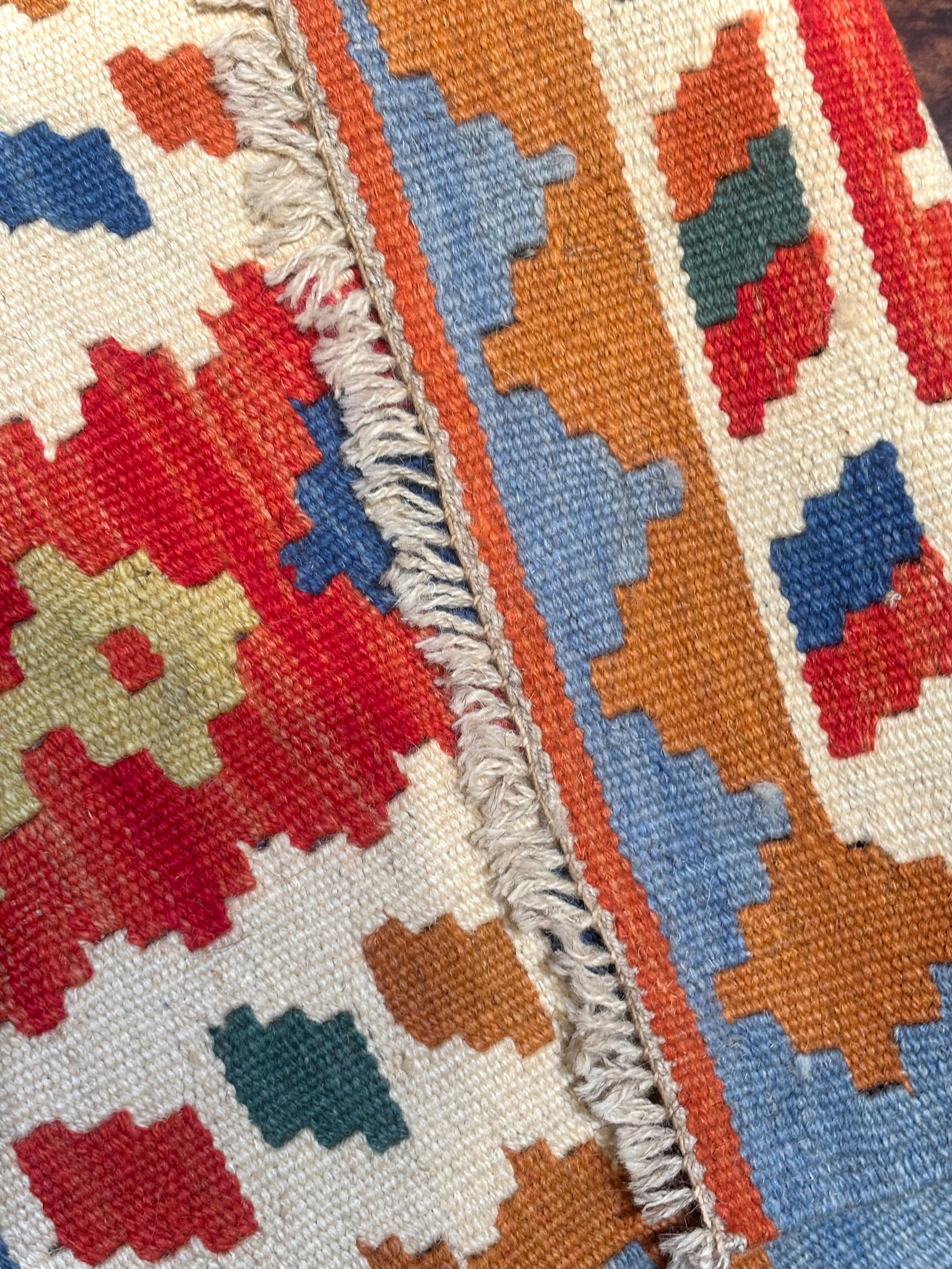 南西イラン・シーラーズ近郊で遊牧生活を営んできたことで知られる、カシュガイ族のキリムです。スタイリッシュなデザインですが、カシュガイ族に由来する伝統的な紋様と南イランらしい明るい色の組み合わせで織られています。デザインを構成する幾何学紋様は、遊牧生活の中で、厄除けや幸福への願いから生まれたものです。薄い織り上がりのキリムですが、ウールで織られているので床の冷たさを感じさせず、暑い季節でもスッキリとしたお使い心地で、オールシーズン活躍します。お玄関マットやベッドサイドとして、洗いやすいのでキッチンマットやワンちゃん、猫ちゃんのコーナーにもオススメです。両面お使いいただけます。