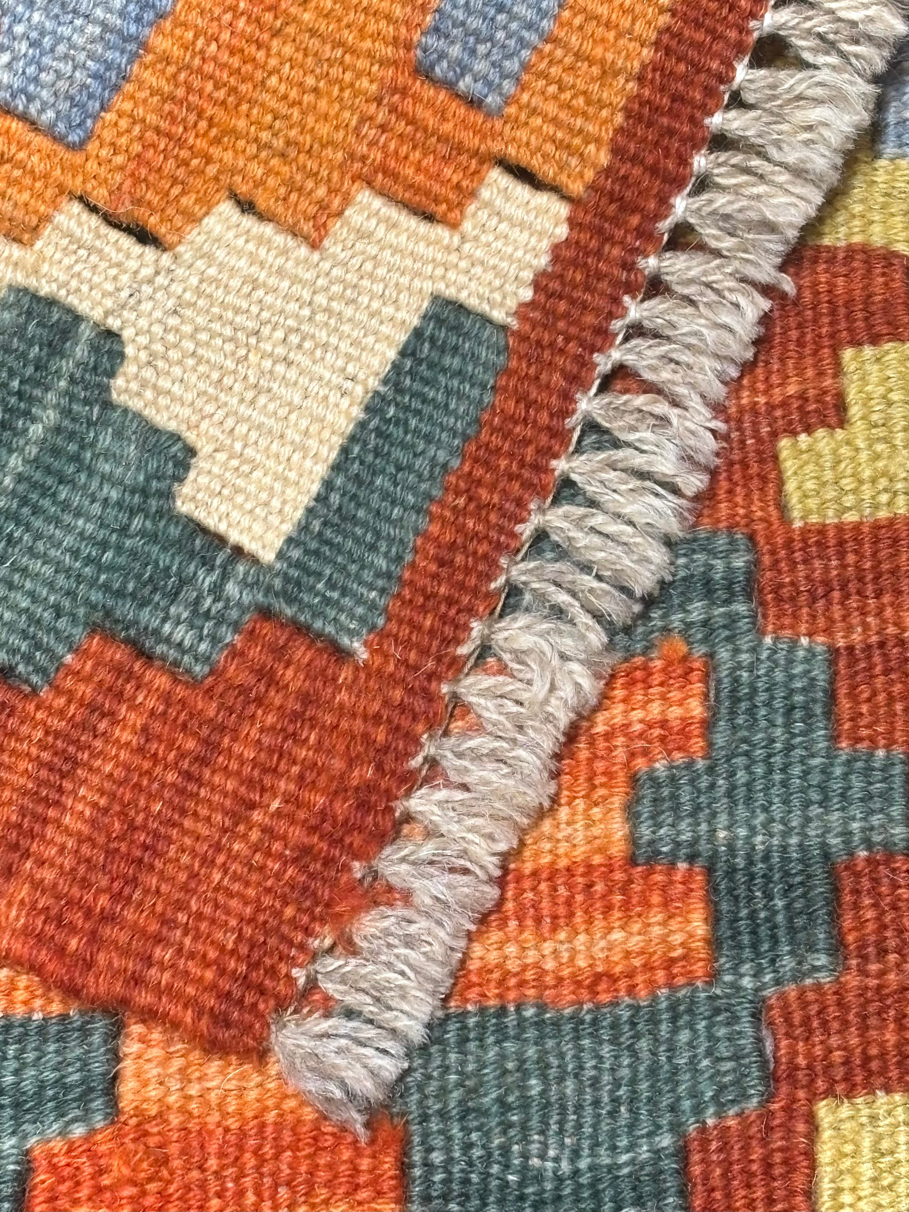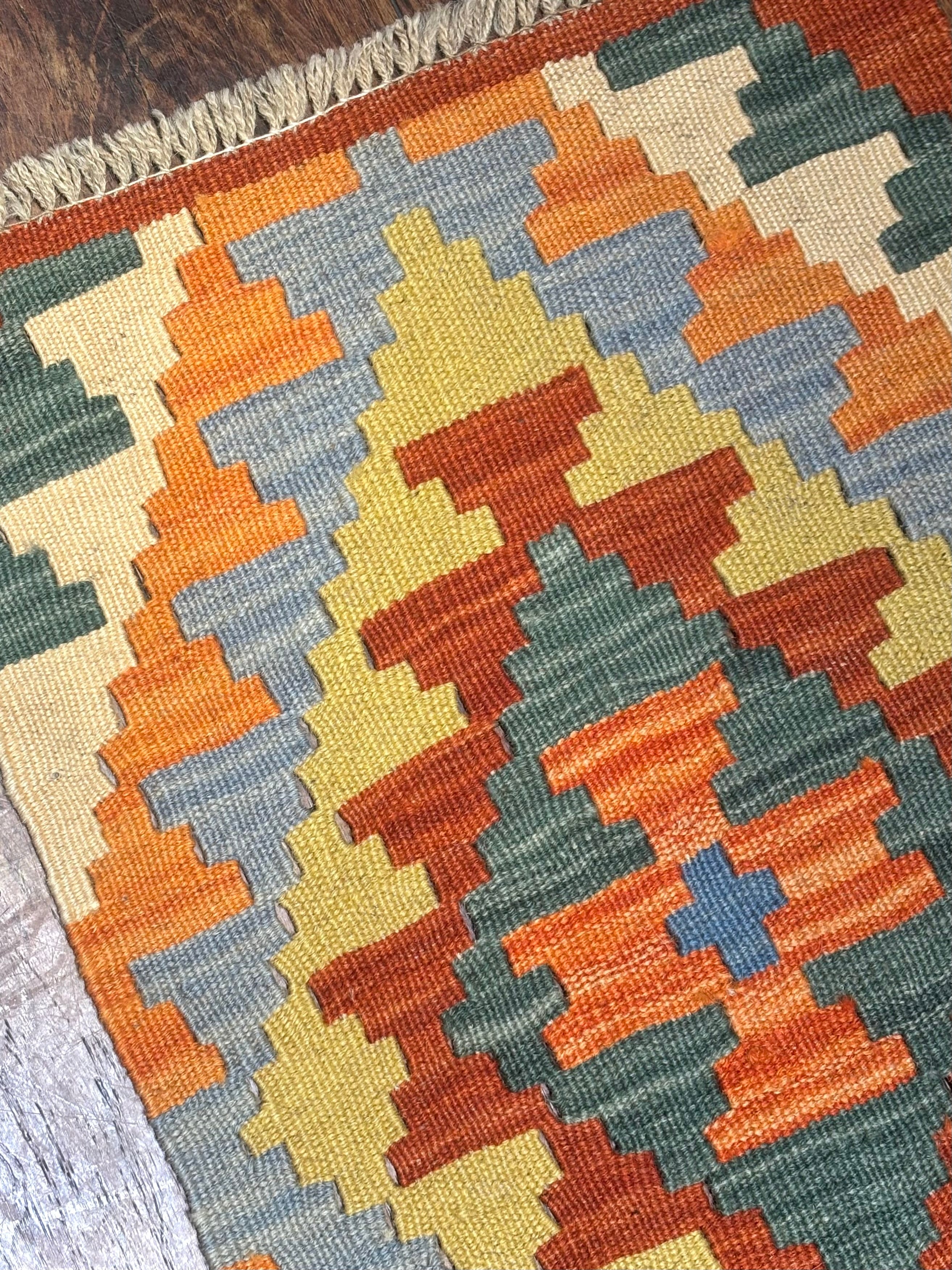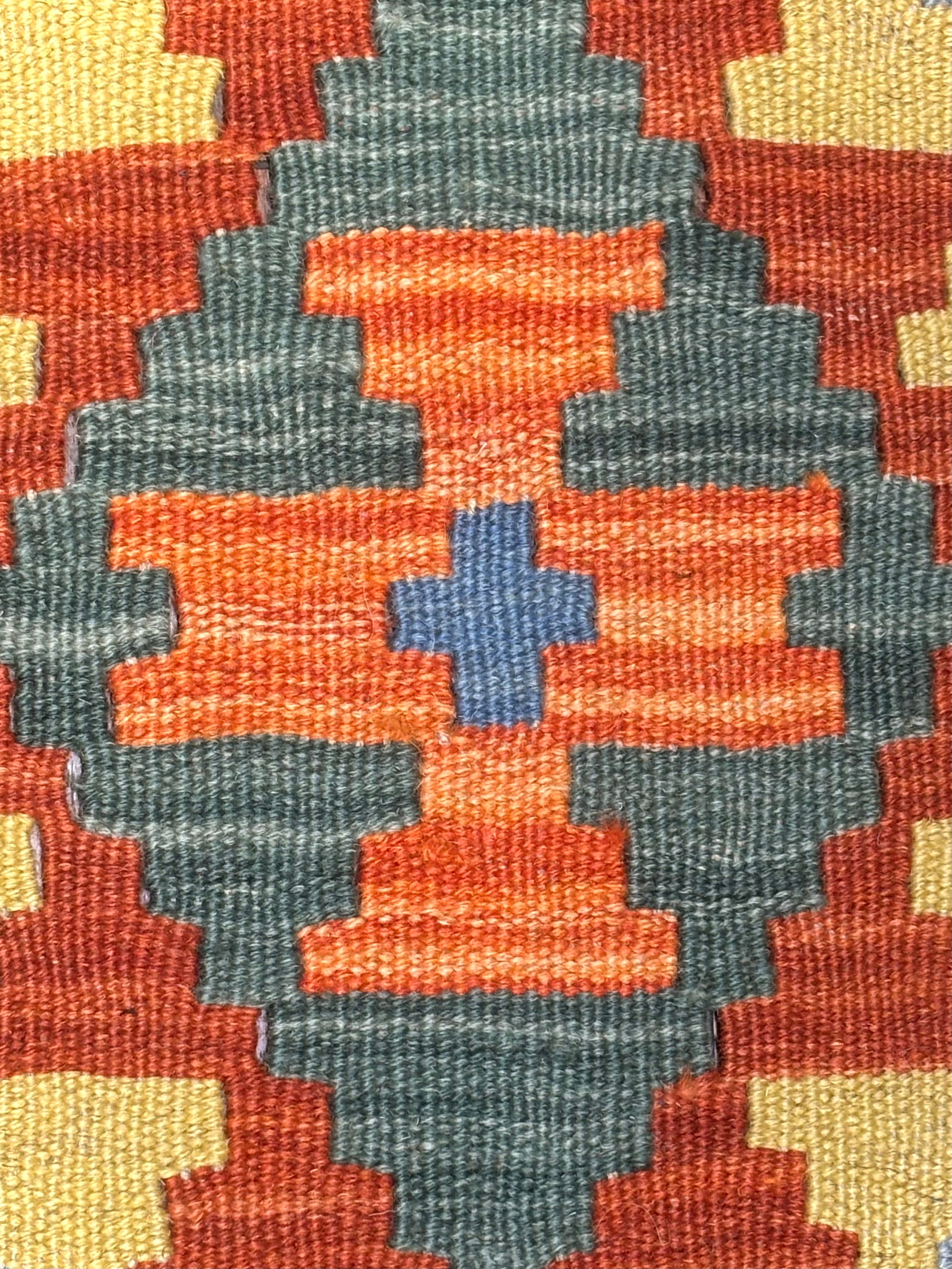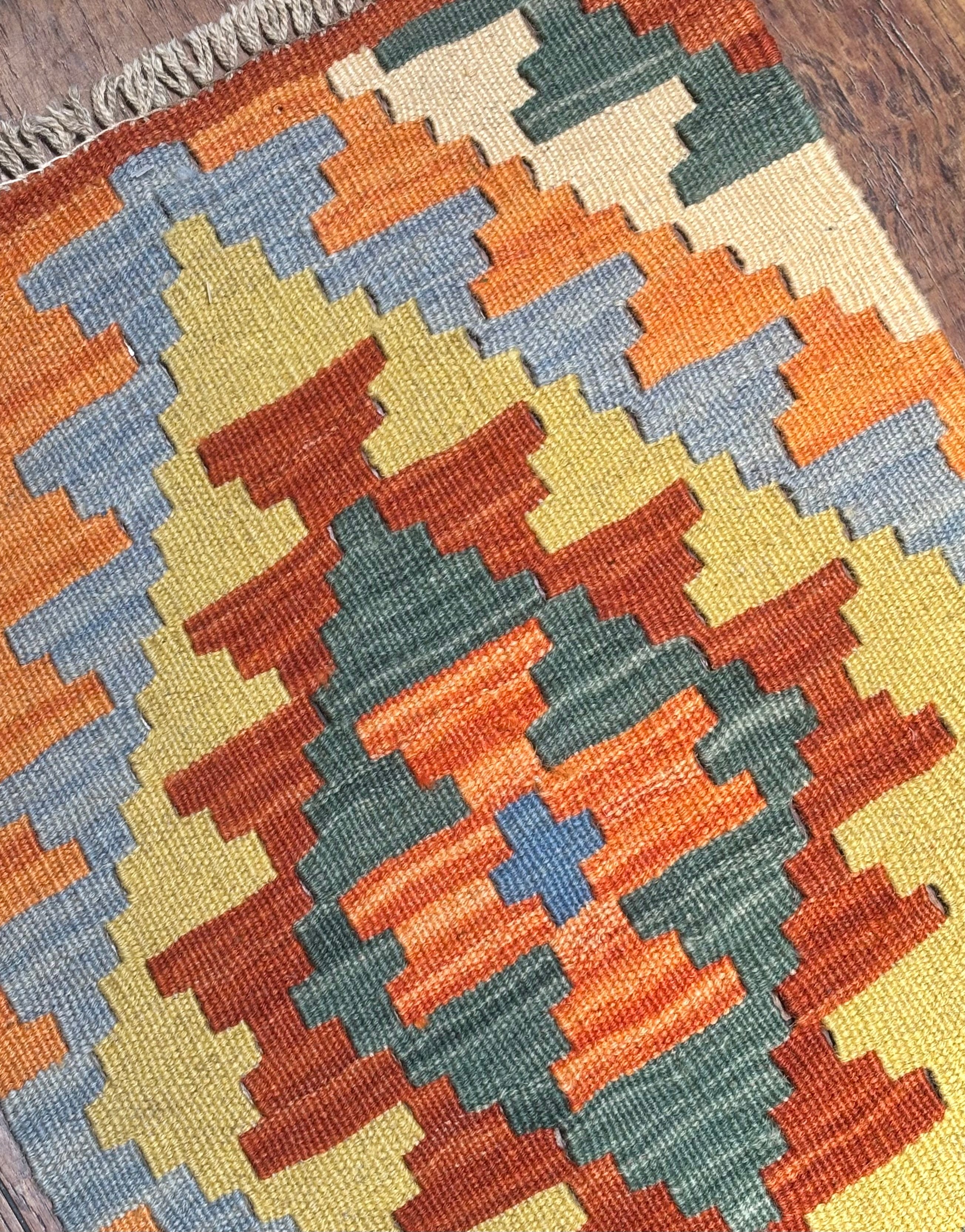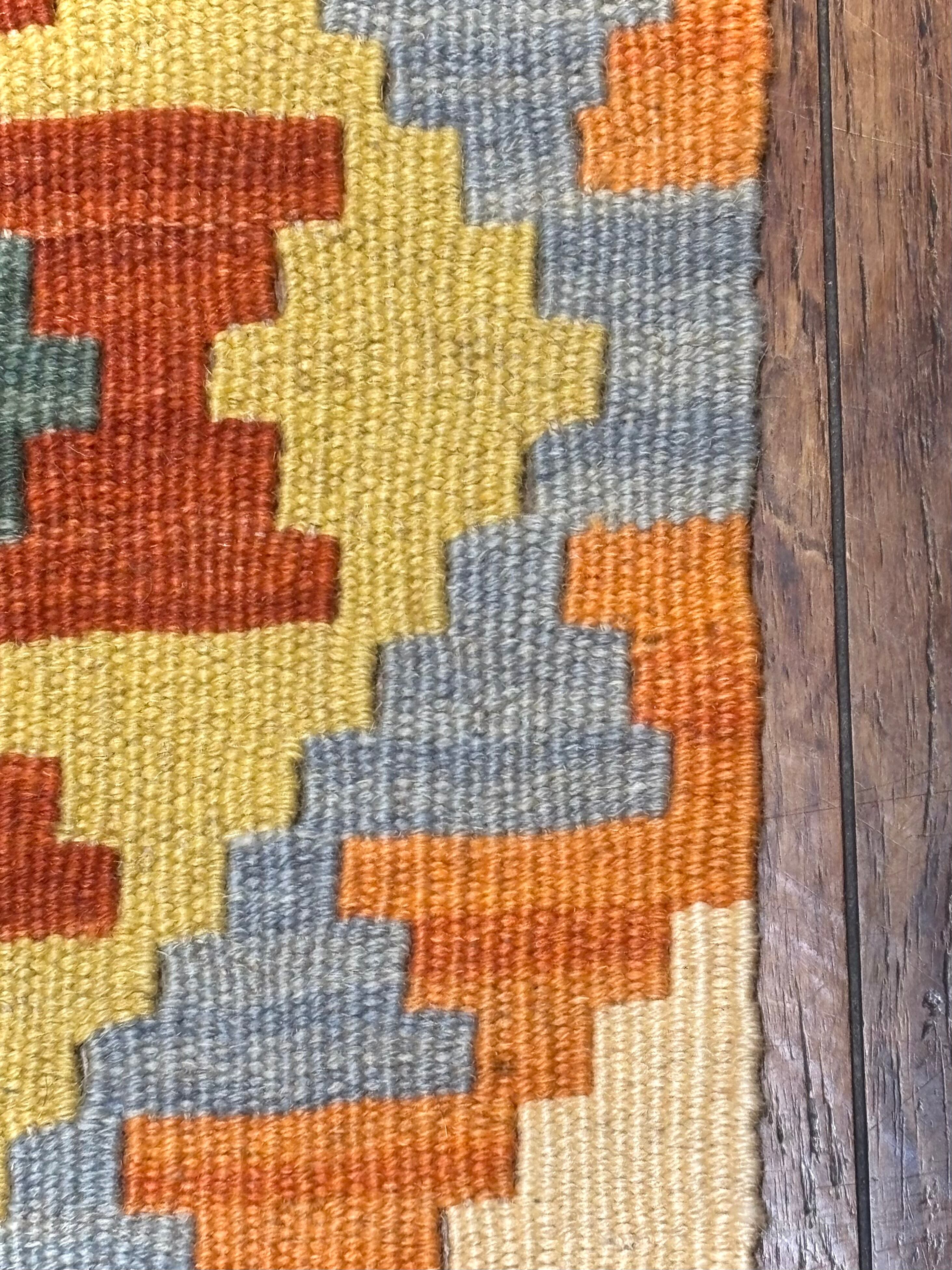 南西イラン・シーラーズ近郊で遊牧生活を営んできたことで知られる、カシュガイ族のキリムです。スタイリッシュなデザインですが、カシュガイ族に由来する伝統的な紋様と南イランらしい明るい色の組み合わせで織られています。デザインを構成する幾何学紋様は、遊牧生活の中で、厄除けや幸福への願いから生まれたものです。薄い織り上がりのキリムですが、ウールで織られているので床の冷たさを感じさせず、暑い季節でもスッキリとしたお使い心地で、オールシーズン活躍します。お玄関マットやベッドサイドとして、洗いやすいのでキッチンマットやワンちゃん、猫ちゃんのコーナーにもオススメです。両面お使いいただけます。