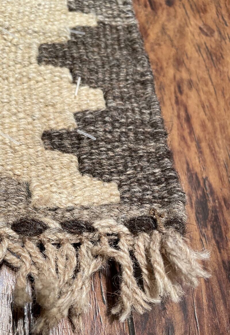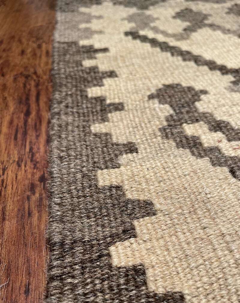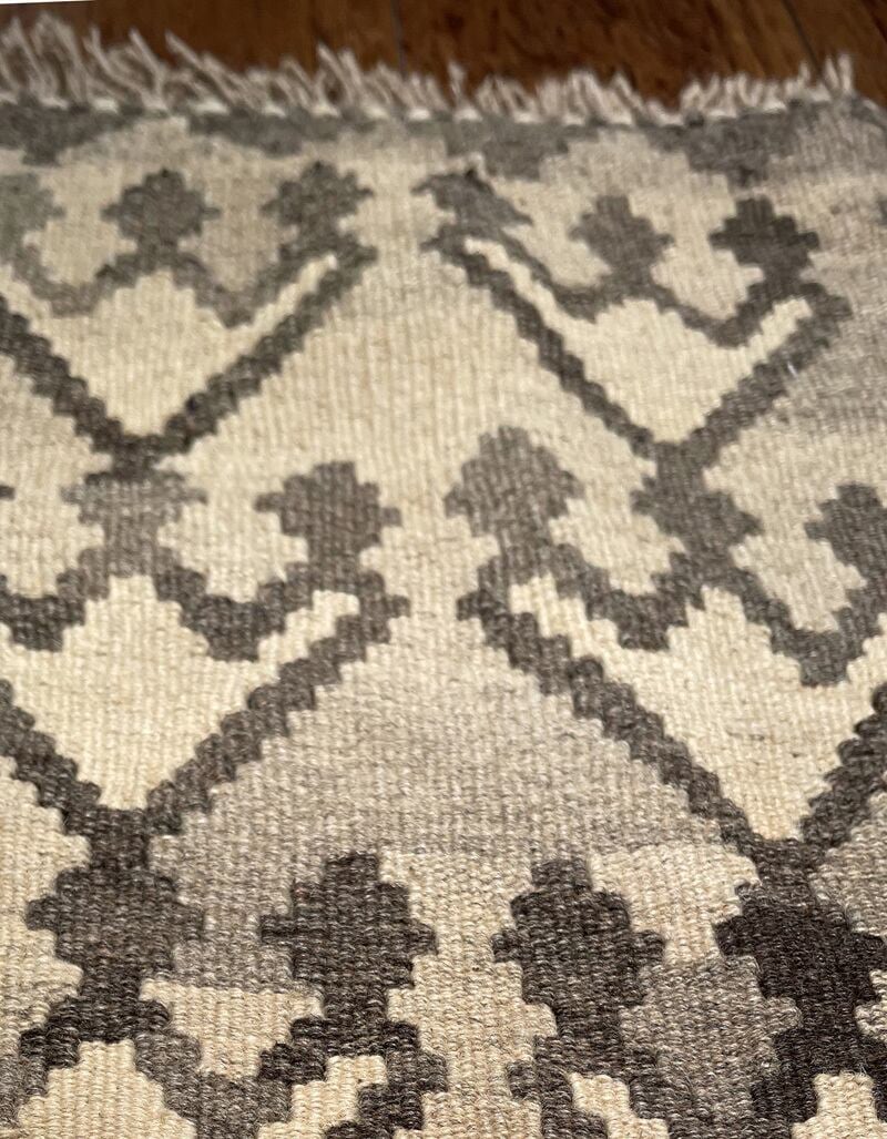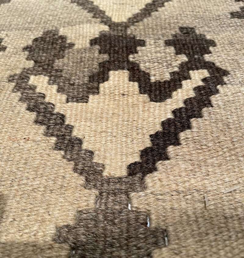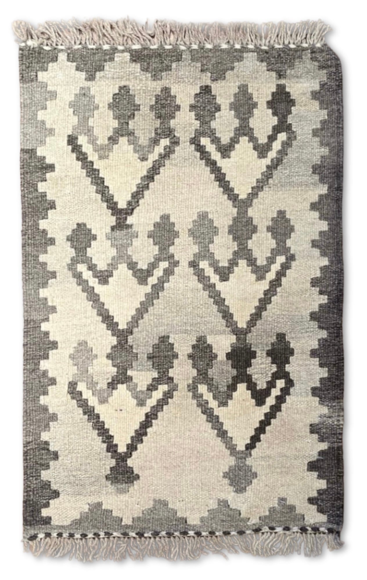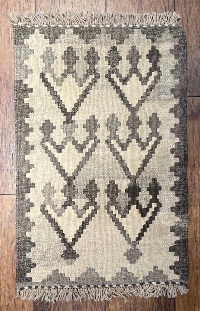 南西イラン・シーラーズ近郊で遊牧生活を営んできたことで知られる、カシュガイ族のキリムです。スタイリッシュなデザインですが、カシュガイ族に由来する伝統的な紋様で織られています。染色が一切施されていない、羊のオリジナルのお色のみで織られております。一見モダンな印象ながらも、素材特有の風合いや温もり感があります。デザインを構成する幾何学紋様は、遊牧生活の中で、厄除けや幸福への願いから生まれたものです。薄い織り上がりのキリムですが、ウールで織られているので床の冷たさを感じさせず、暑い季節でもスッキリとしたお使い心地で、オールシーズン活躍します。お玄関マットやベッドサイドとして、洗いやすいのでキッチンマットやワンちゃん、猫ちゃんのコーナーにもオススメです。両面お使いいただけます。