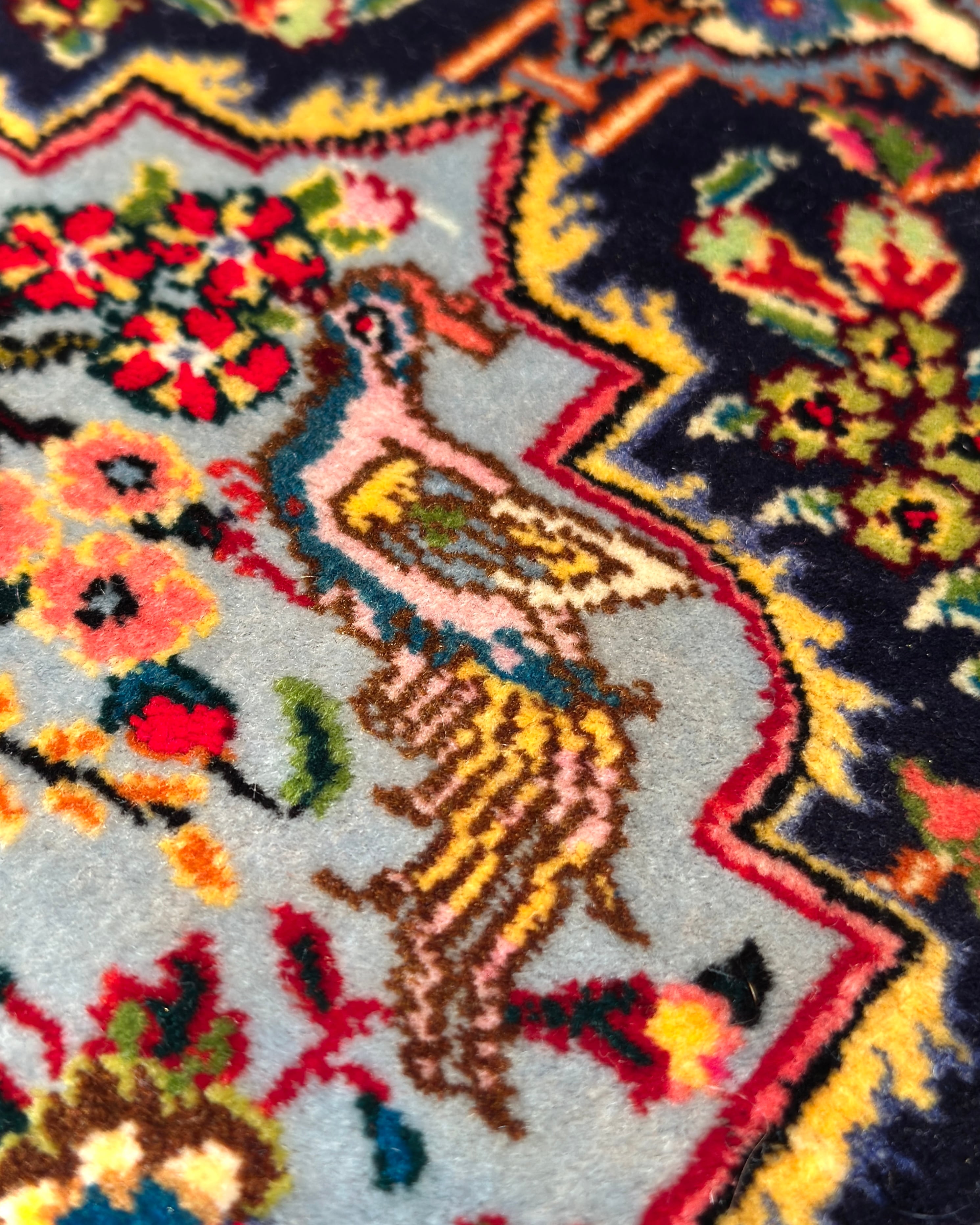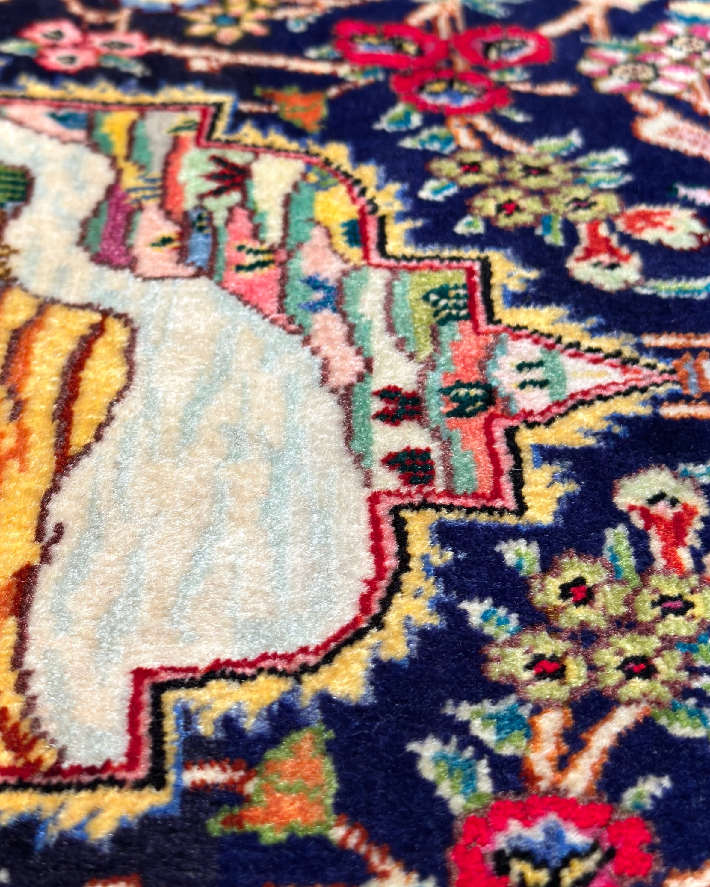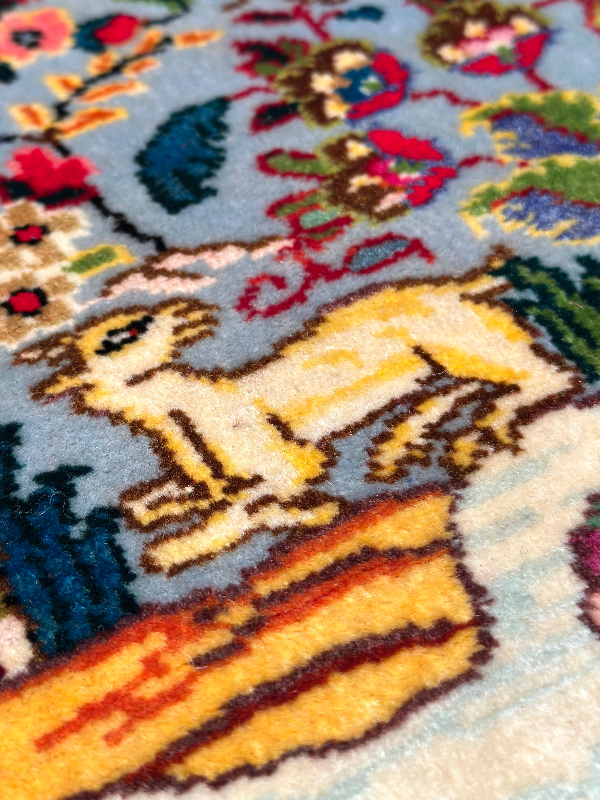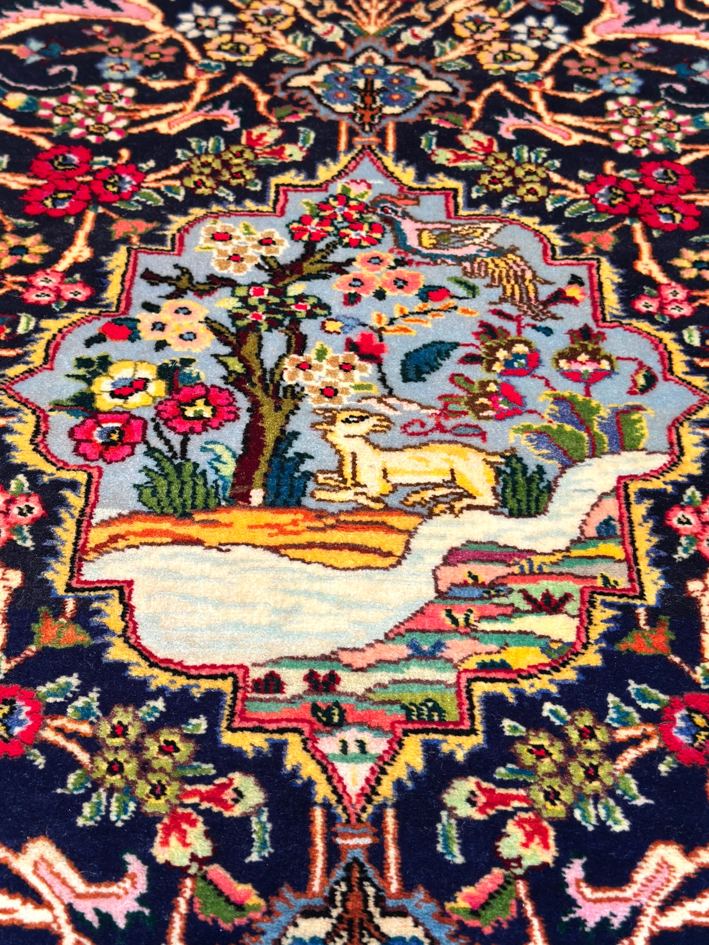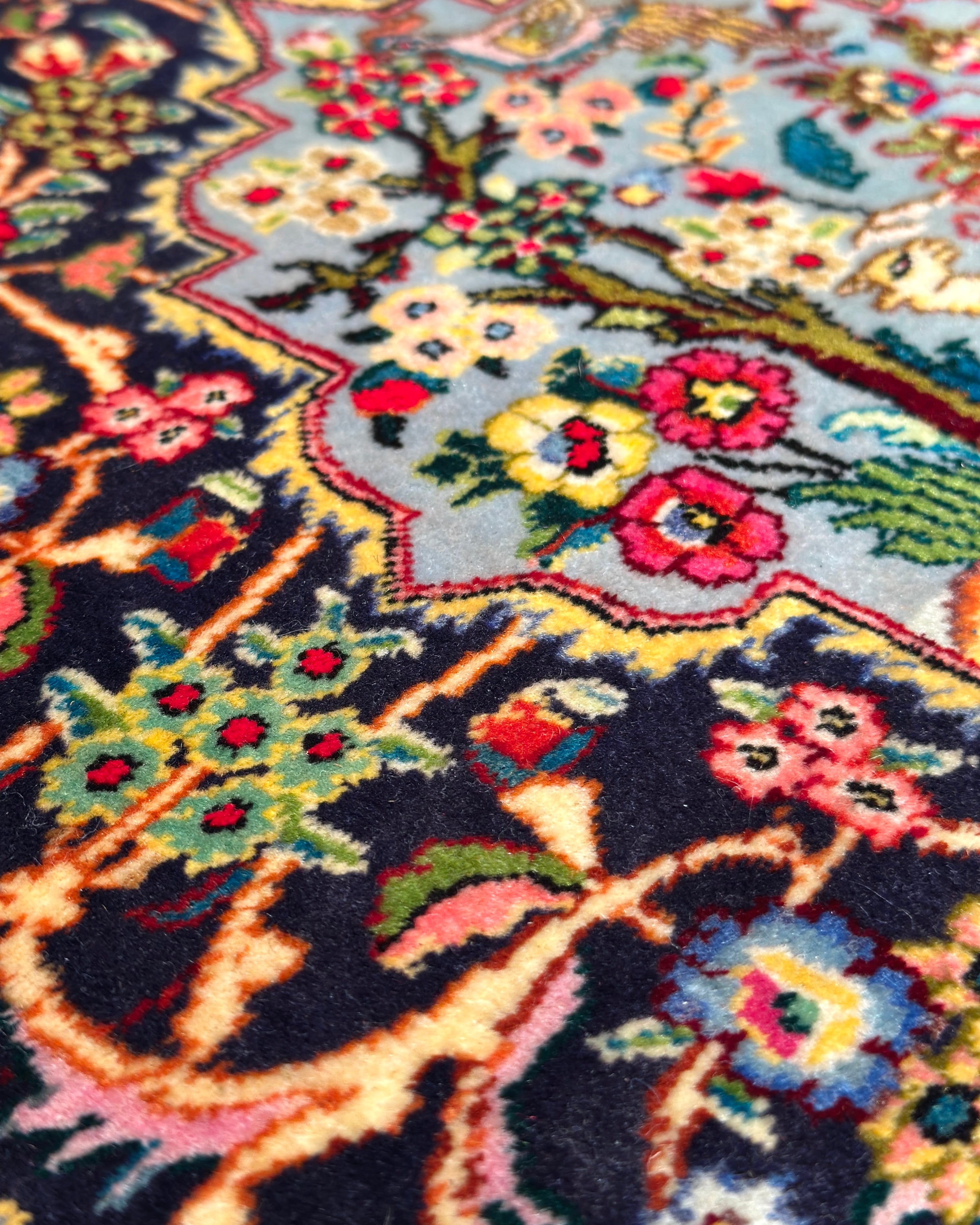 70年程前に織られたタブリーズ産のオールド絨毯です。中央には寛ぐ鹿と孔雀の美しい姿がメダリオン型の額の中に収められ、静かなオアシスのワンシーンを覗いているかのよう。中でも、その傍らを流れる『小川』の表現には目を見張るものがあり、光を反射する水面までも見事な『艶』で再現されていますが、実はこちらはシルクではなく『ウールのみ』で織り上げられています。深みのあるシックな藍色の上を、踊るように展開していく優美な唐草模様〜その間に咲き誇る色も形も異なる花々は、まるで「真夜中の花畑」に迷い込んだかのような幻想的なオーラを放ちます。タペストリーやお玄関マット / ベッドサイドで心ゆくまで眺めて頂きたい逸品です。