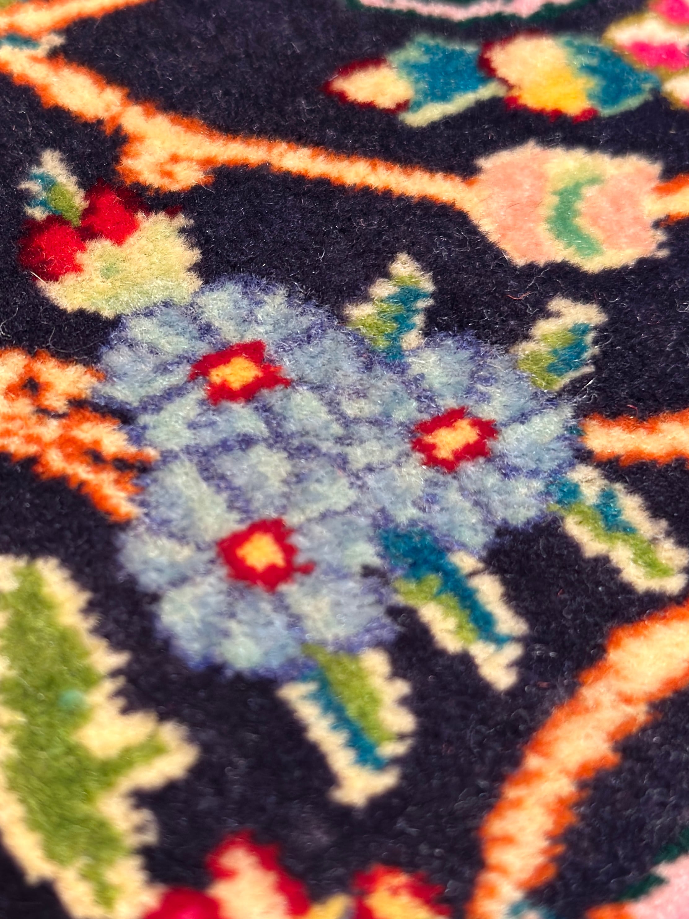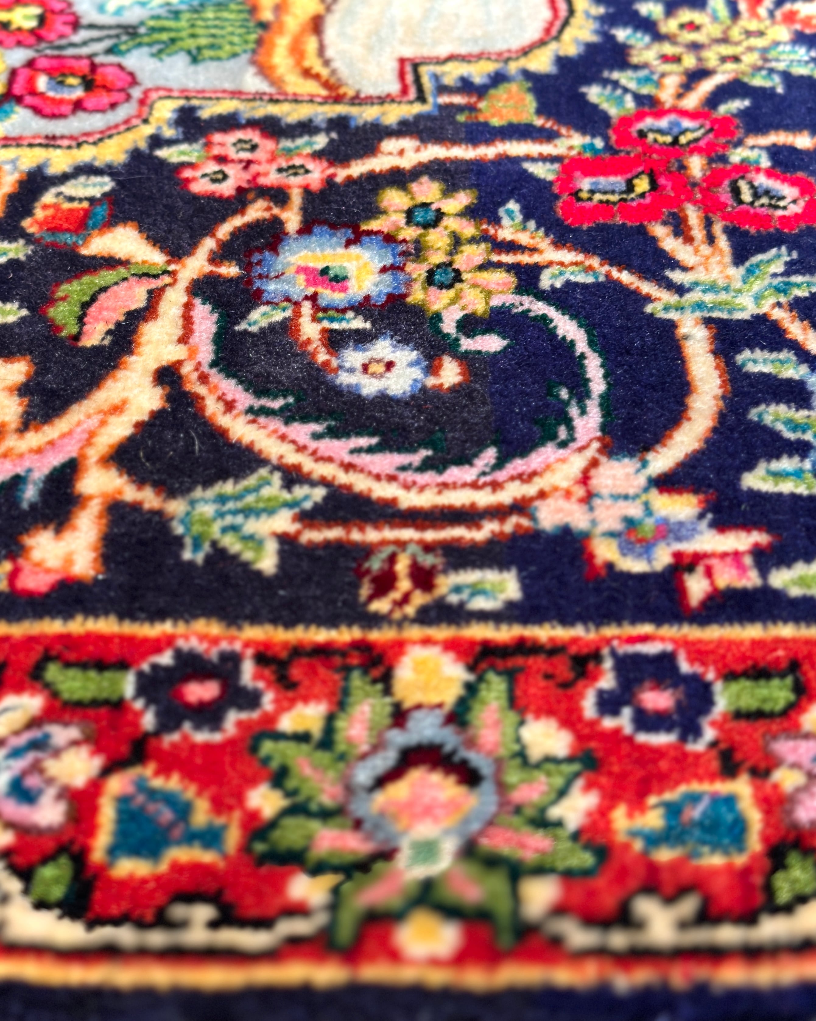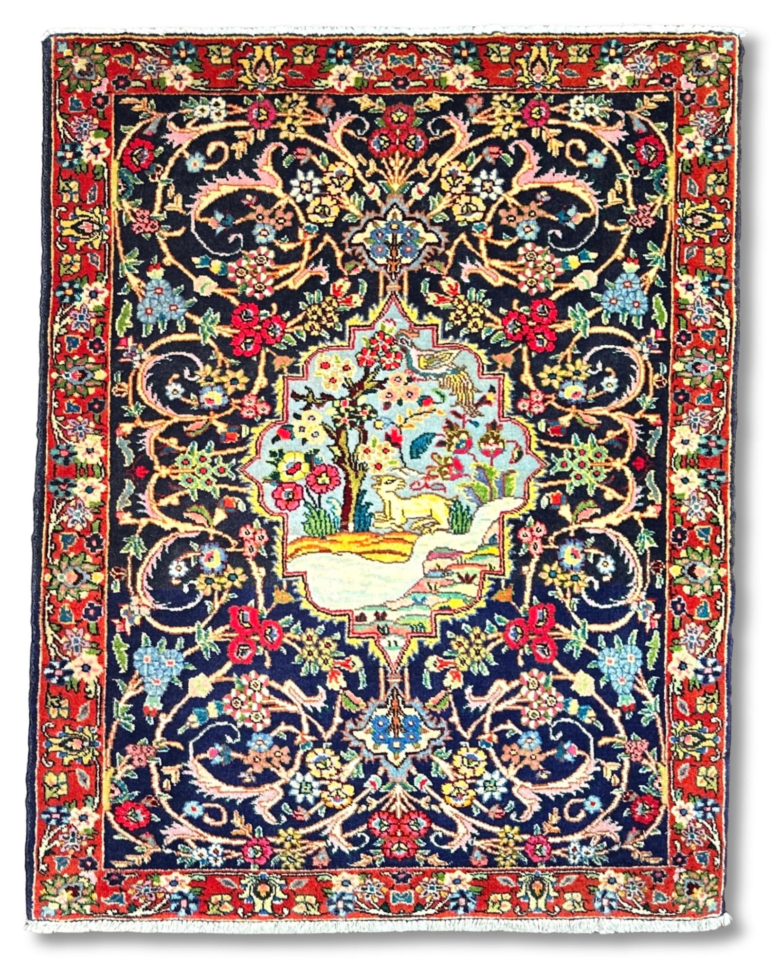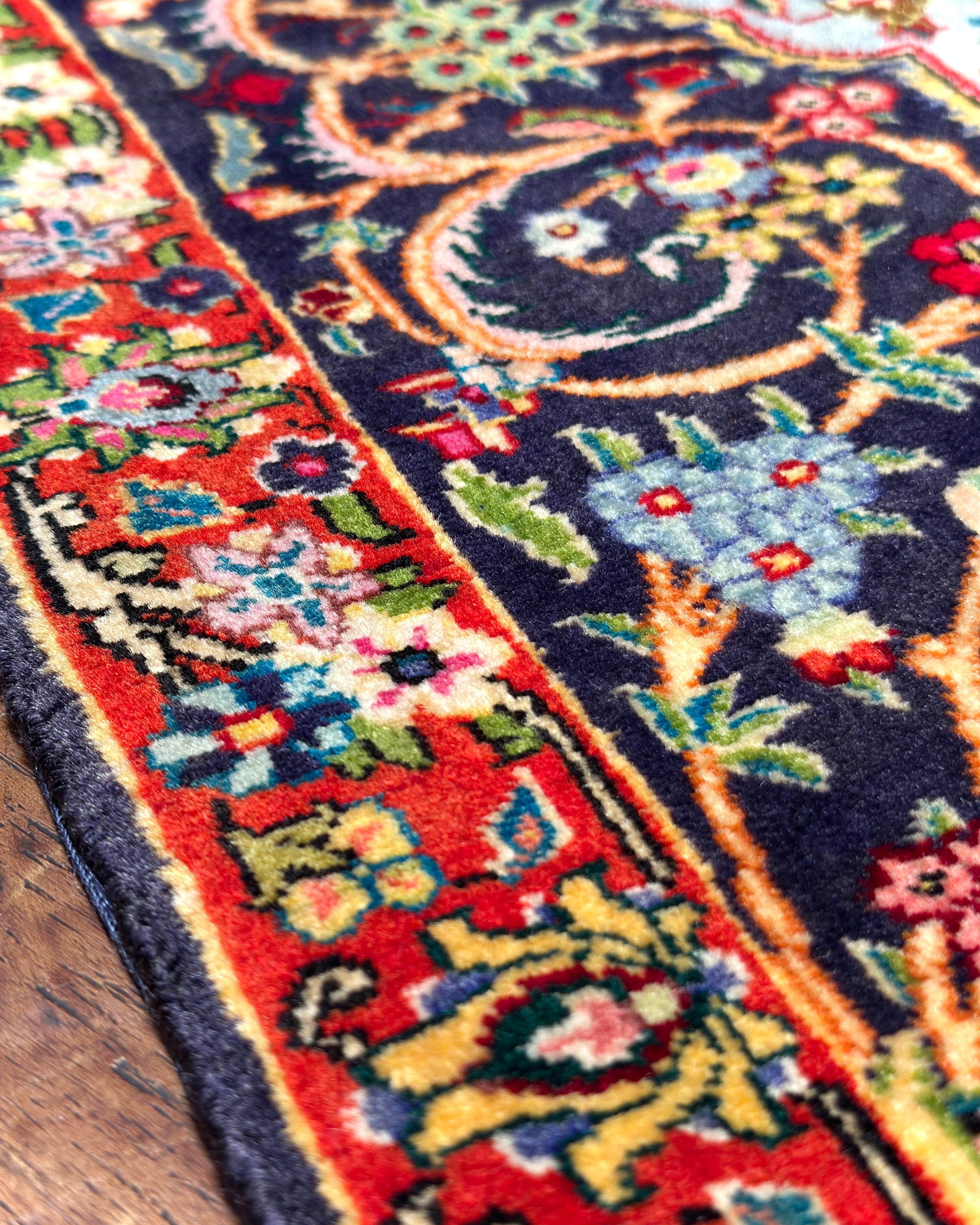 70年程前に織られたタブリーズ産のオールド絨毯です。中央には寛ぐ鹿と孔雀の美しい姿がメダリオン型の額の中に収められ、静かなオアシスのワンシーンを覗いているかのよう。中でも、その傍らを流れる『小川』の表現には目を見張るものがあり、光を反射する水面までも見事な『艶』で再現されていますが、実はこちらはシルクではなく『ウールのみ』で織り上げられています。深みのあるシックな藍色の上を、踊るように展開していく優美な唐草模様〜その間に咲き誇る色も形も異なる花々は、まるで「真夜中の花畑」に迷い込んだかのような幻想的なオーラを放ちます。タペストリーやお玄関マット / ベッドサイドで心ゆくまで眺めて頂きたい逸品です。