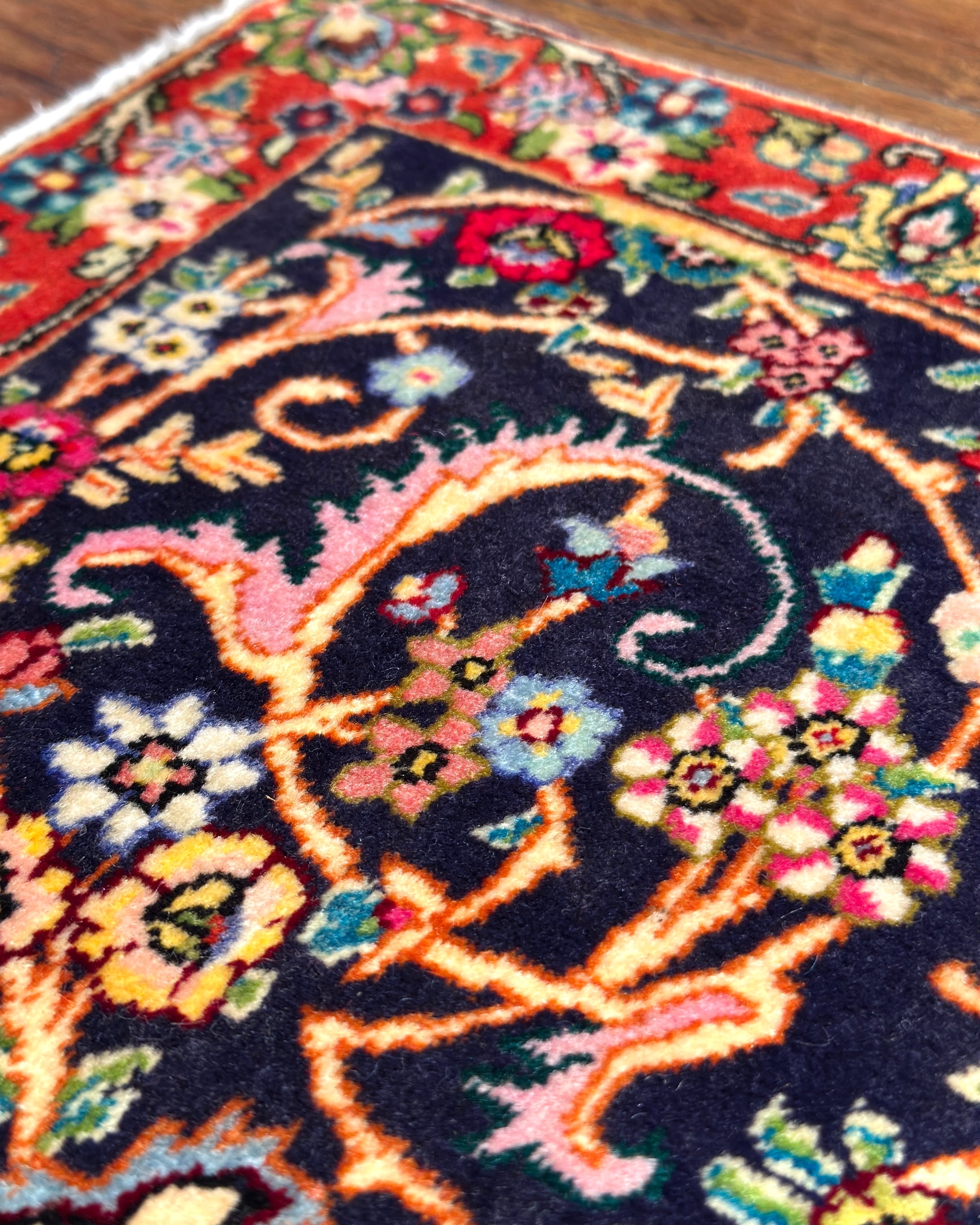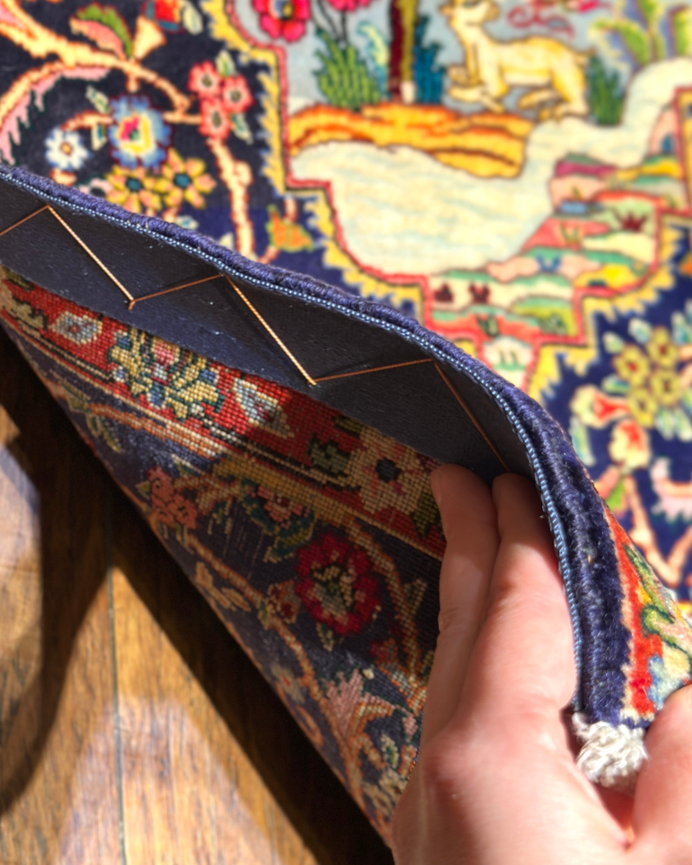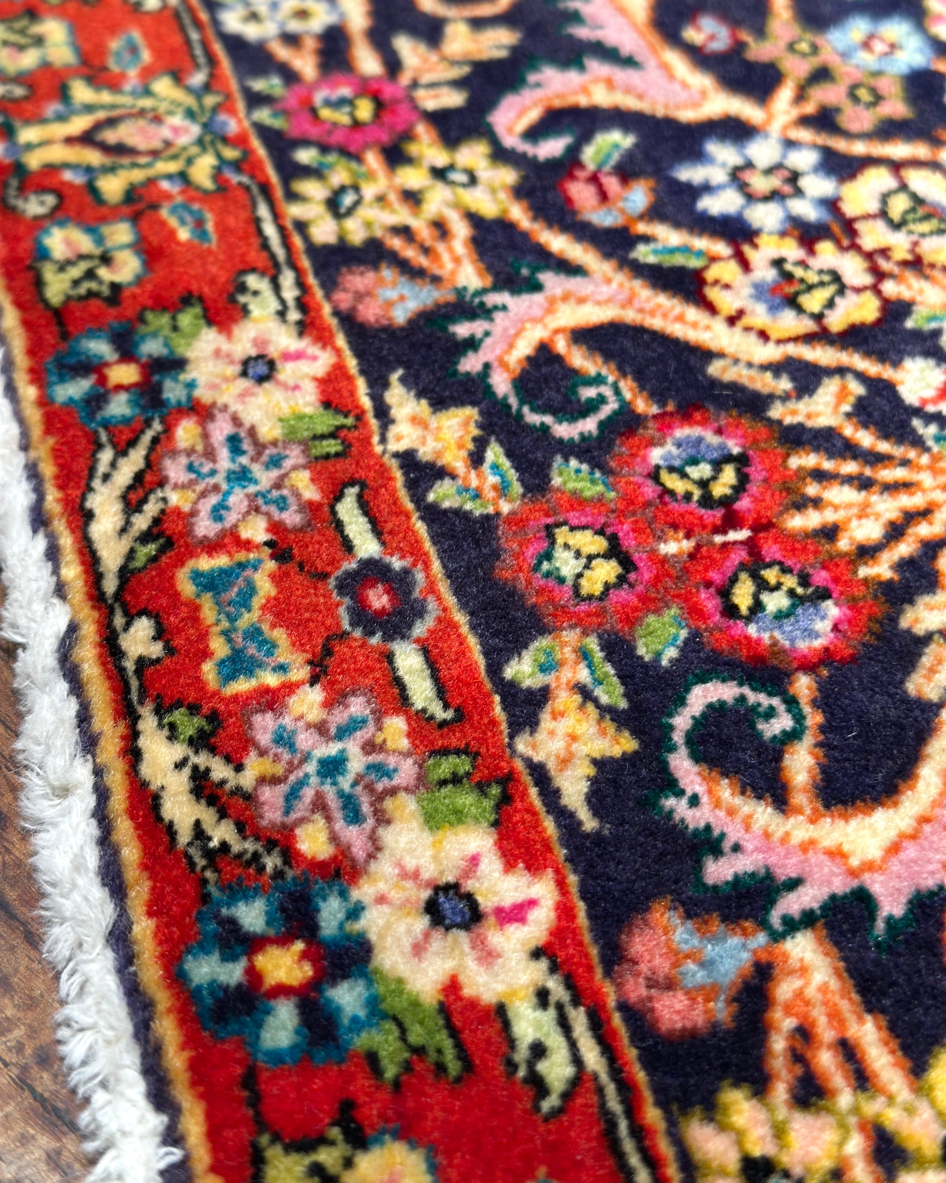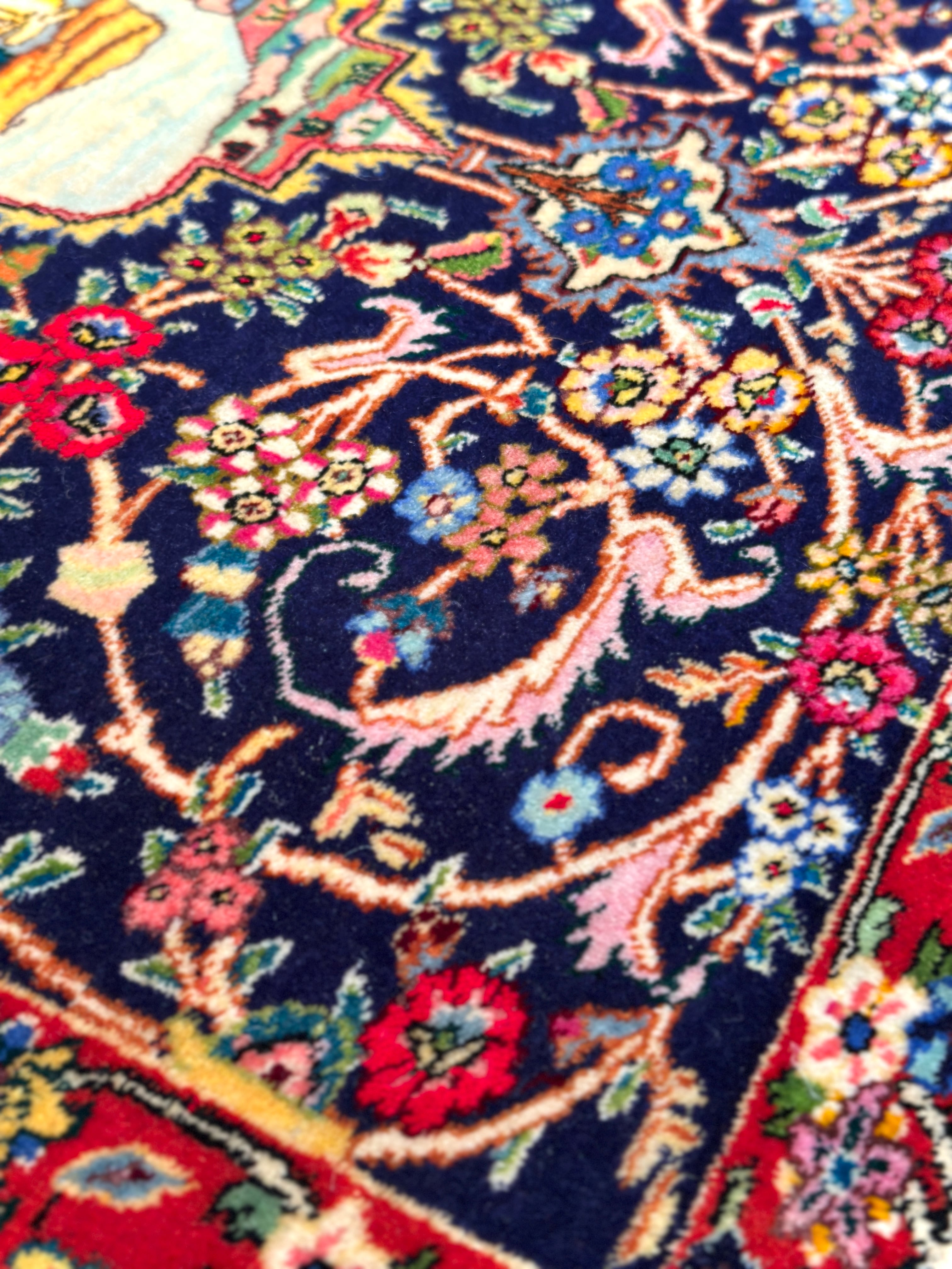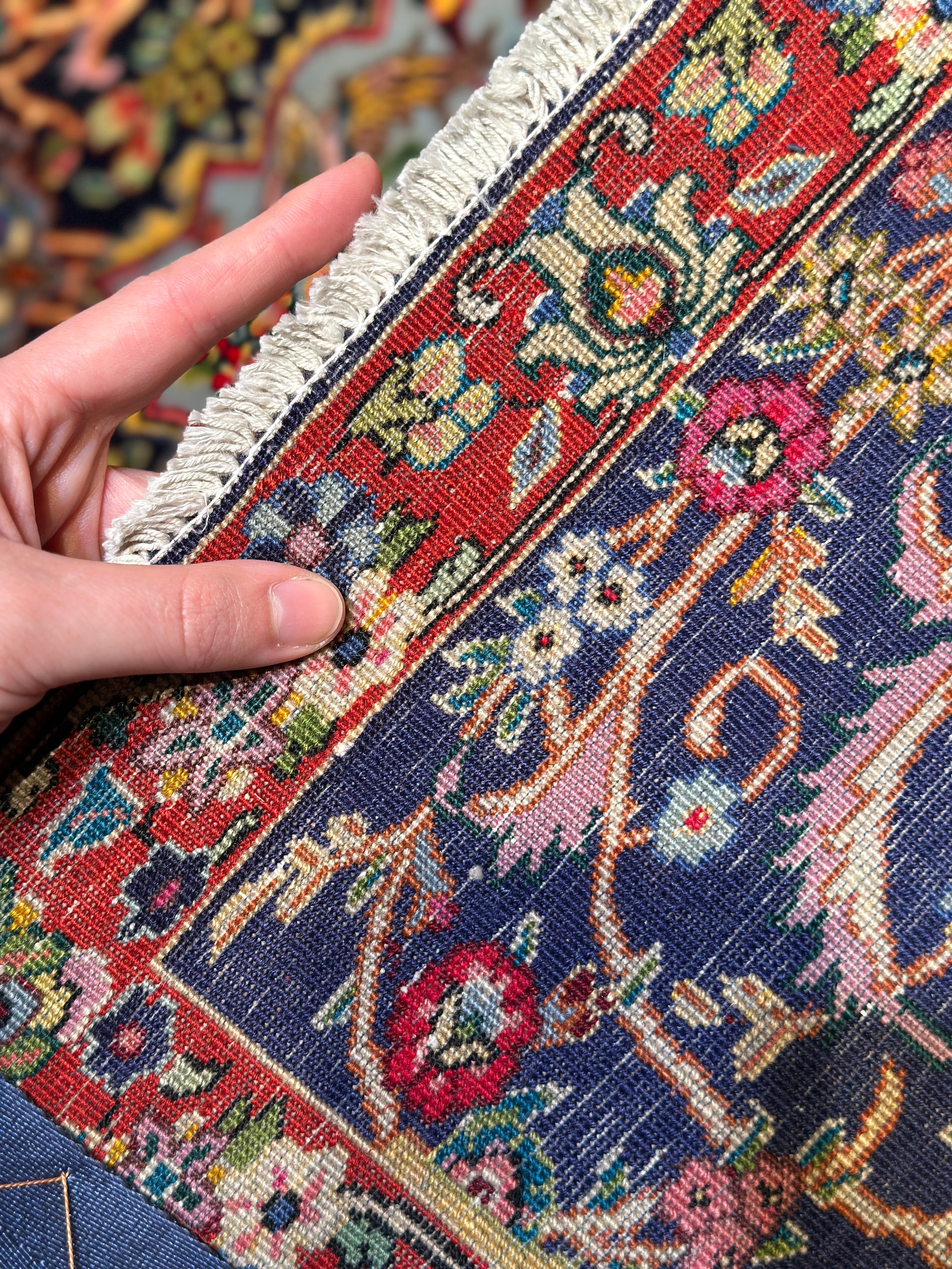 70年程前に織られたタブリーズ産のオールド絨毯です。中央には寛ぐ鹿と孔雀の美しい姿がメダリオン型の額の中に収められ、静かなオアシスのワンシーンを覗いているかのよう。中でも、その傍らを流れる『小川』の表現には目を見張るものがあり、光を反射する水面までも見事な『艶』で再現されていますが、実はこちらはシルクではなく『ウールのみ』で織り上げられています。深みのあるシックな藍色の上を、踊るように展開していく優美な唐草模様〜その間に咲き誇る色も形も異なる花々は、まるで「真夜中の花畑」に迷い込んだかのような幻想的なオーラを放ちます。タペストリーやお玄関マット / ベッドサイドで心ゆくまで眺めて頂きたい逸品です。