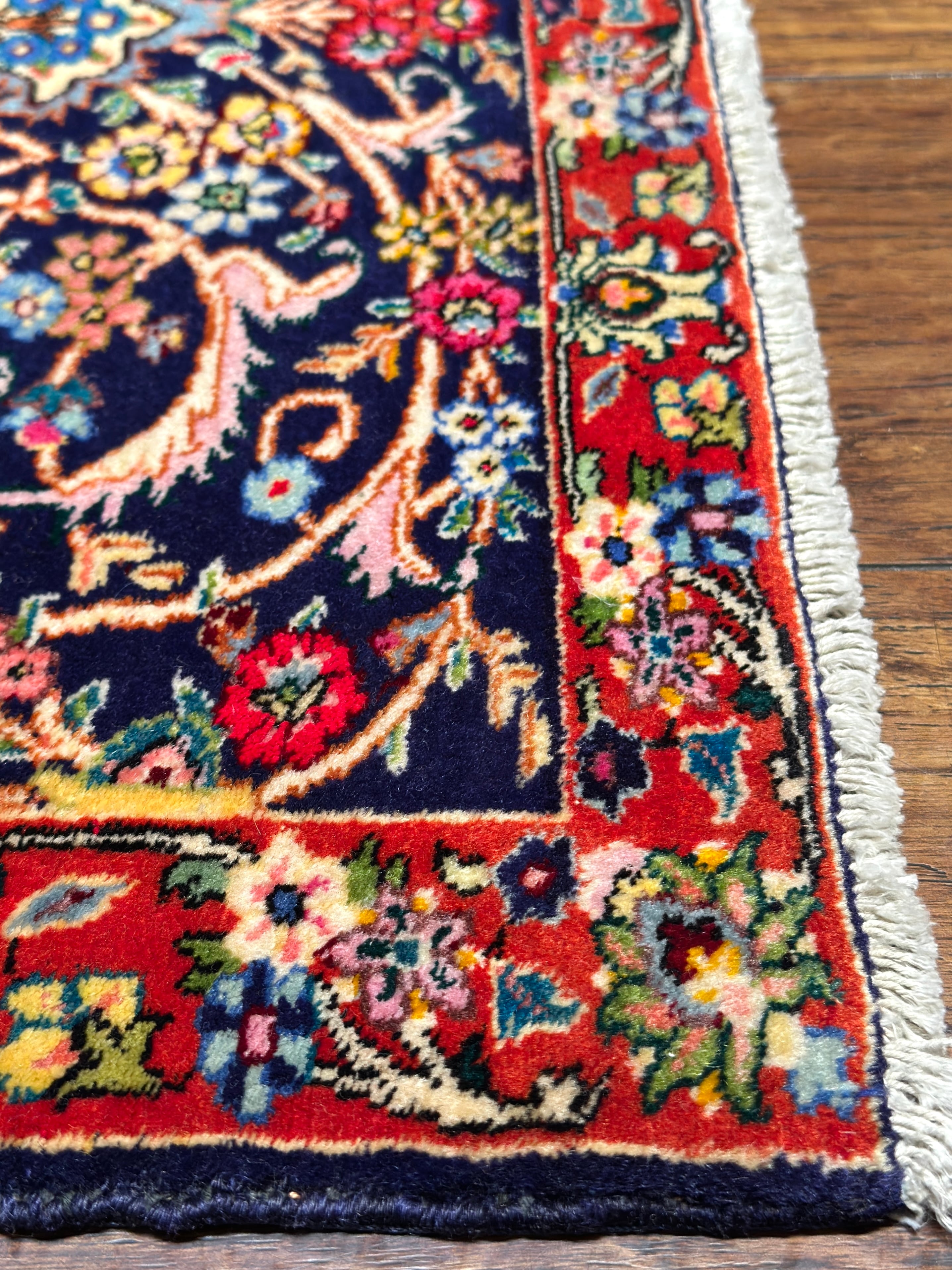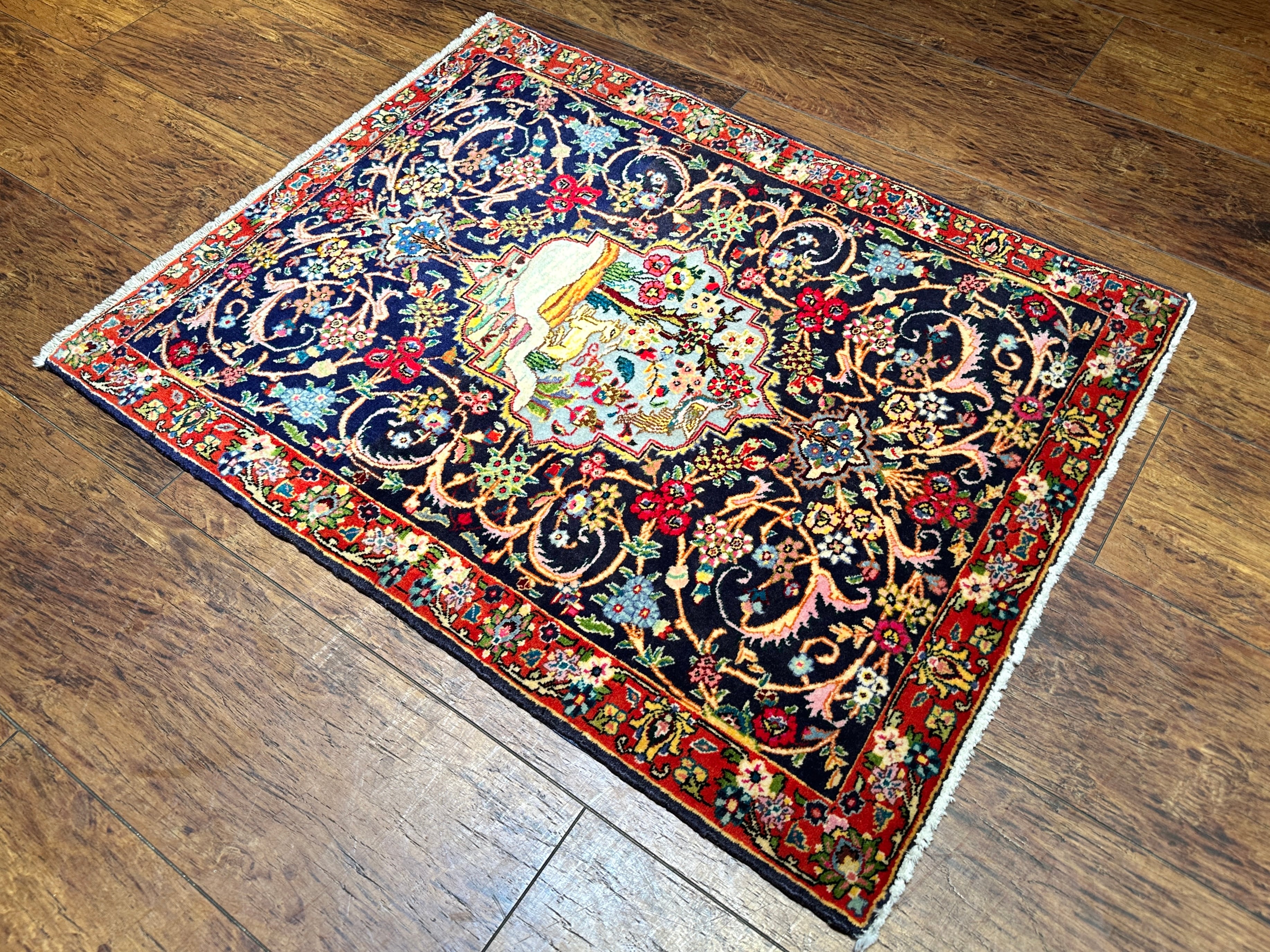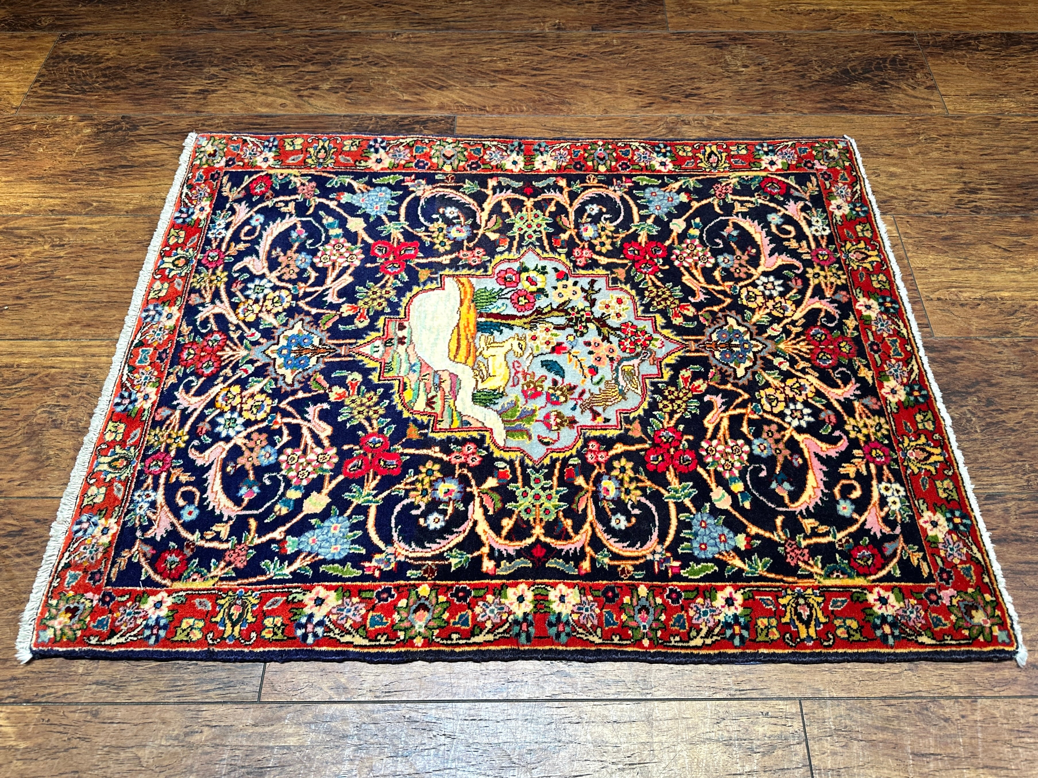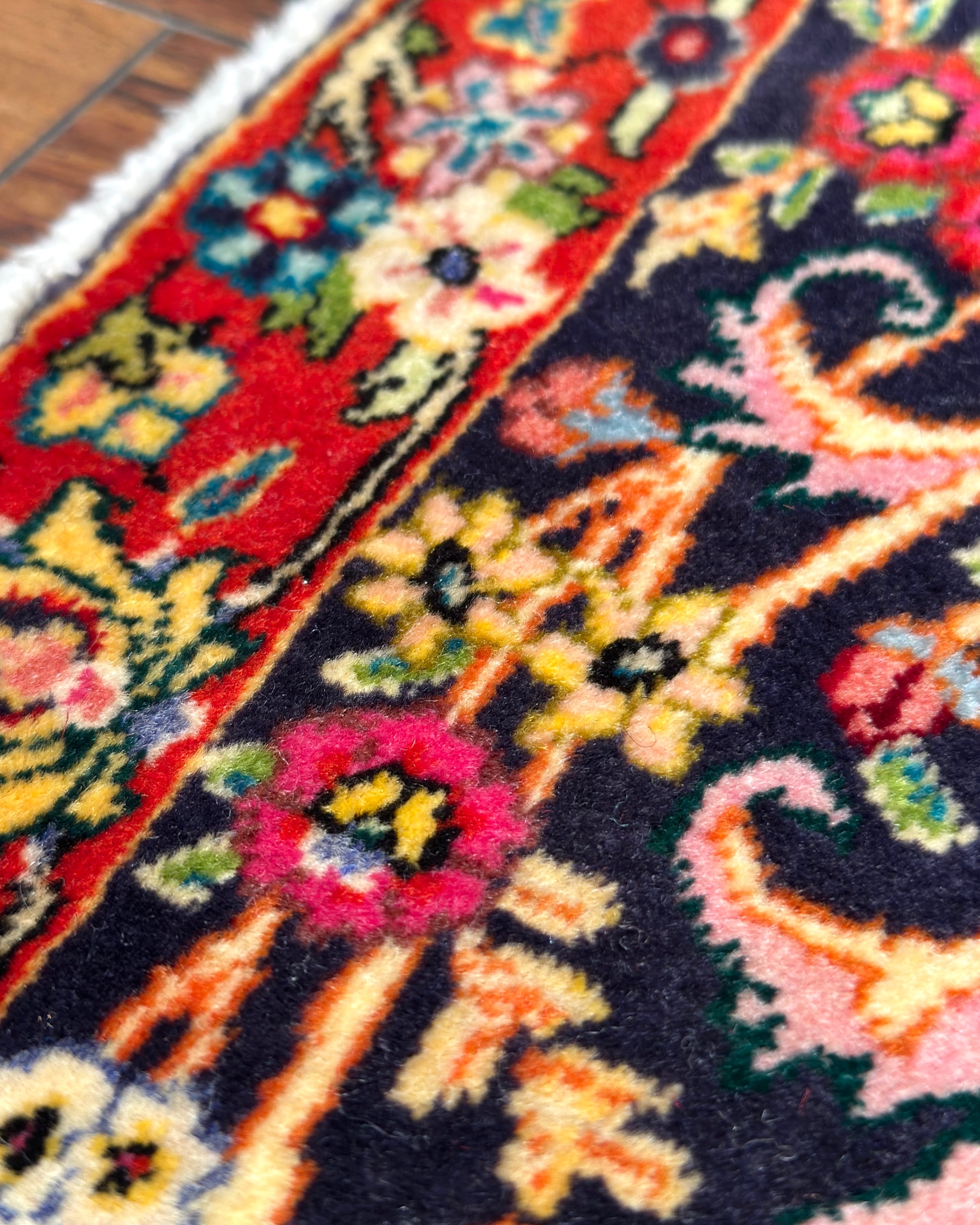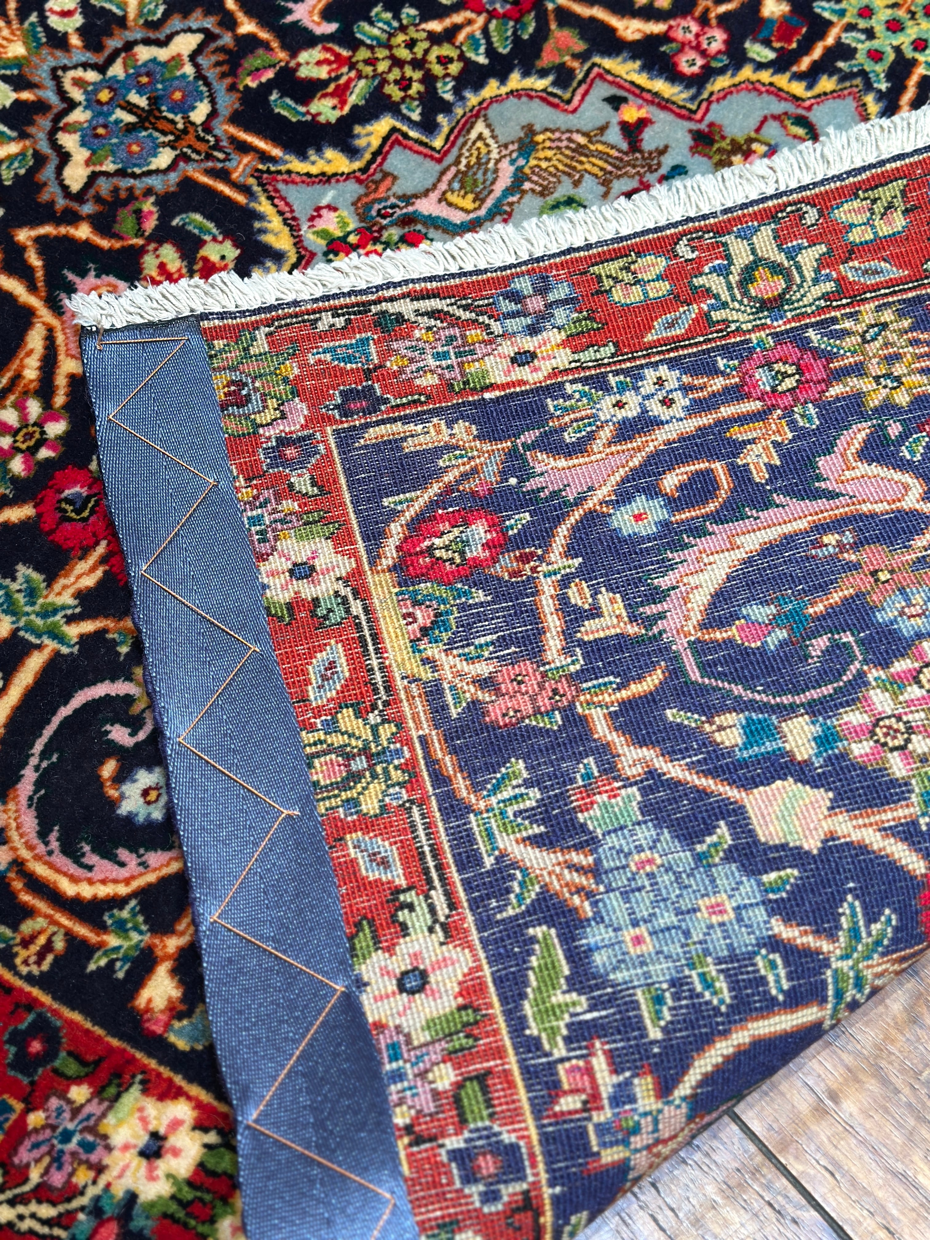 70年程前に織られたタブリーズ産のオールド絨毯です。中央には寛ぐ鹿と孔雀の美しい姿がメダリオン型の額の中に収められ、静かなオアシスのワンシーンを覗いているかのよう。中でも、その傍らを流れる『小川』の表現には目を見張るものがあり、光を反射する水面までも見事な『艶』で再現されていますが、実はこちらはシルクではなく『ウールのみ』で織り上げられています。深みのあるシックな藍色の上を、踊るように展開していく優美な唐草模様〜その間に咲き誇る色も形も異なる花々は、まるで「真夜中の花畑」に迷い込んだかのような幻想的なオーラを放ちます。タペストリーやお玄関マット / ベッドサイドで心ゆくまで眺めて頂きたい逸品です。