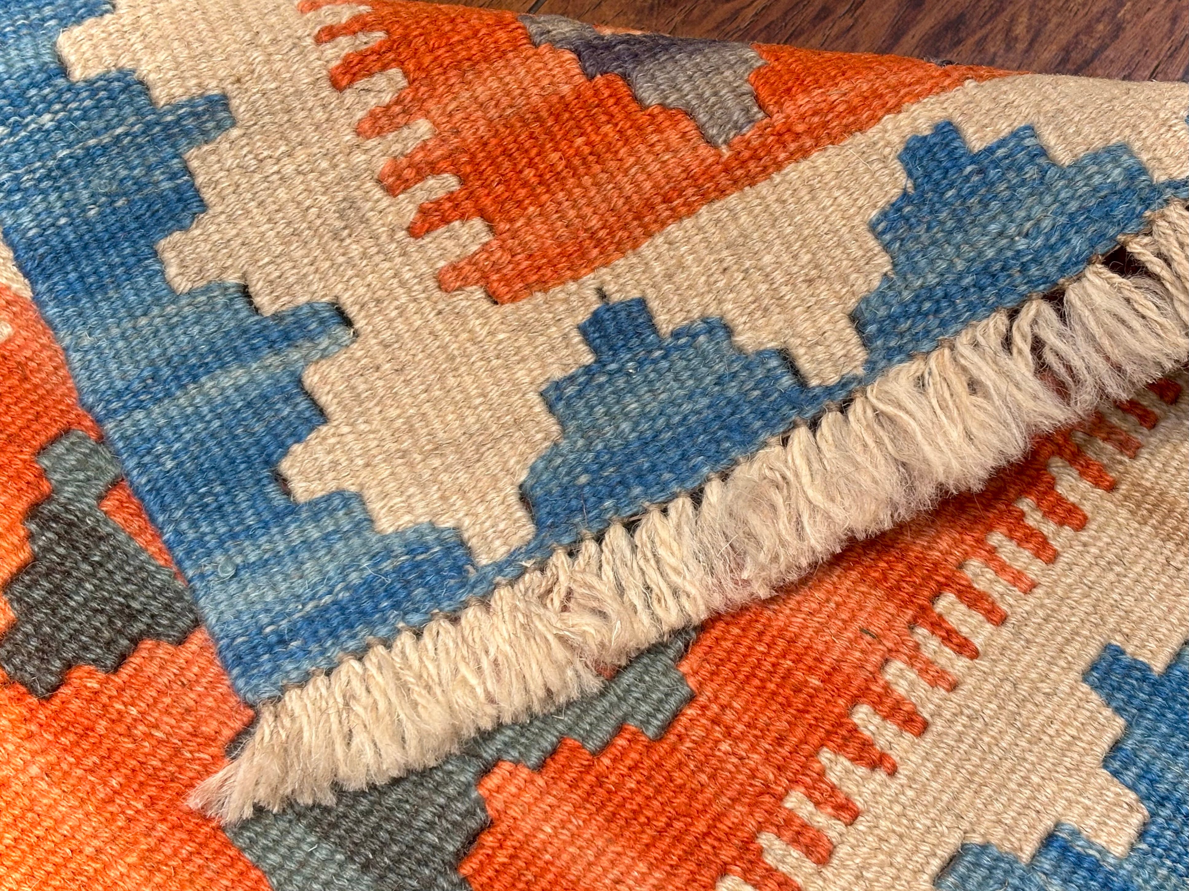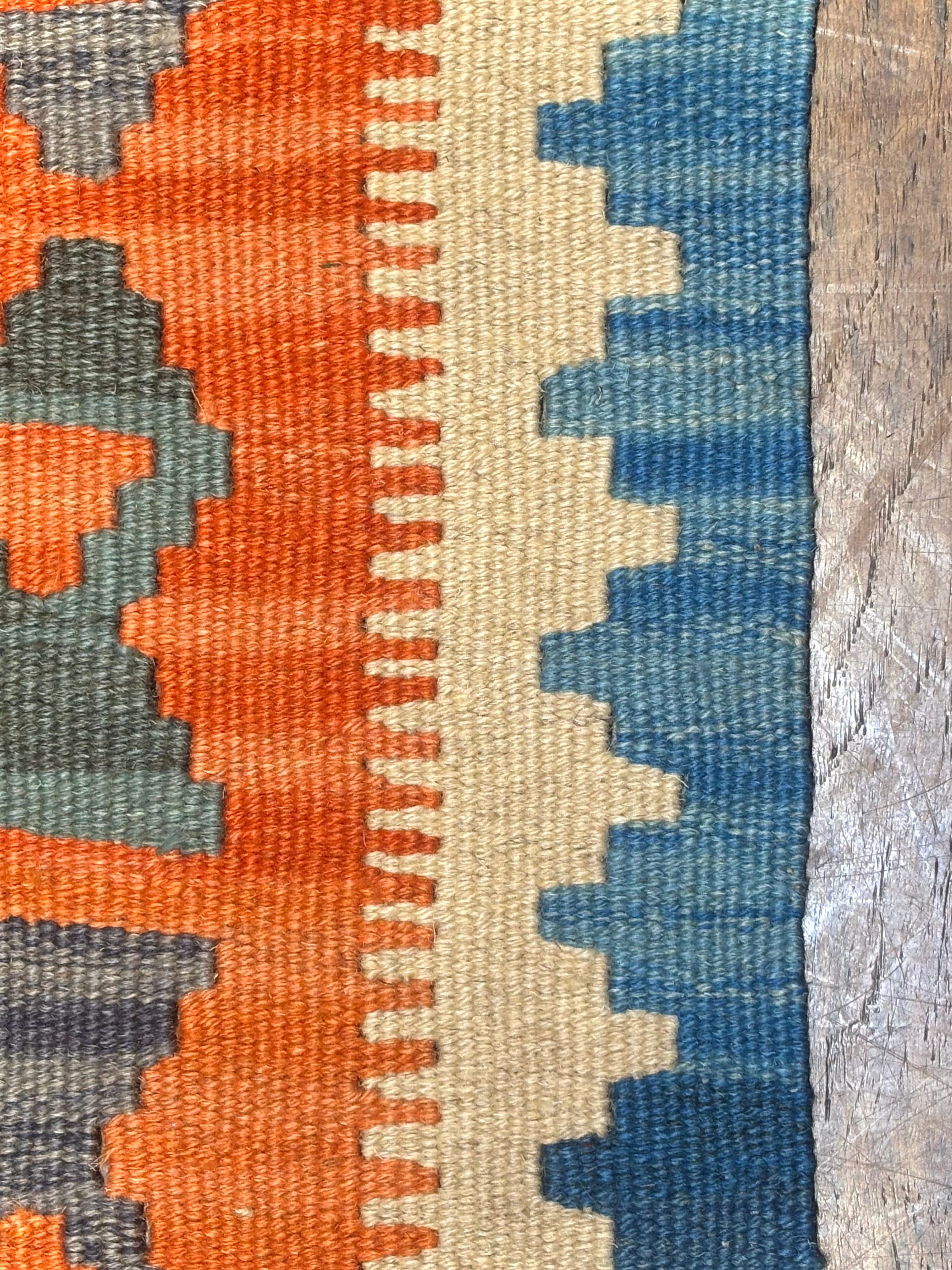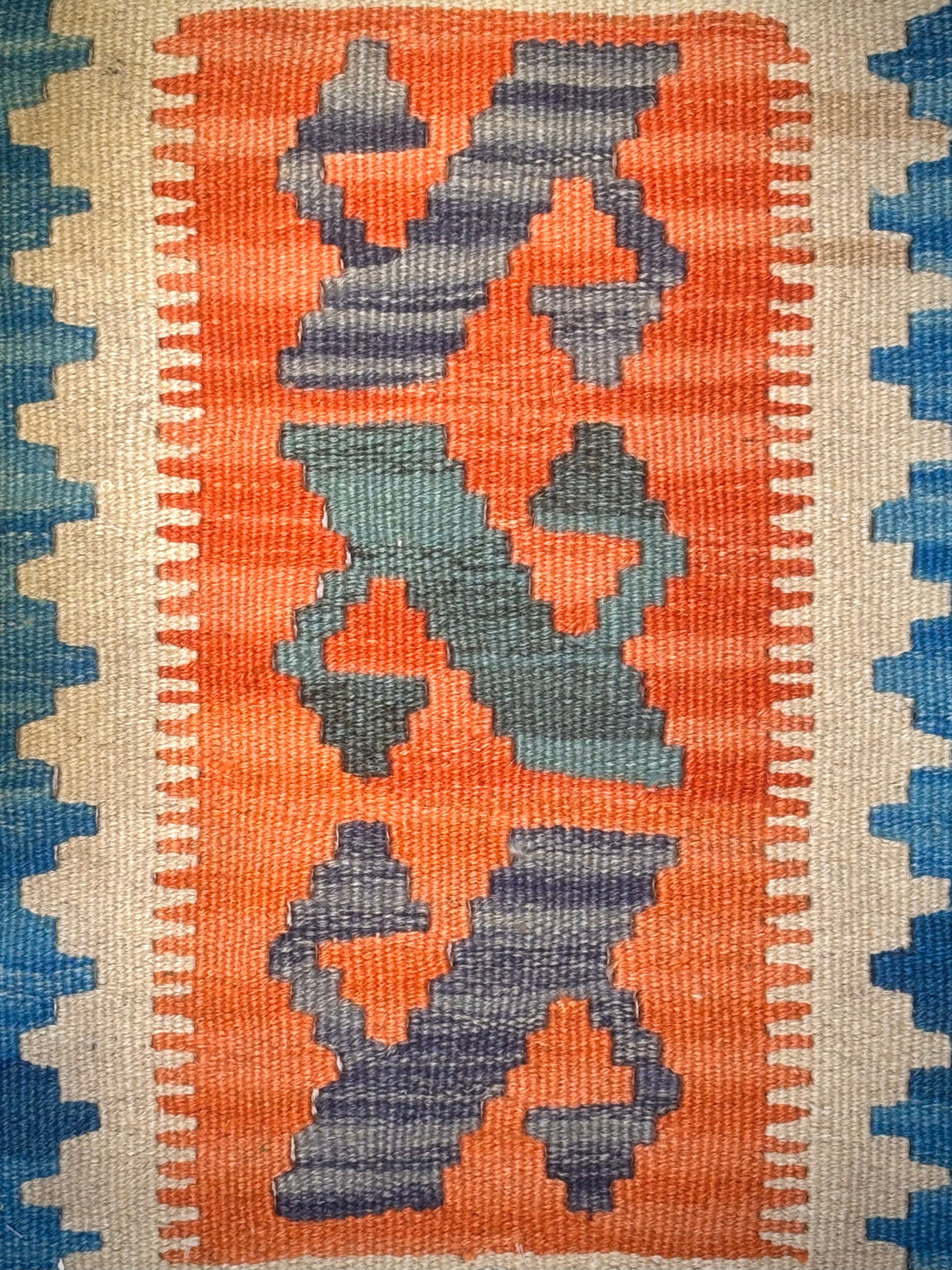 南西イラン・シーラーズ近郊で遊牧生活を営んできたことで知られる、カシュガイ族のキリムです。スタイリッシュなデザインですが、カシュガイ族に由来する伝統的な紋様と南イランらしい明るい色の組み合わせで織られています。デザインを構成する幾何学紋様は、遊牧生活の中で、厄除けや幸福への願いから生まれたものです。薄い織り上がりのキリムですが、ウールで織られているので床の冷たさを感じさせず、暑い季節でもスッキリとしたお使い心地で、オールシーズン活躍します。お玄関マットやベッドサイドとして、洗いやすいのでキッチンマットやワンちゃん、猫ちゃんのコーナーにもオススメです。両面お使いいただけます。