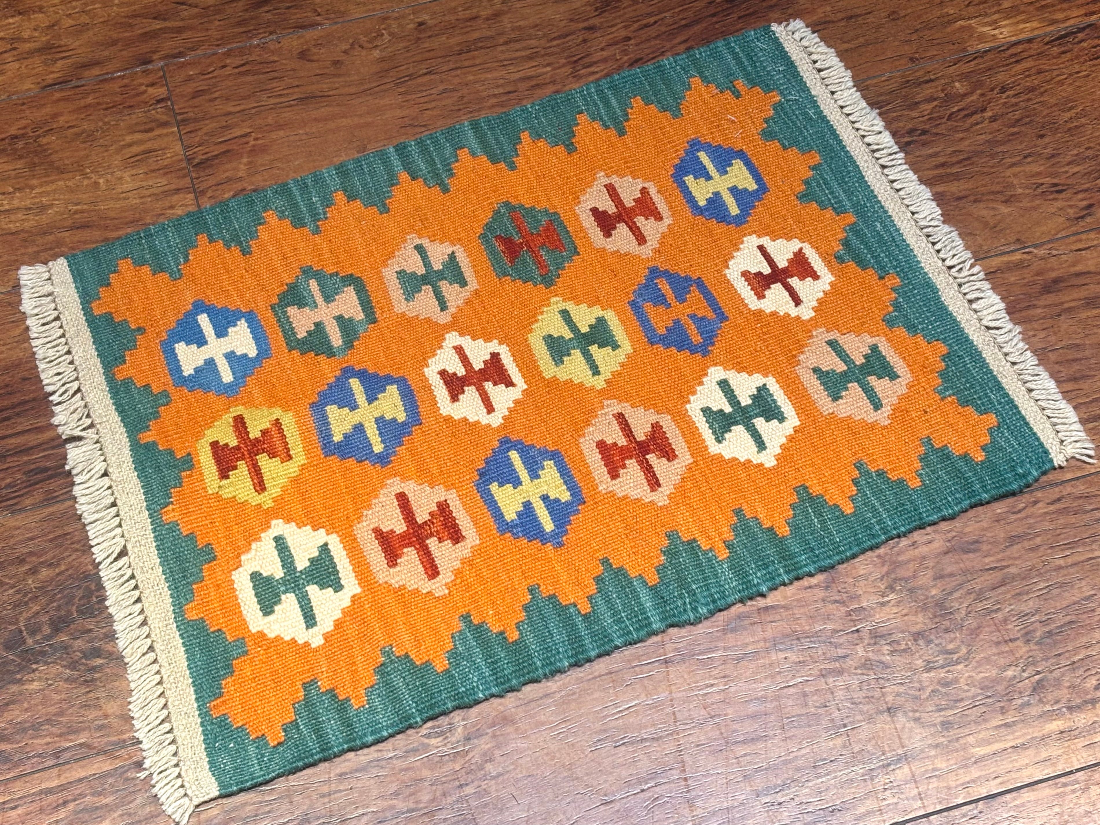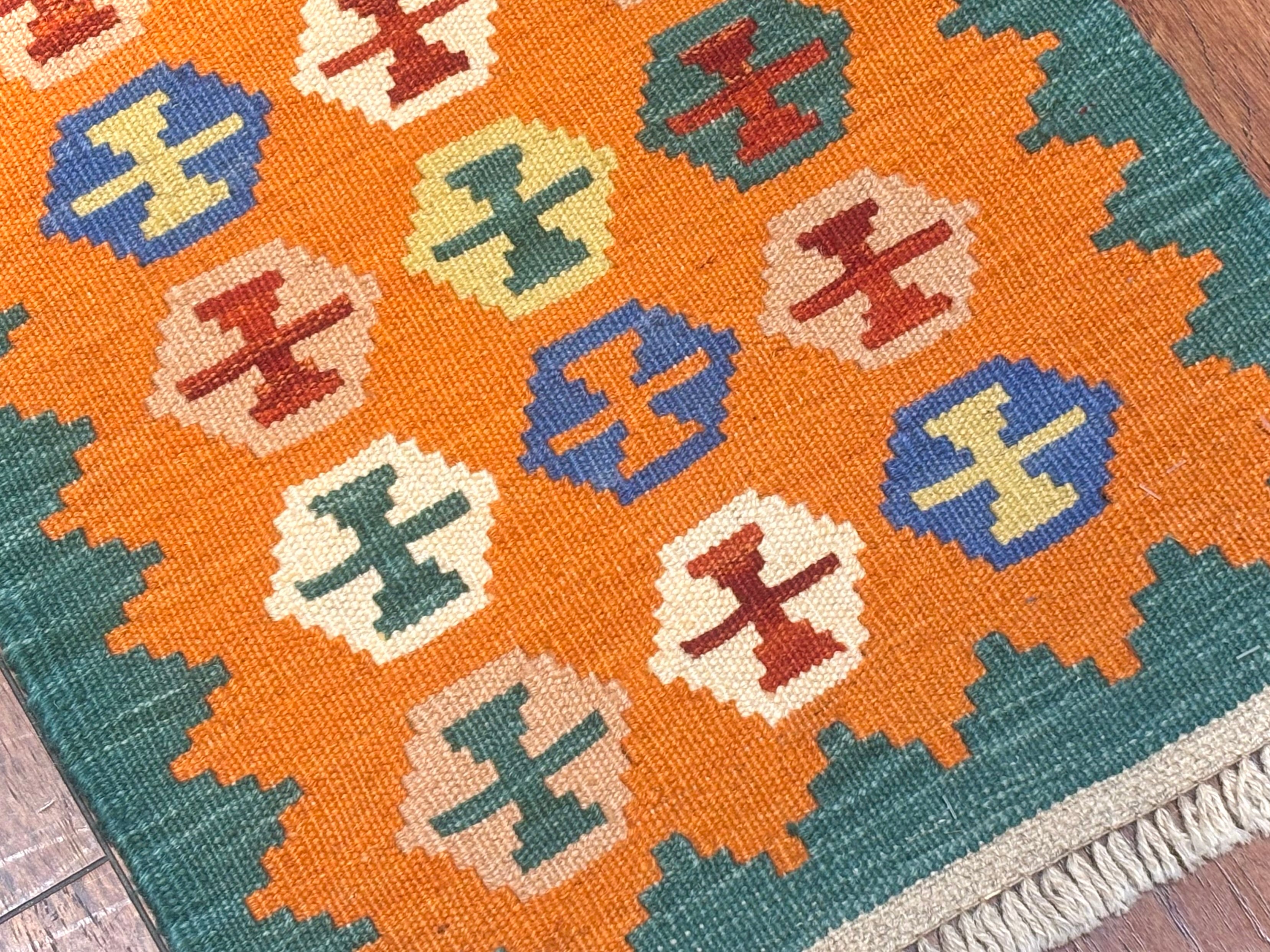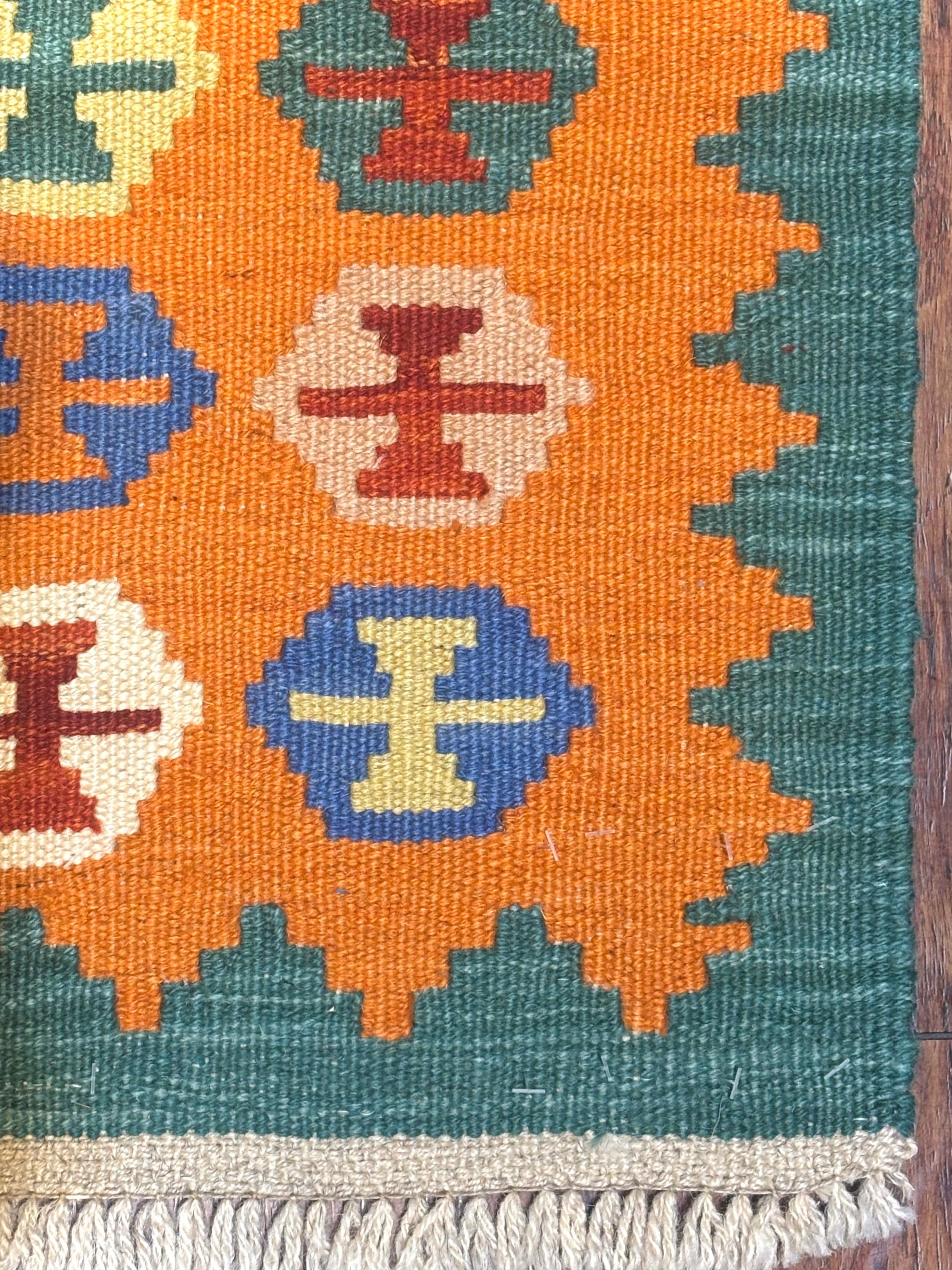 南西イラン・シーラーズ近郊で遊牧生活を営んできたことで知られる、カシュガイ族のキリムです。スタイリッシュなデザインですが、カシュガイ族に由来する伝統的な紋様と南イランらしい明るい色の組み合わせで織られています。デザインを構成する幾何学紋様は、遊牧生活の中で、厄除けや幸福への願いから生まれたものです。薄い織り上がりのキリムですが、ウールで織られているので床の冷たさを感じさせず、暑い季節でもスッキリとしたお使い心地で、オールシーズン活躍します。お玄関マットやベッドサイドとして、洗いやすいのでキッチンマットやワンちゃん、猫ちゃんのコーナーにもオススメです。両面お使いいただけます。