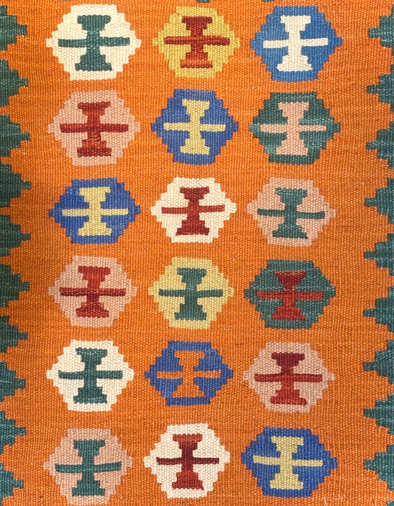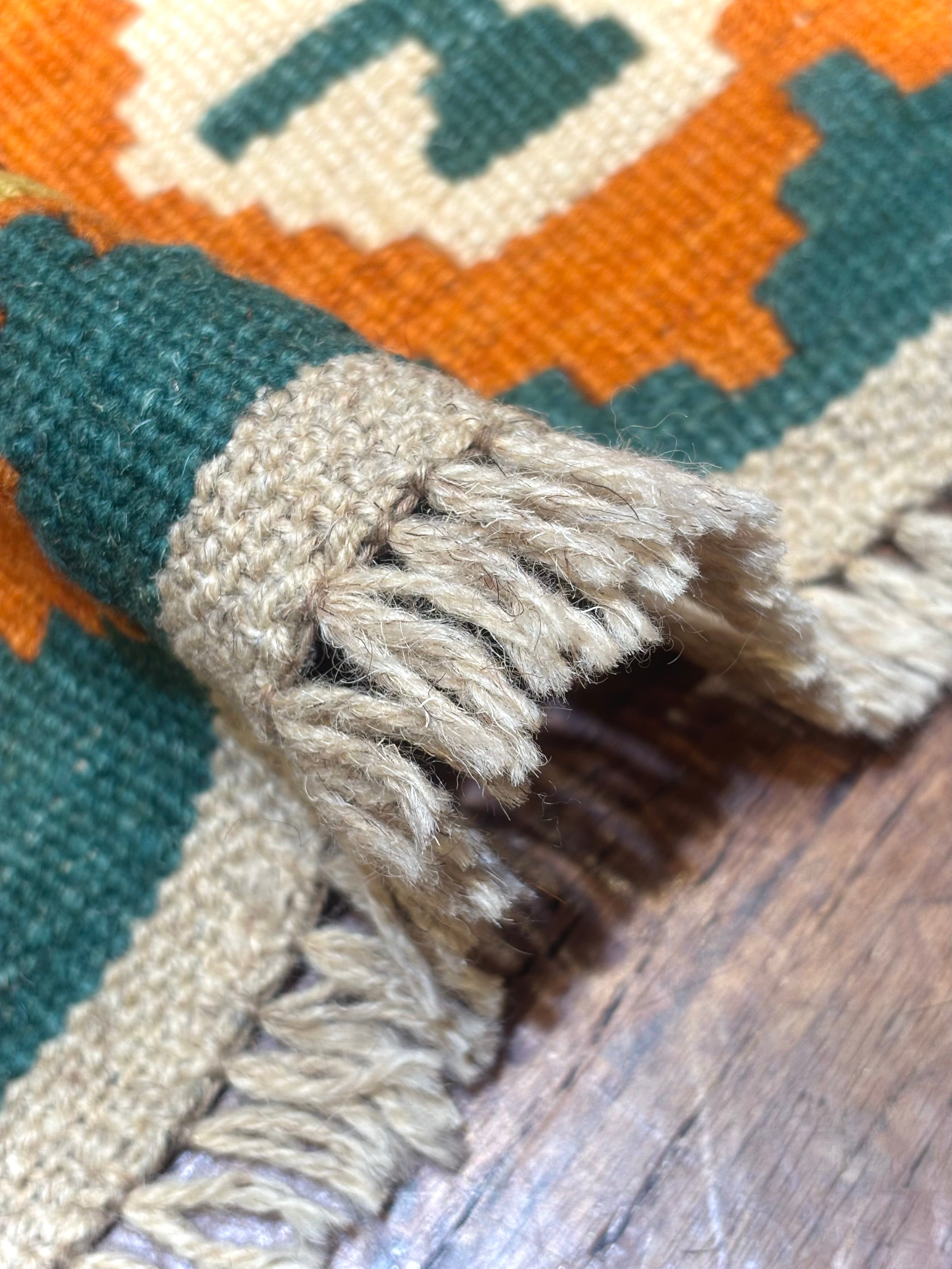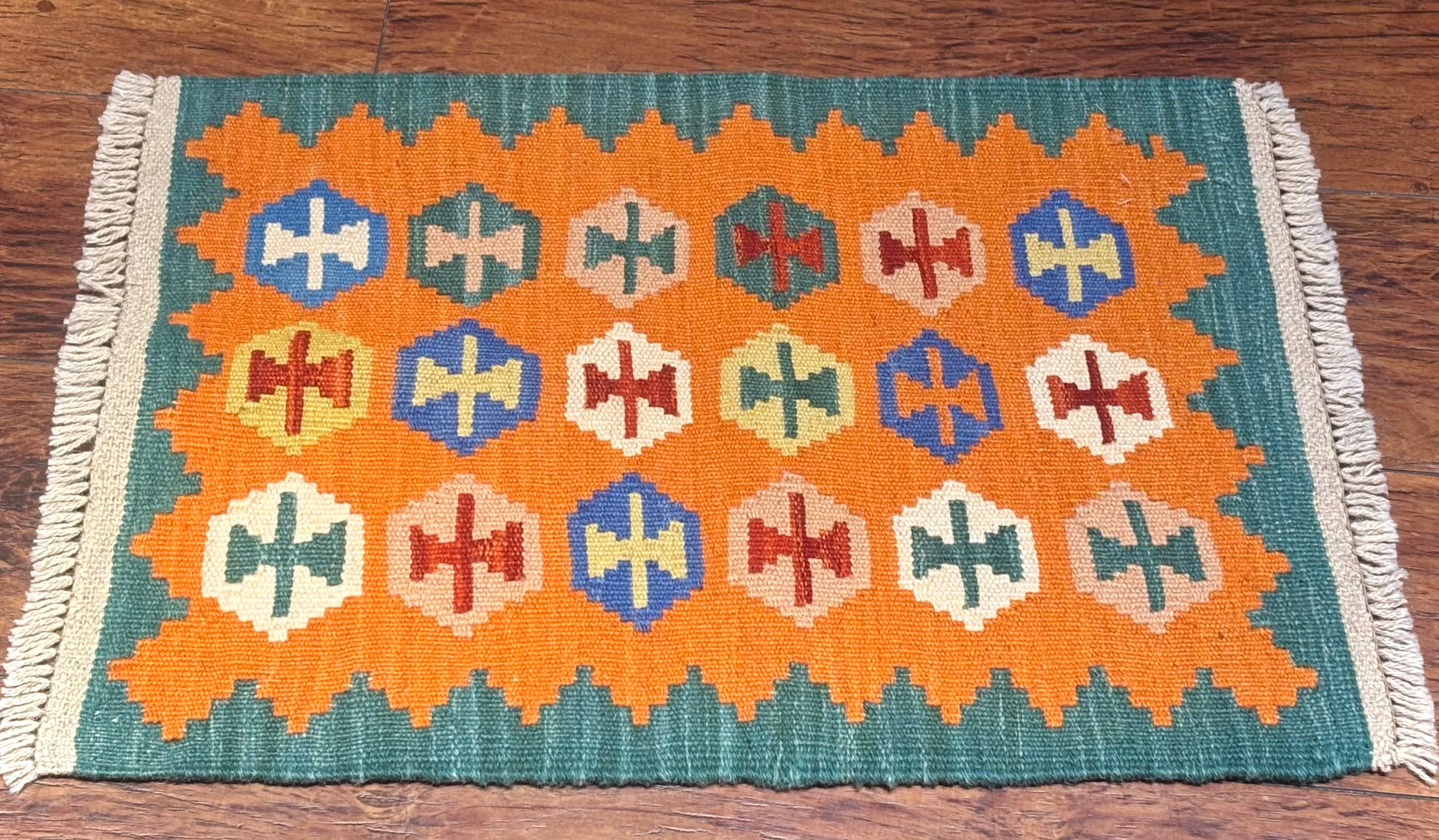 南西イラン・シーラーズ近郊で遊牧生活を営んできたことで知られる、カシュガイ族のキリムです。スタイリッシュなデザインですが、カシュガイ族に由来する伝統的な紋様と南イランらしい明るい色の組み合わせで織られています。デザインを構成する幾何学紋様は、遊牧生活の中で、厄除けや幸福への願いから生まれたものです。薄い織り上がりのキリムですが、ウールで織られているので床の冷たさを感じさせず、暑い季節でもスッキリとしたお使い心地で、オールシーズン活躍します。お玄関マットやベッドサイドとして、洗いやすいのでキッチンマットやワンちゃん、猫ちゃんのコーナーにもオススメです。両面お使いいただけます。