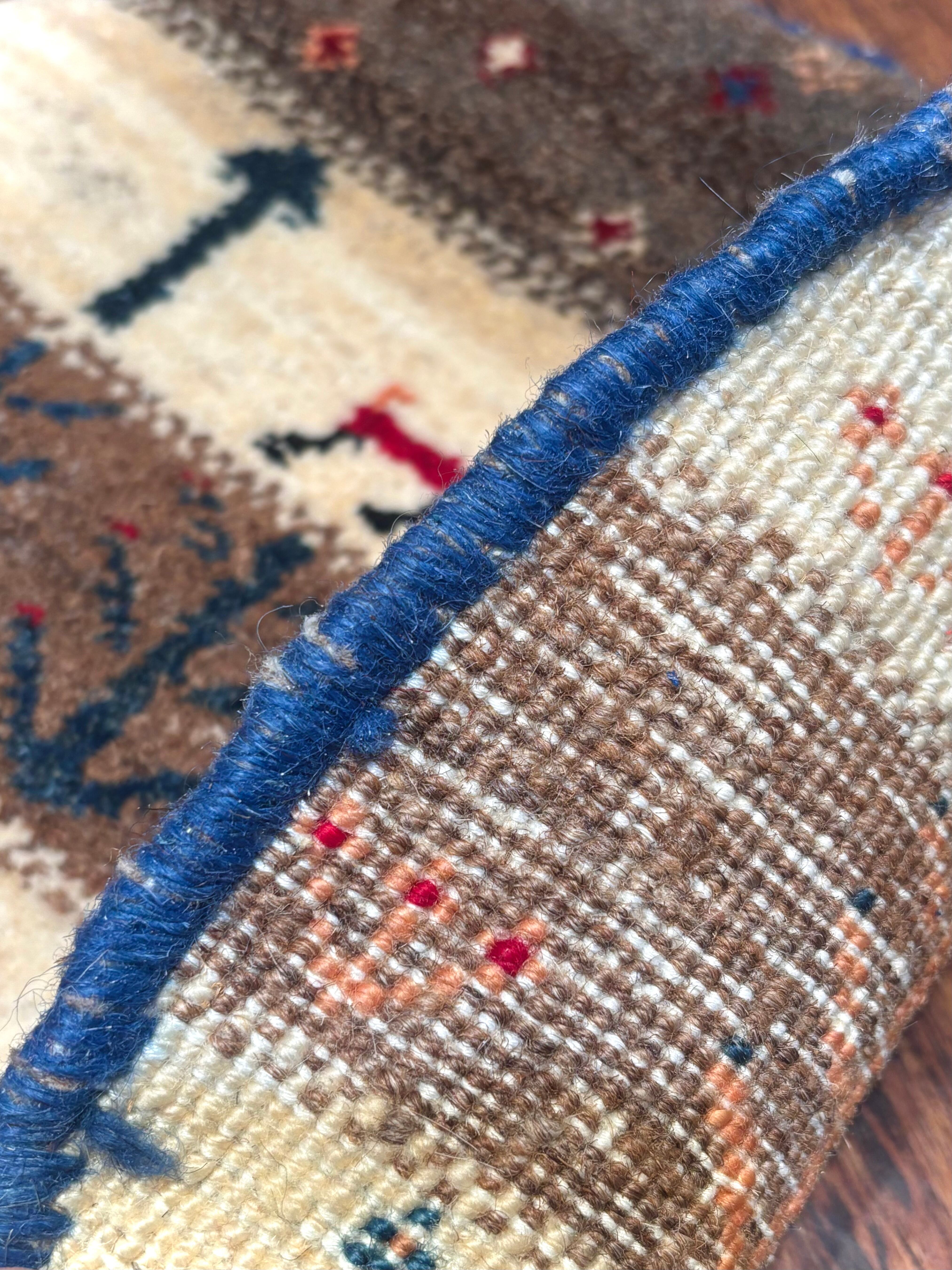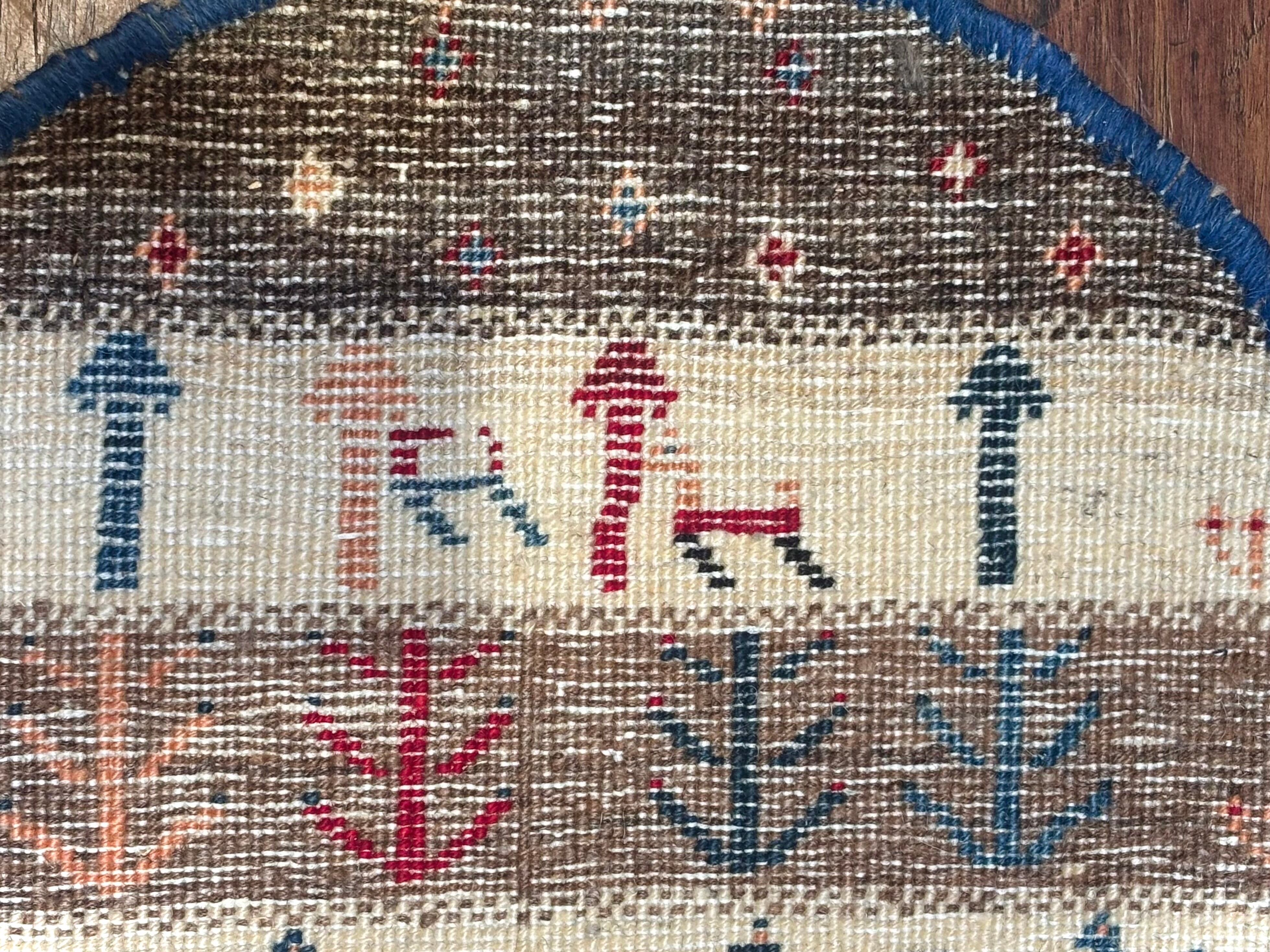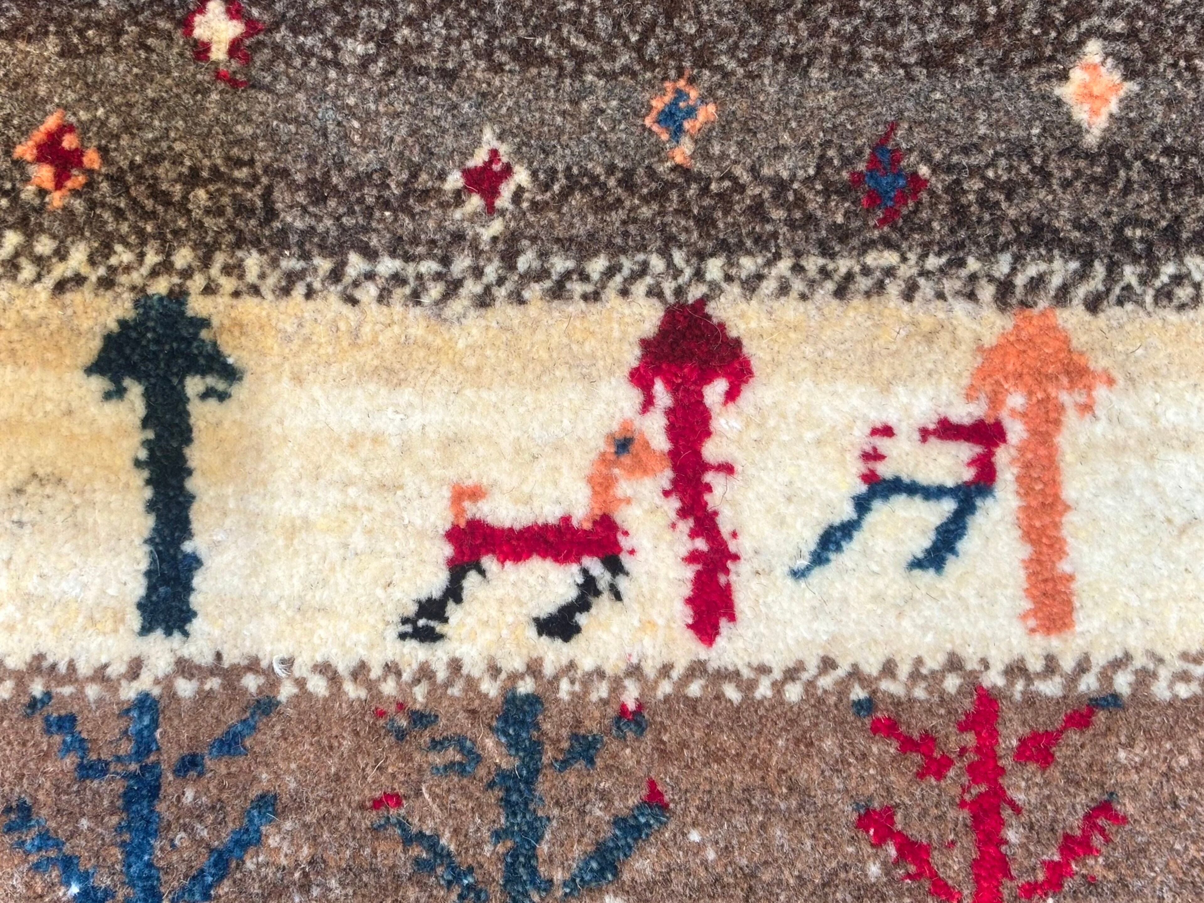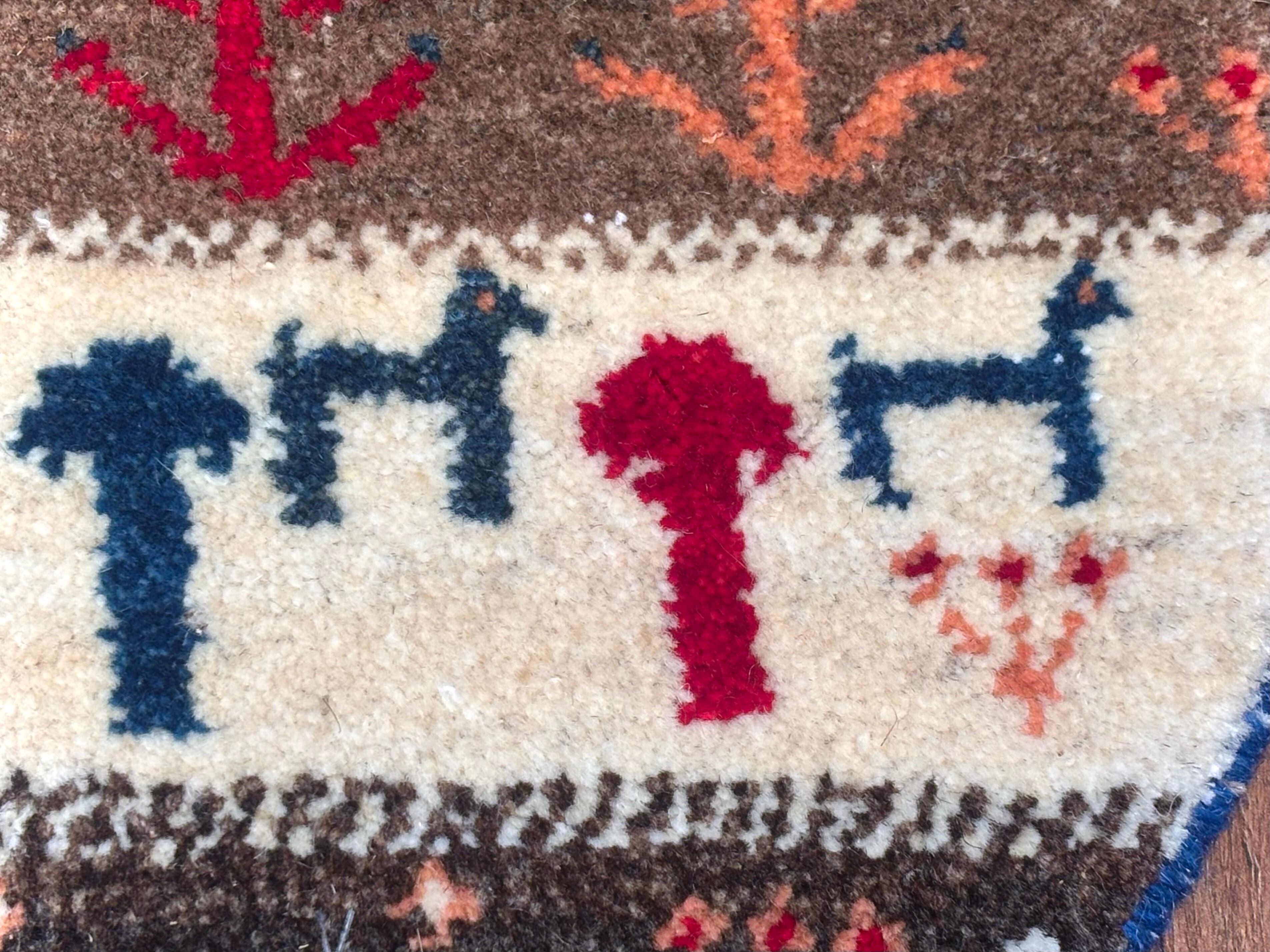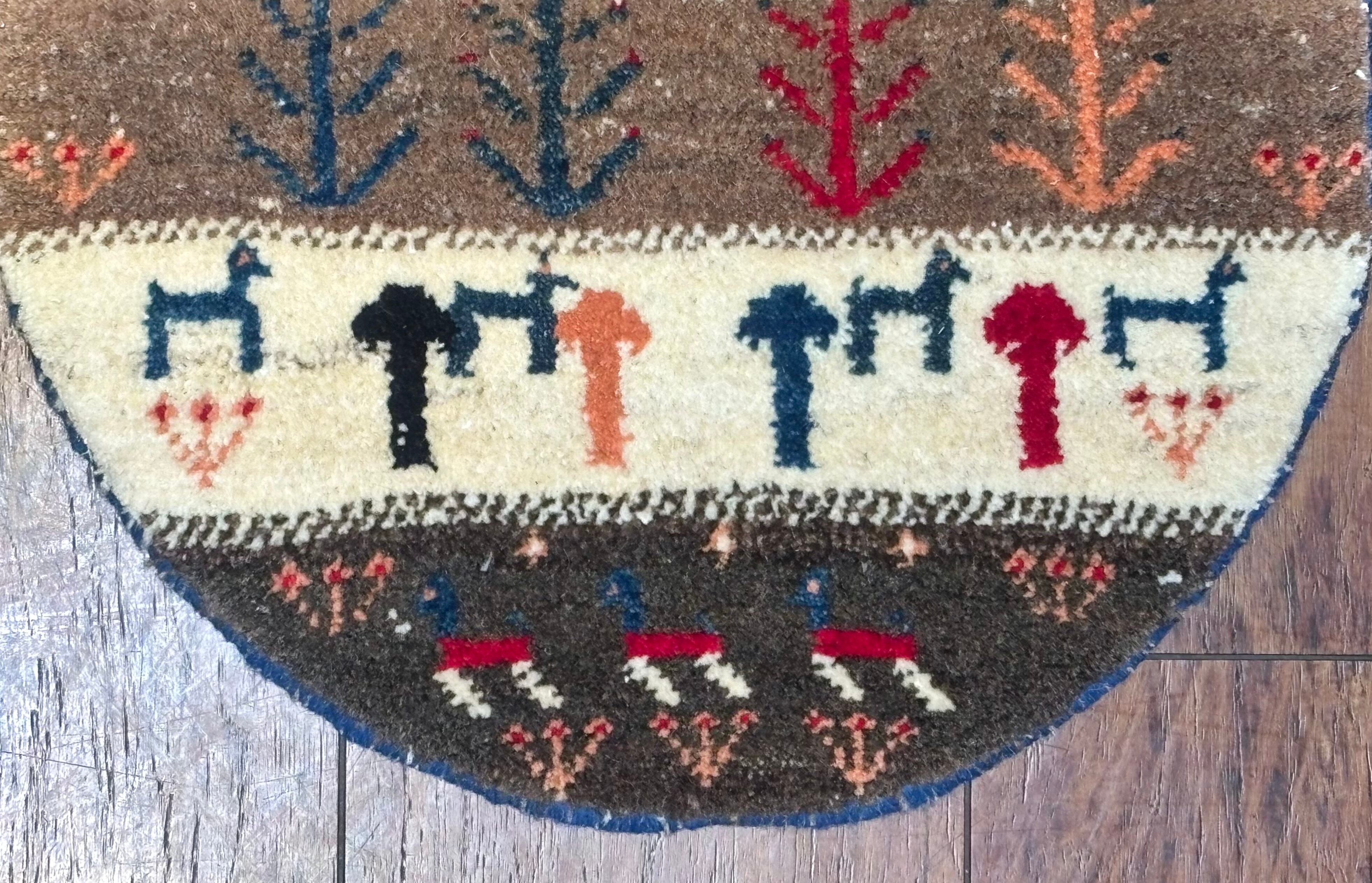 当店では、〈正方形〉と〈円形〉の2種類のタイプのミニギャッベをご用意致しております。円形タイプは、より細めの上質なウールが用いられていることから、織りが細かく、曲線や細密な表現が活かされた景色や動物(ライオン・ラクダ)など、個性的なデザインが揃います。