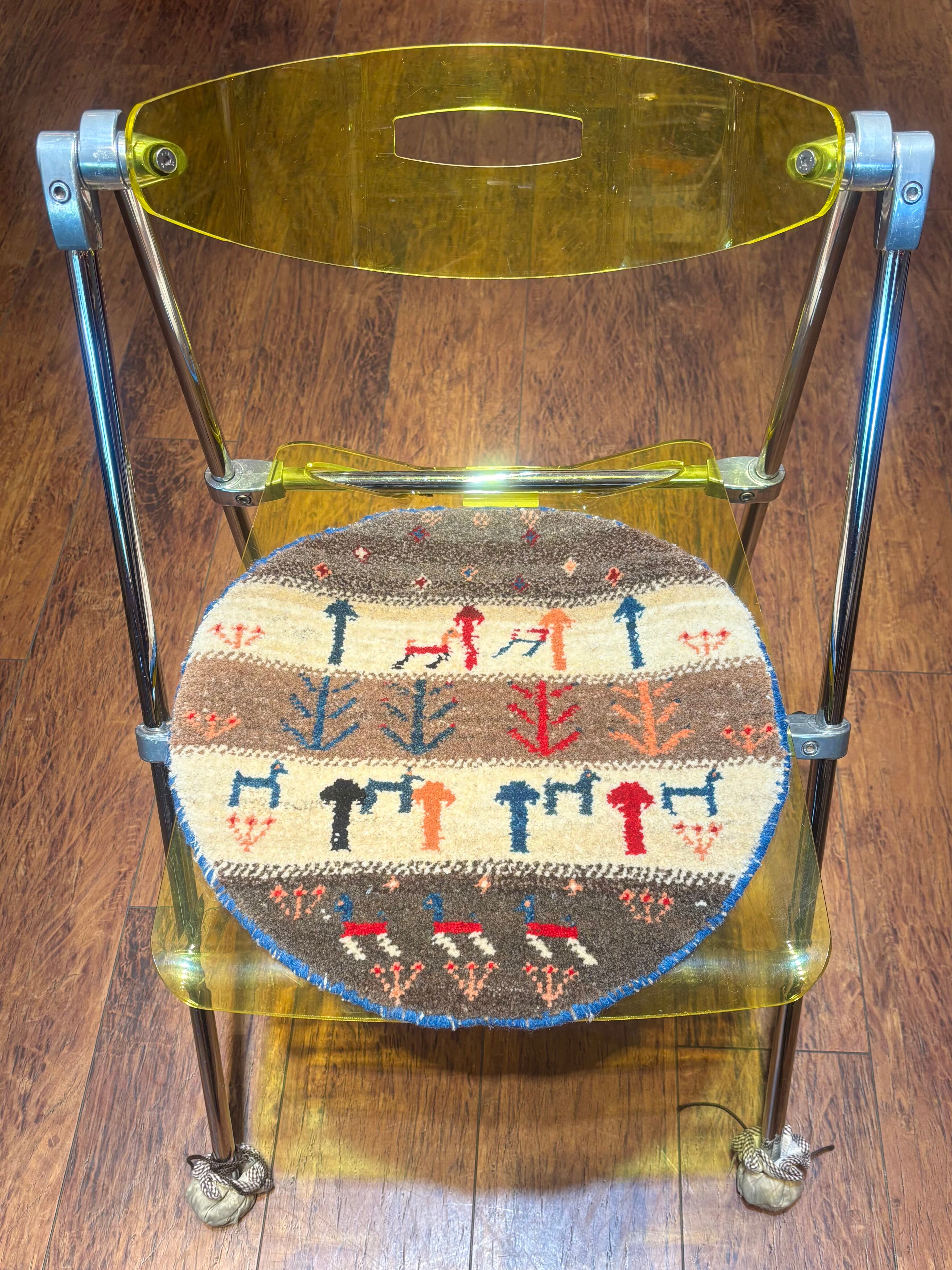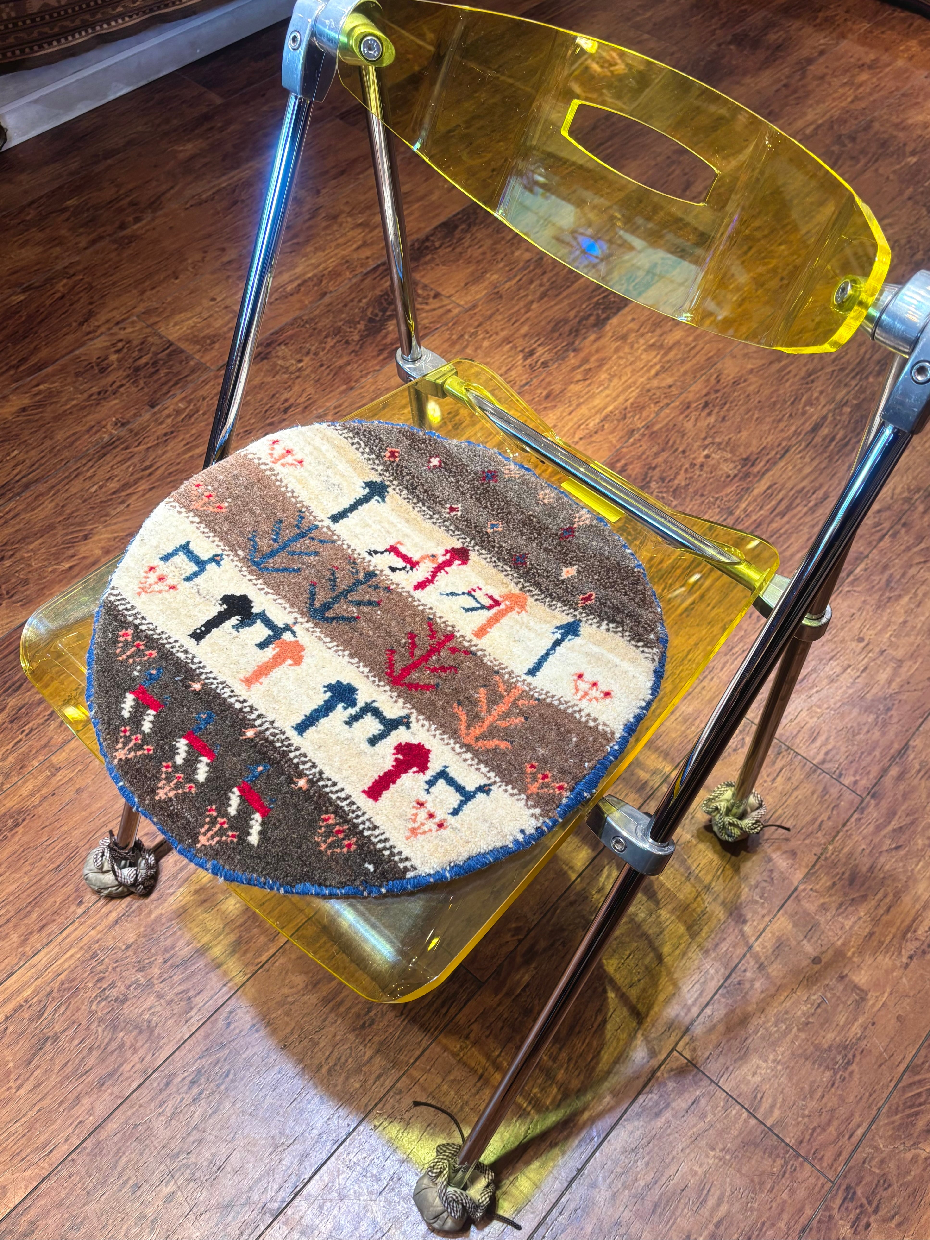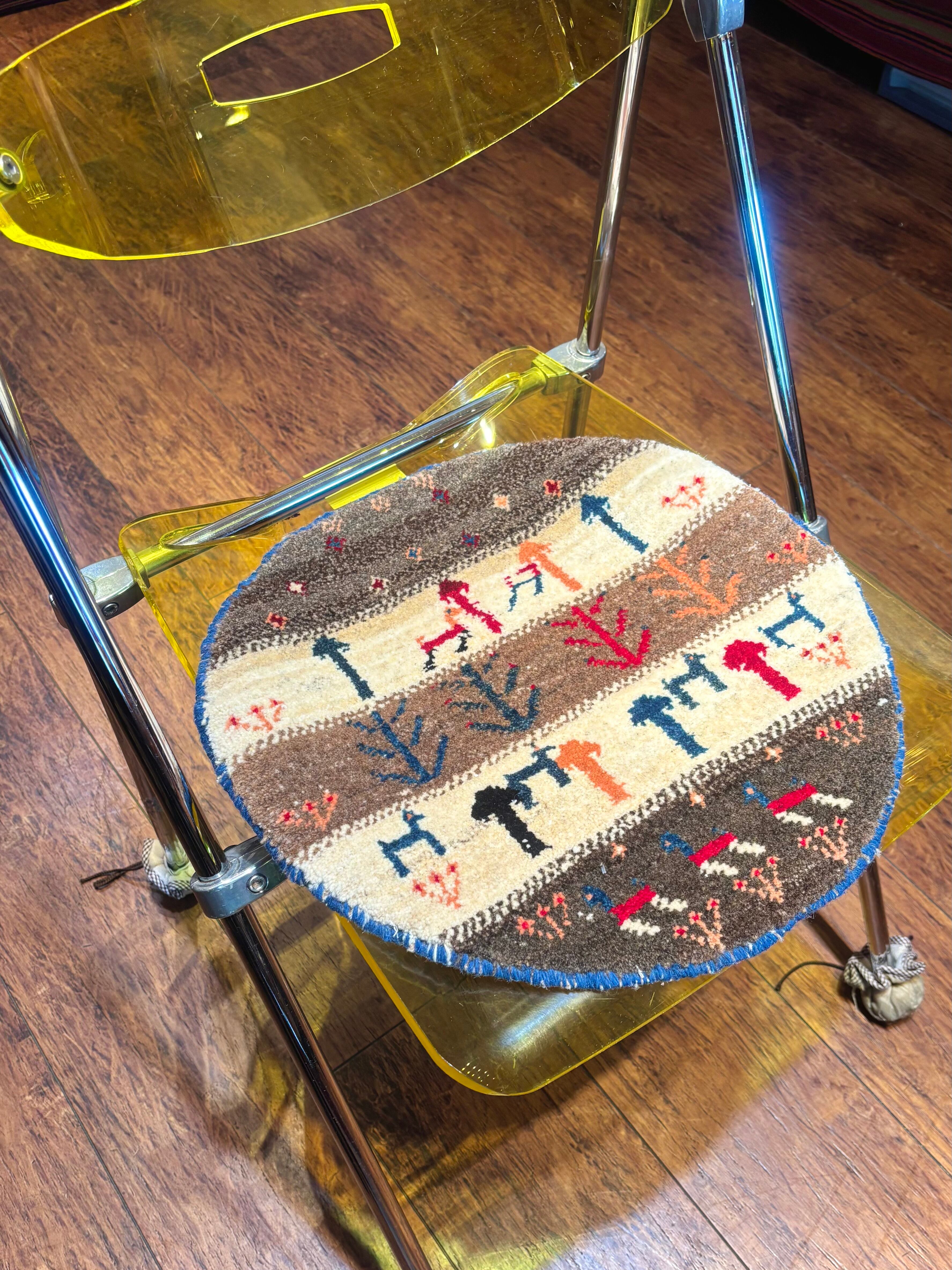 通常タイプのお椅子の座面にお使い頂いても、自然に見えるサイズ感です。座面が円形のお椅子には、是非丸いミニギャッベを合わせたいですね!周囲にフサがつくと、より華やかな印象になります♪