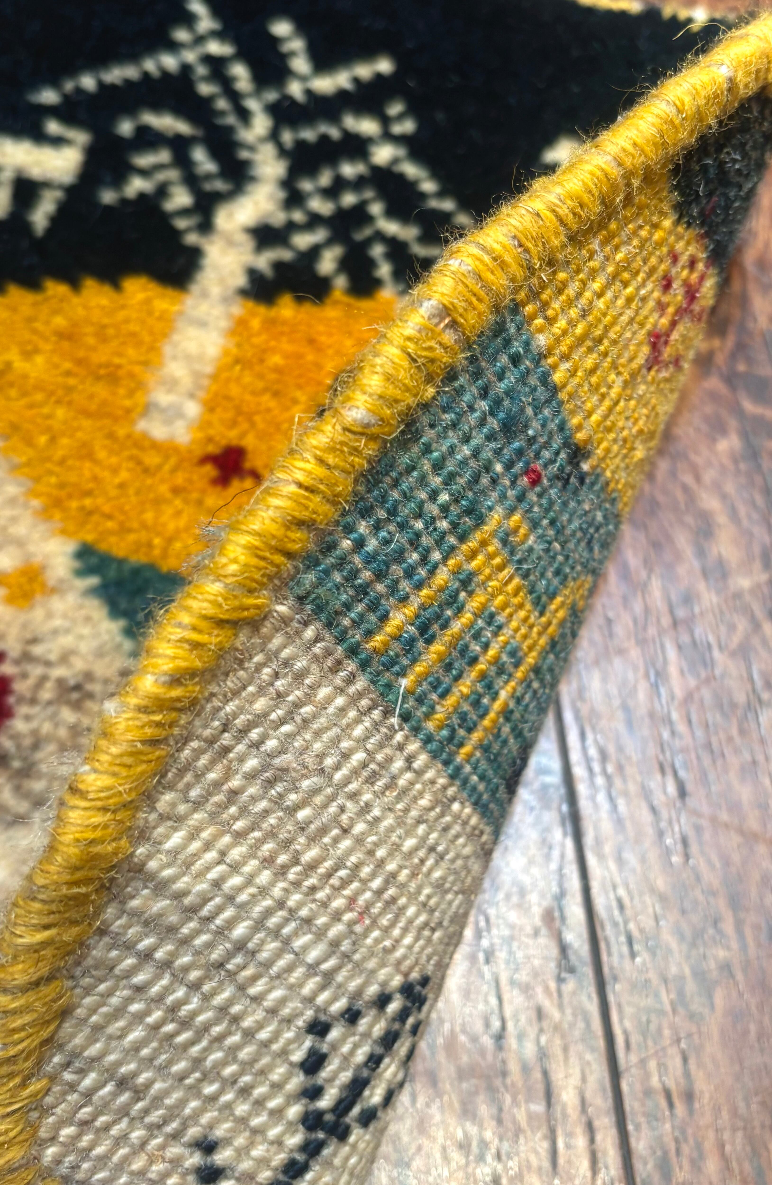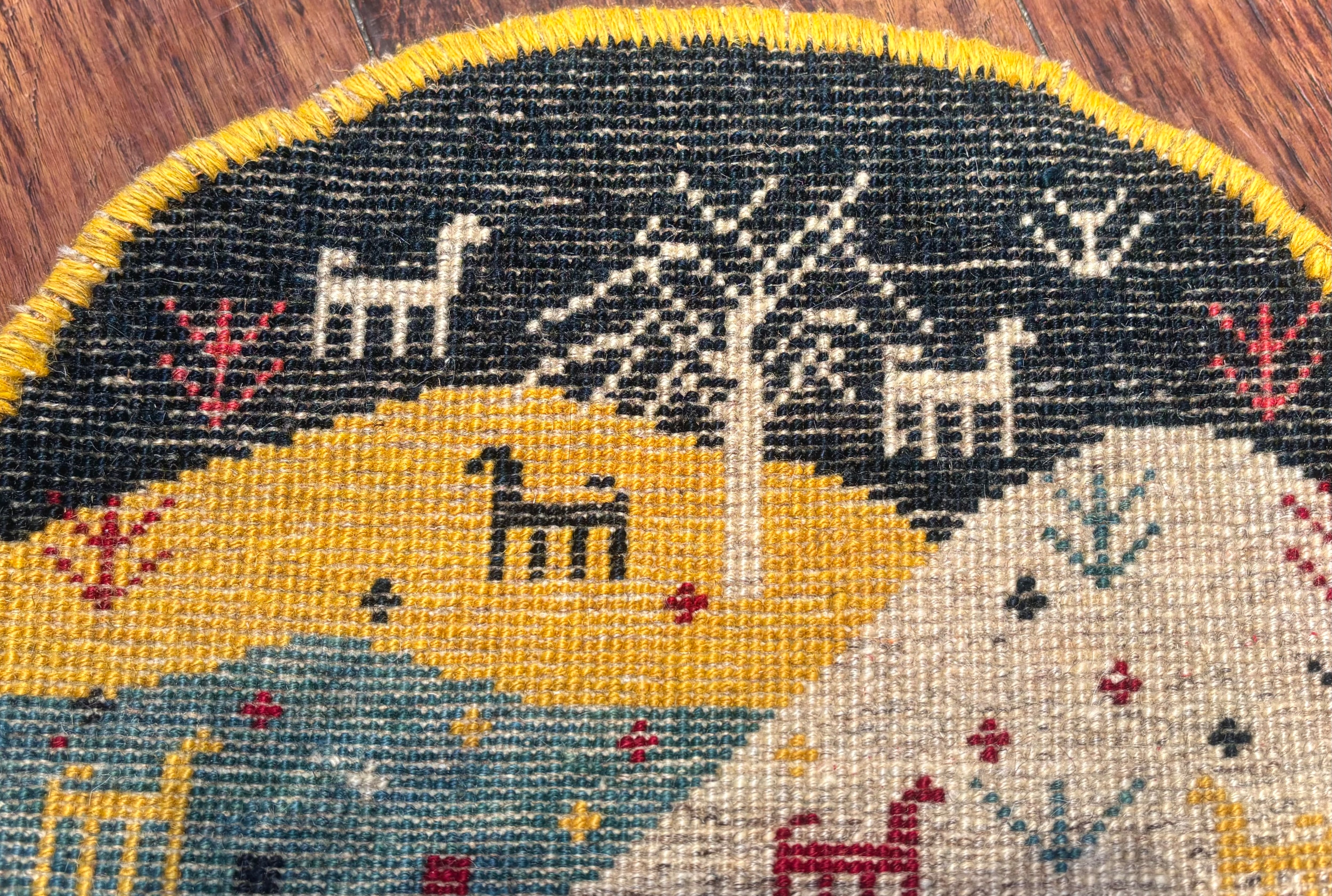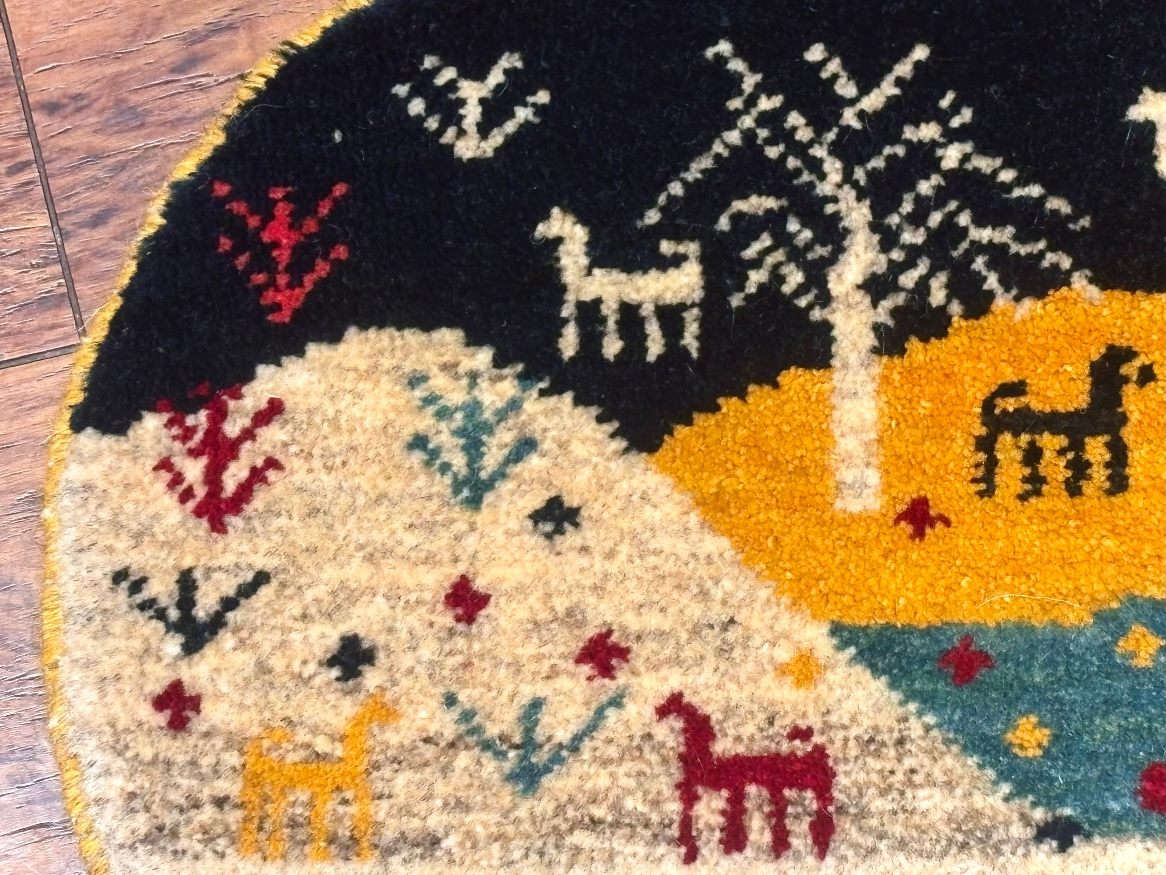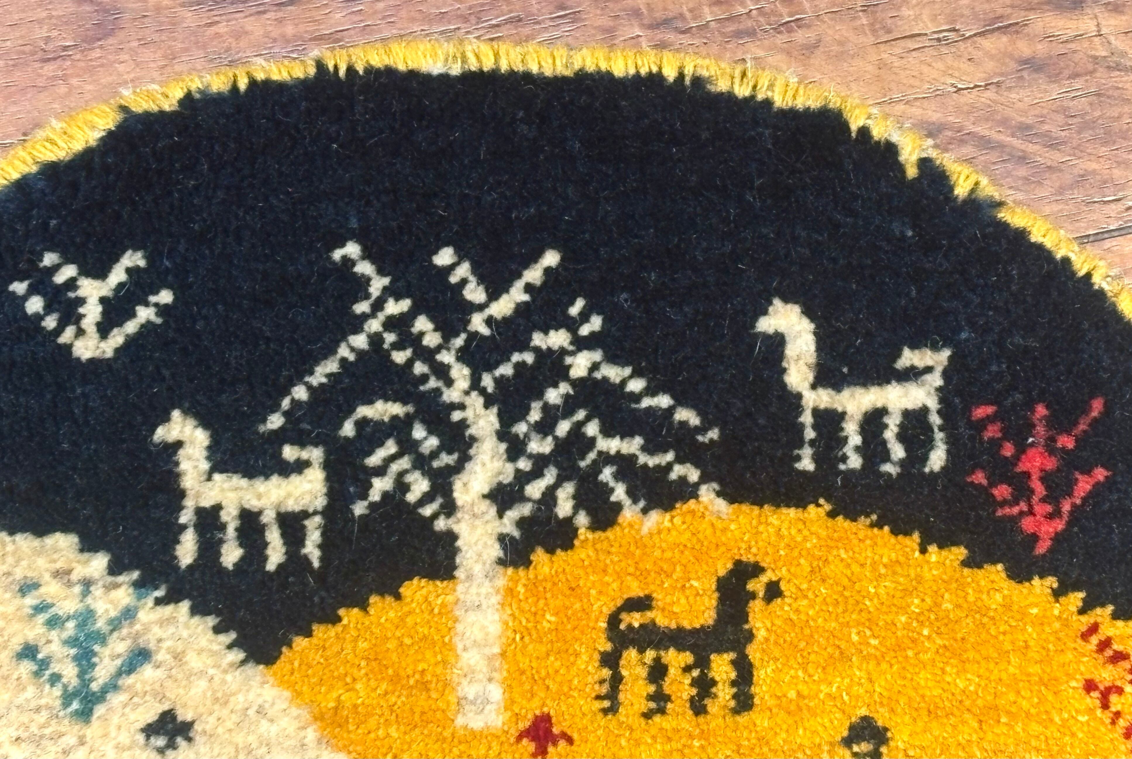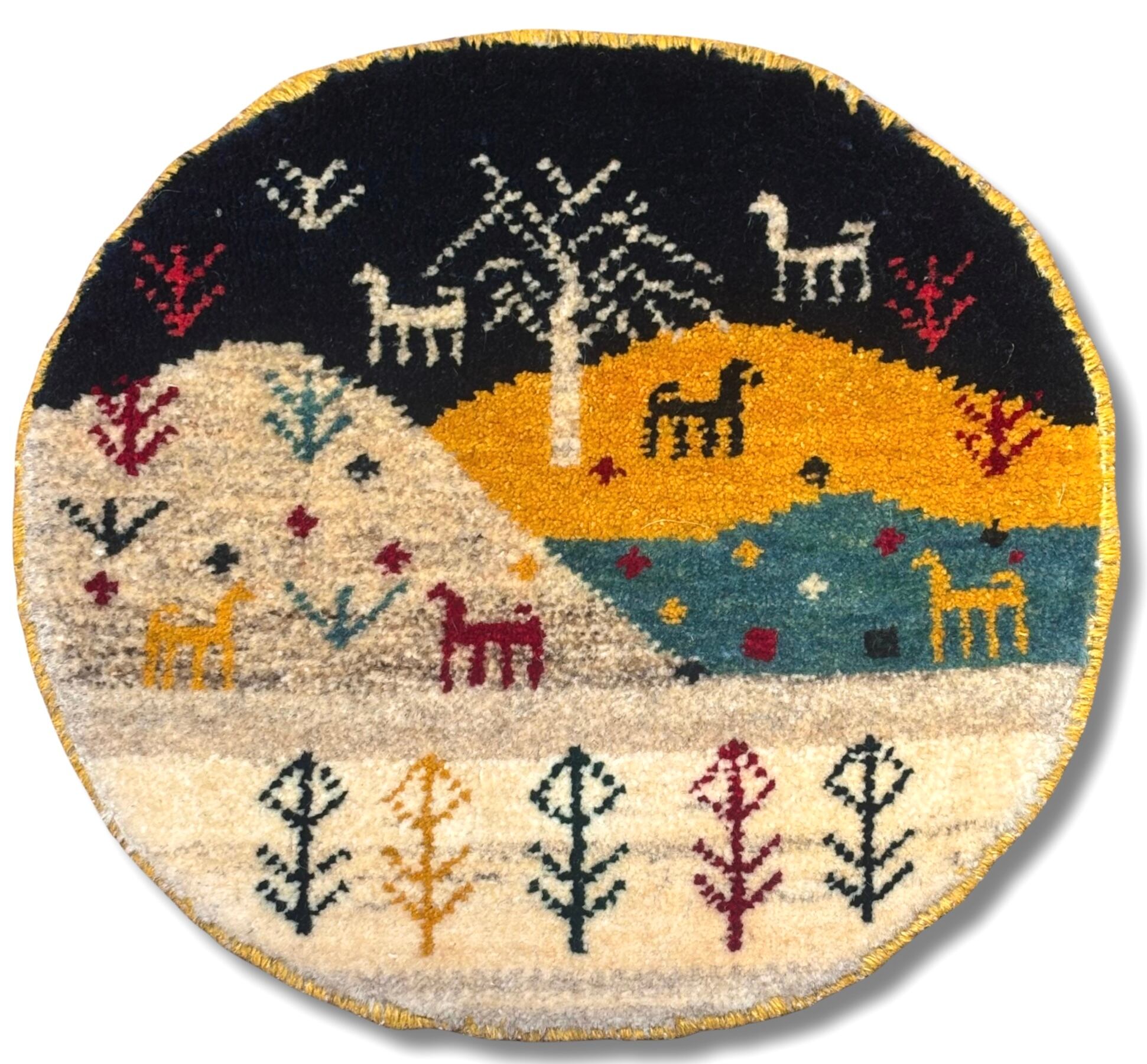 当店では、〈正方形〉と〈円形〉の2種類のタイプのミニギャッベをご用意致しております。円形タイプは、より細めの上質なウールが用いられていることから、織りが細かく、曲線や細密な表現が活かされた景色や動物(ライオン・ラクダ)など、個性的なデザインが揃います。