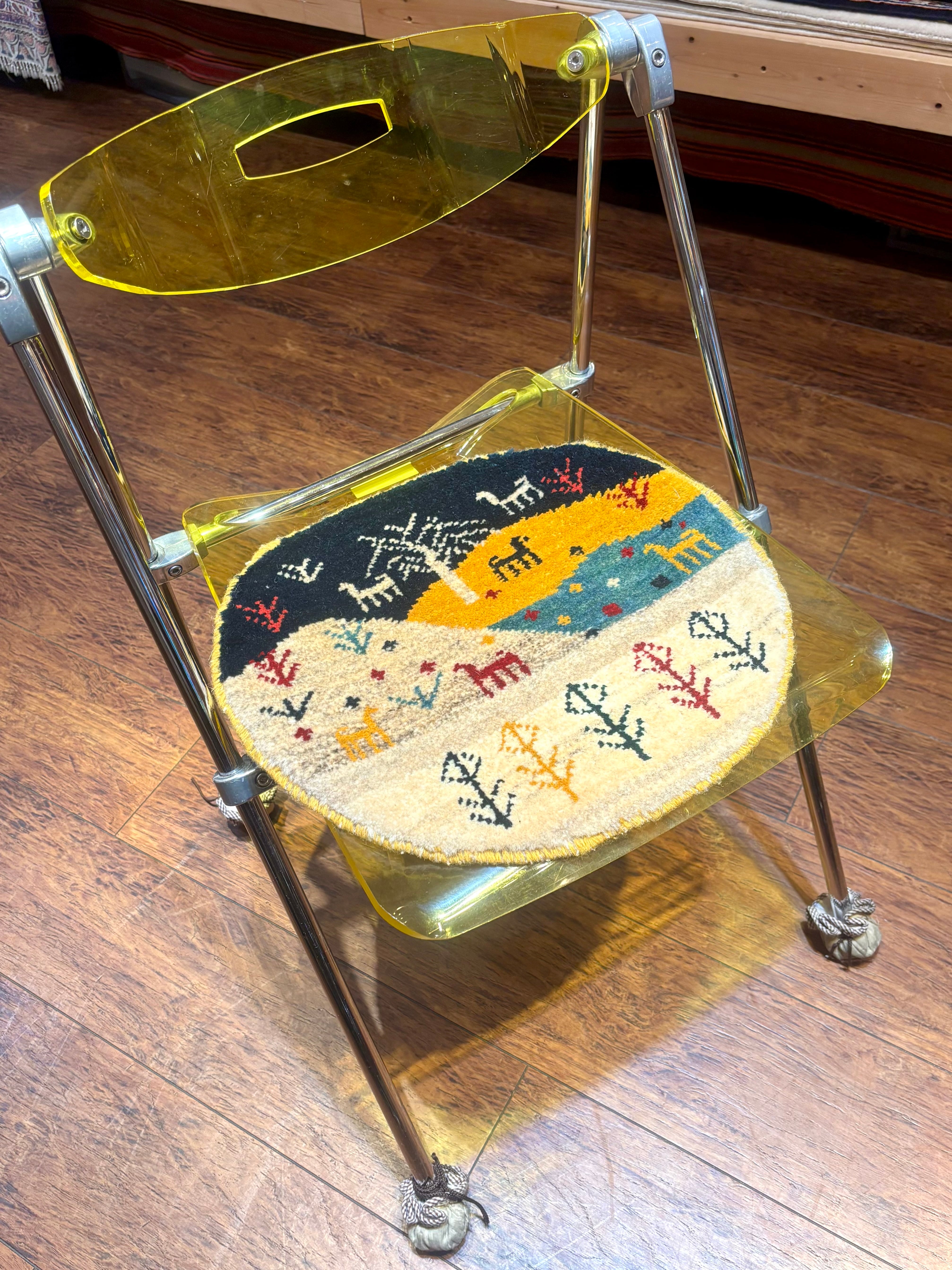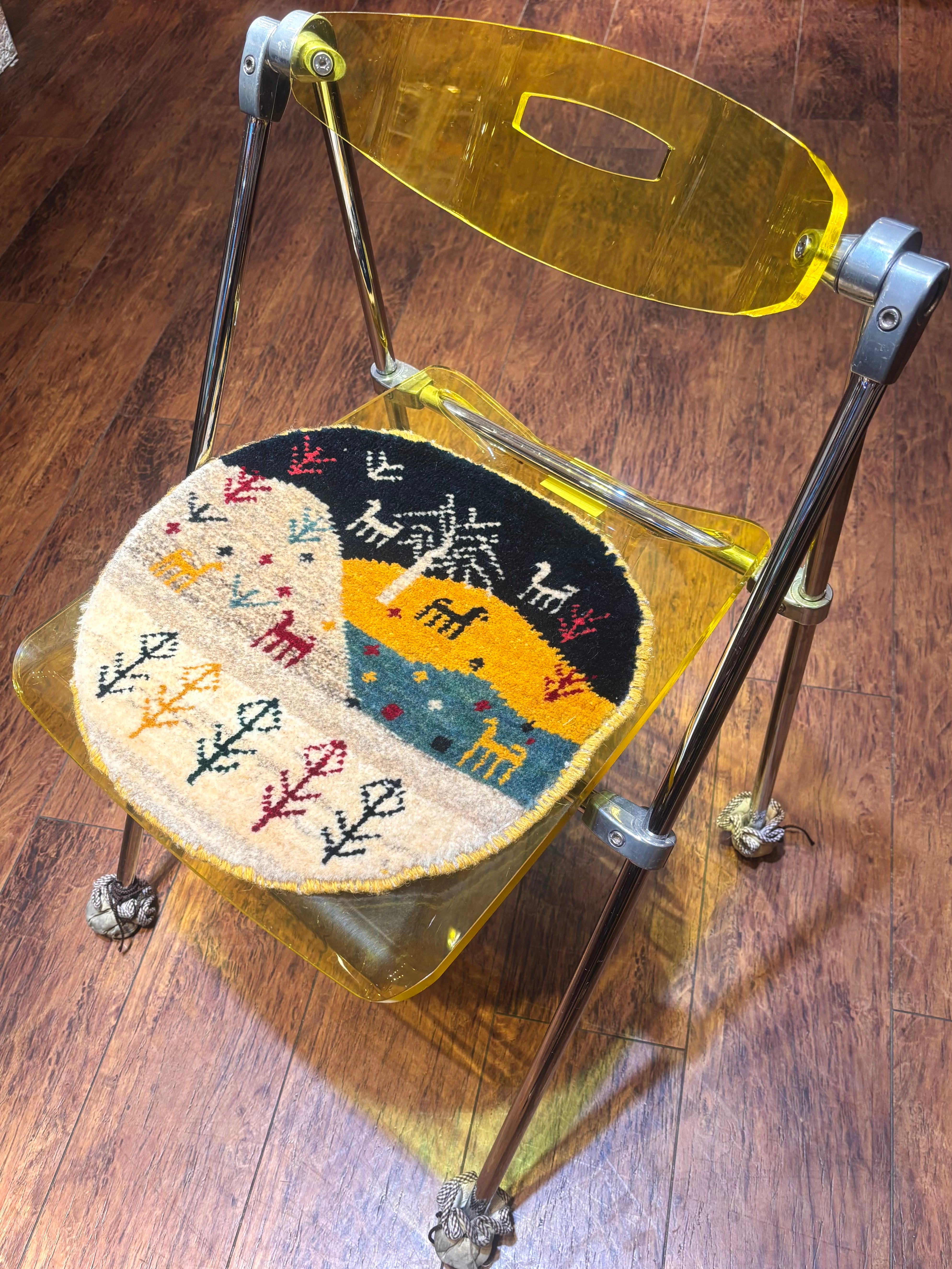 通常タイプのお椅子の座面にお使い頂いても、自然に見えるサイズ感です。座面が円形のお椅子には、是非丸いミニギャッベを合わせたいですね!周囲にフサがつくと、より華やかな印象になります♪