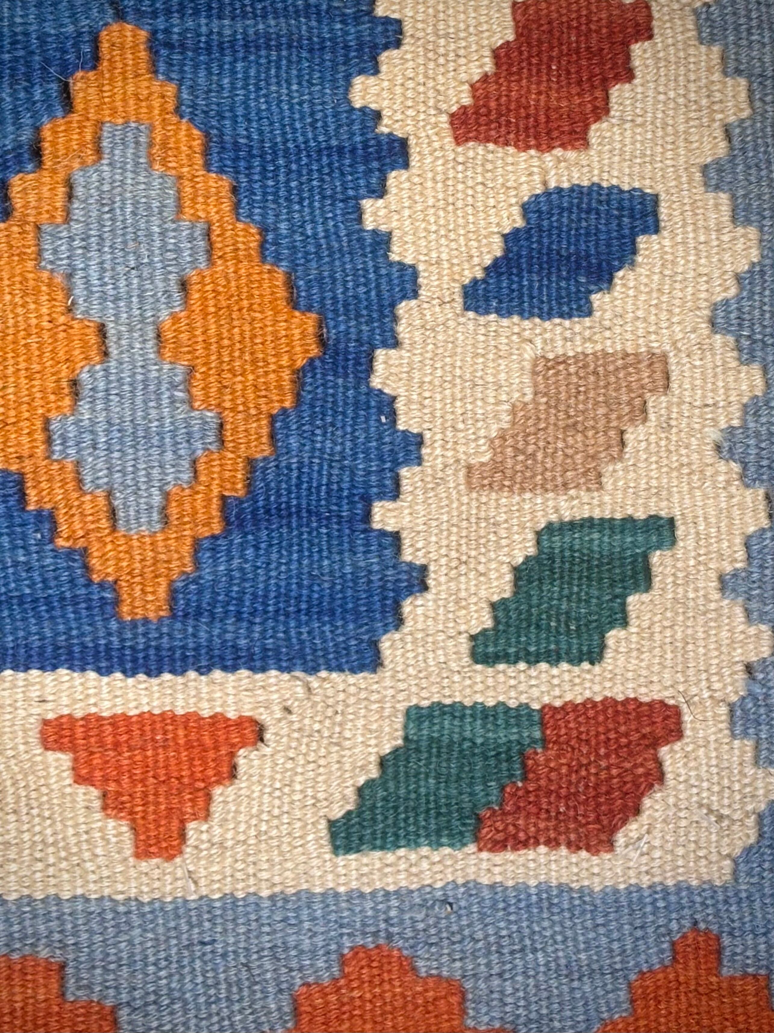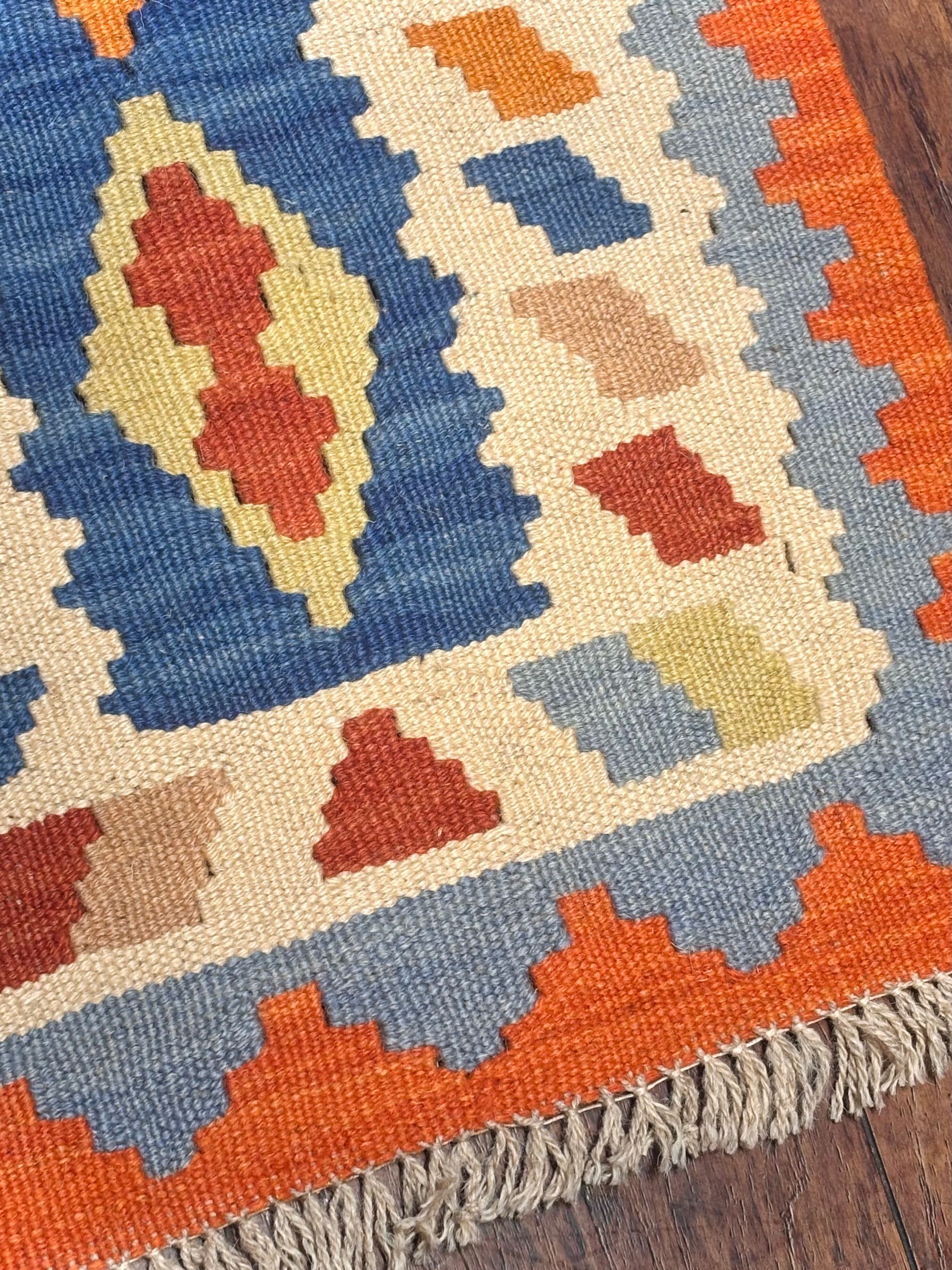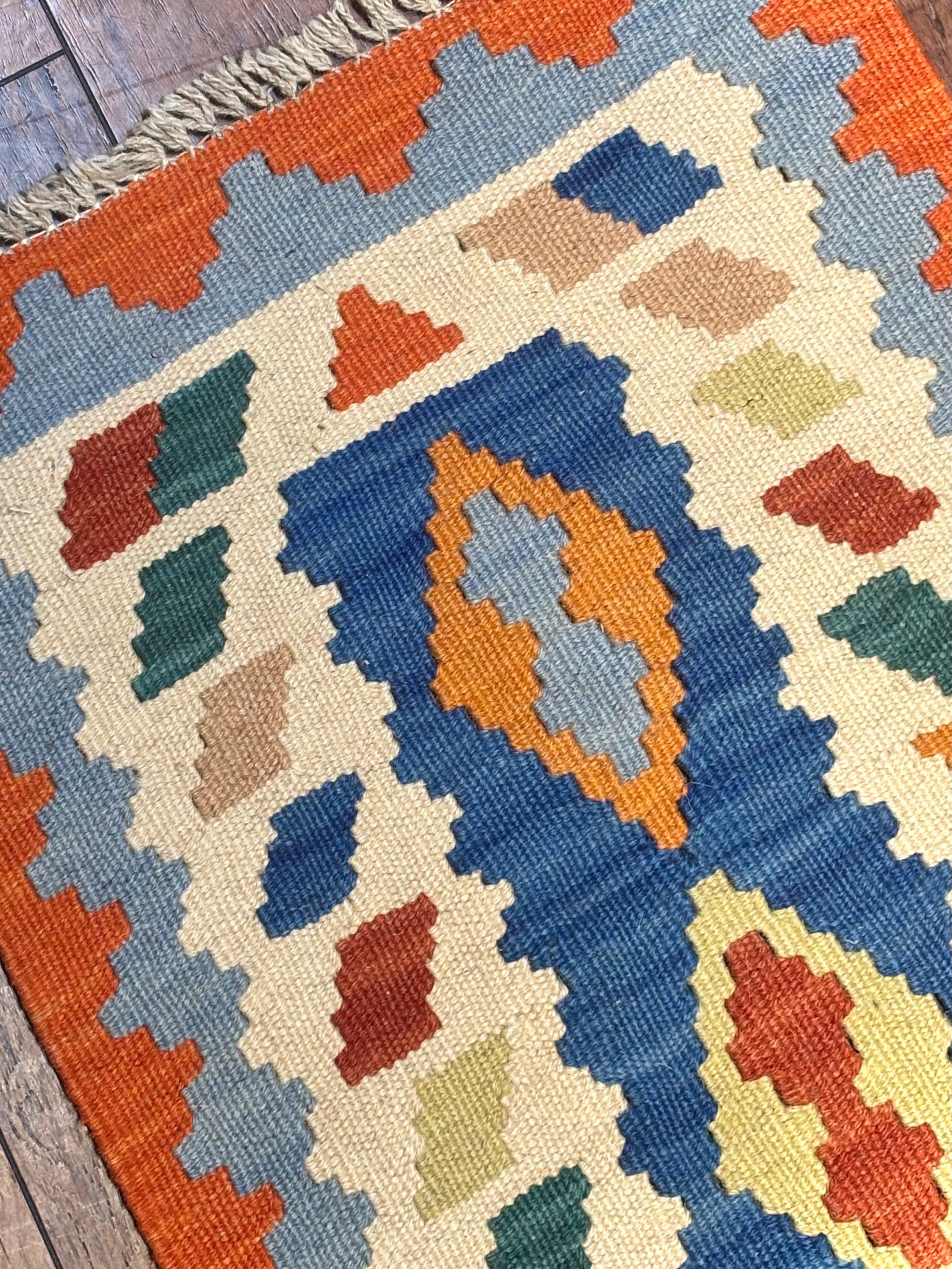 南西イラン・シーラーズ近郊で遊牧生活を営んできたことで知られる、カシュガイ族のキリムです。スタイリッシュなデザインですが、カシュガイ族に由来する伝統的な紋様と南イランらしい明るい色の組み合わせで織られています。デザインを構成する幾何学紋様は、遊牧生活の中で、厄除けや幸福への願いから生まれたものです。薄い織り上がりのキリムですが、ウールで織られているので床の冷たさを感じさせず、暑い季節でもスッキリとしたお使い心地で、オールシーズン活躍します。お玄関マットやベッドサイドとして、洗いやすいのでキッチンマットやワンちゃん、猫ちゃんのコーナーにもオススメです。両面お使いいただけます。