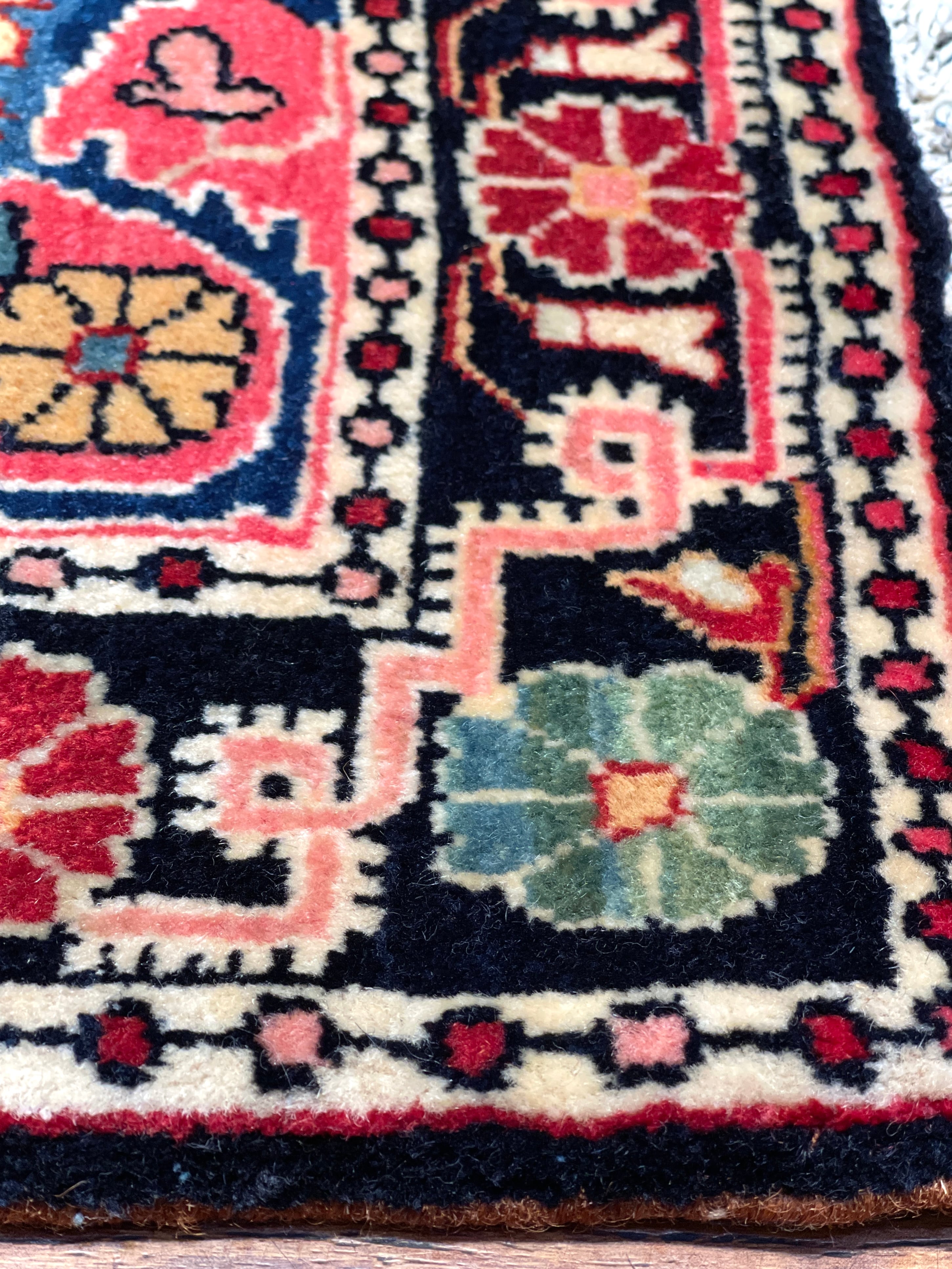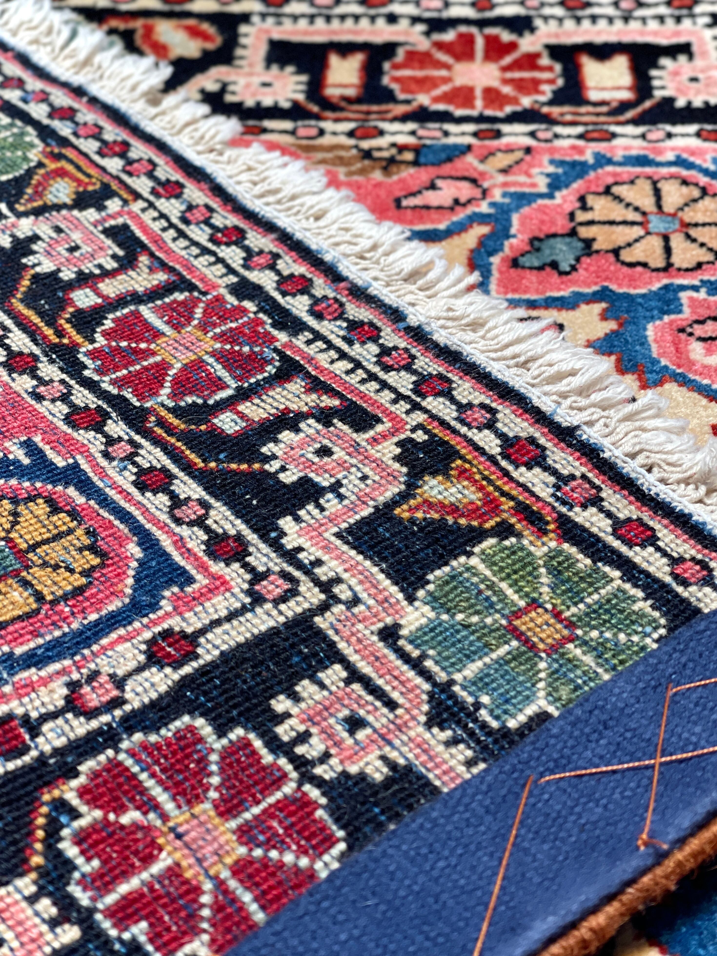 上質なウールで織られた、非常に目の詰まったジョーザンのオールド絨毯です。文字通り隅から隅まで、基調部分からフレームに渡るまでをぎっしりと埋め尽くす、花々のデザインが特徴的な産地です。これは、近隣のサルークと呼ばれる産地のデザインの影響を受けているとされています。