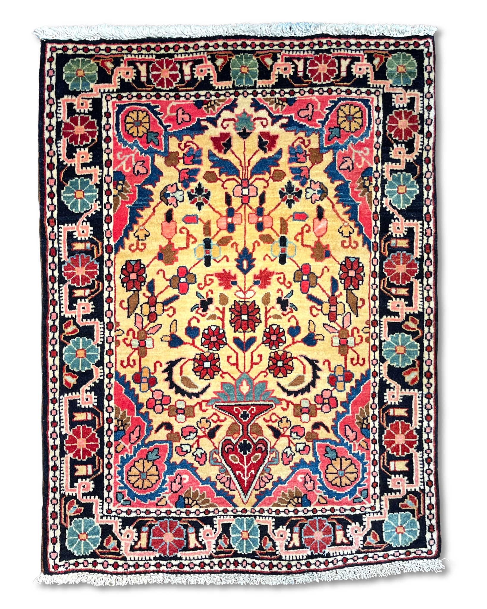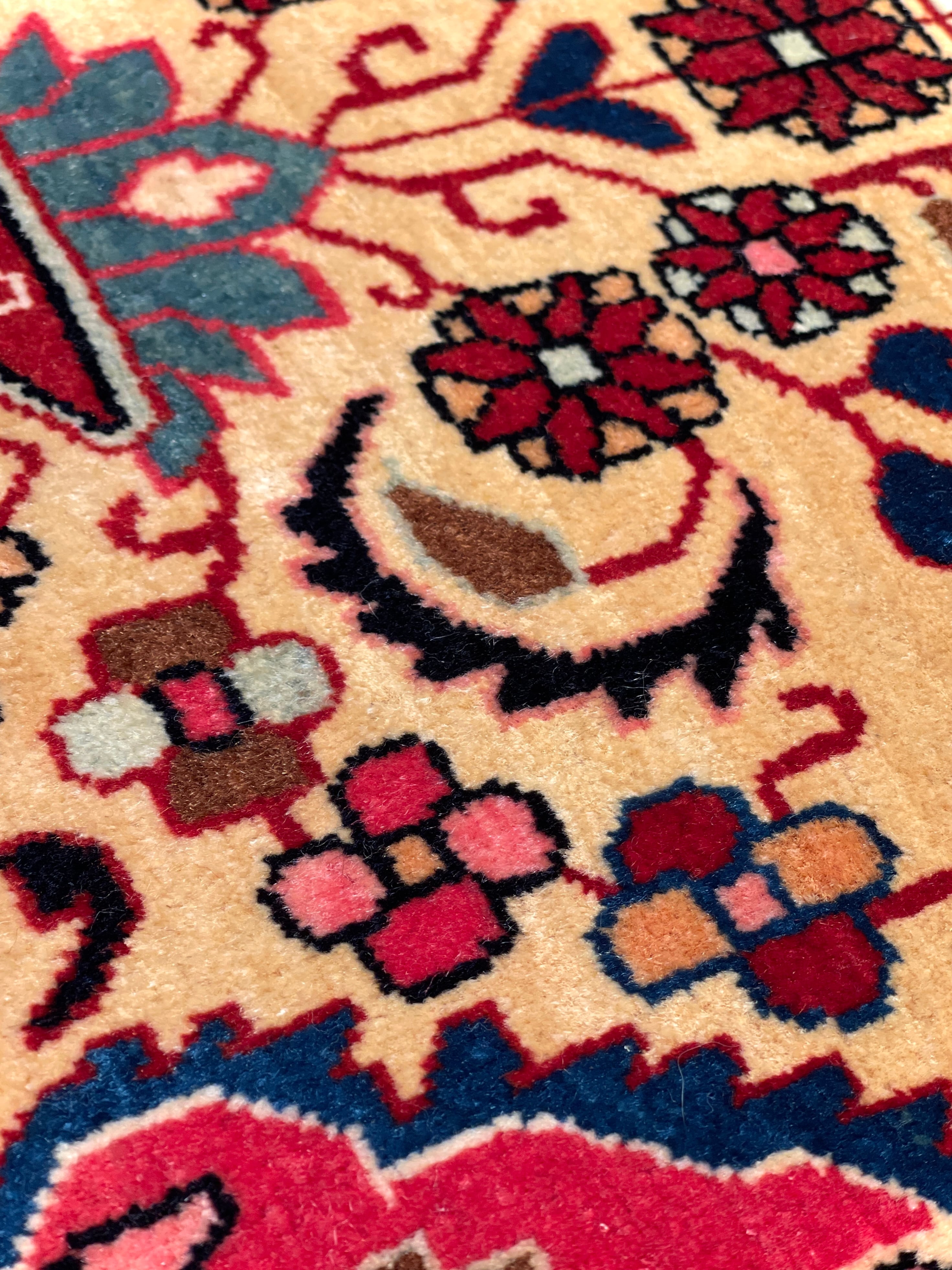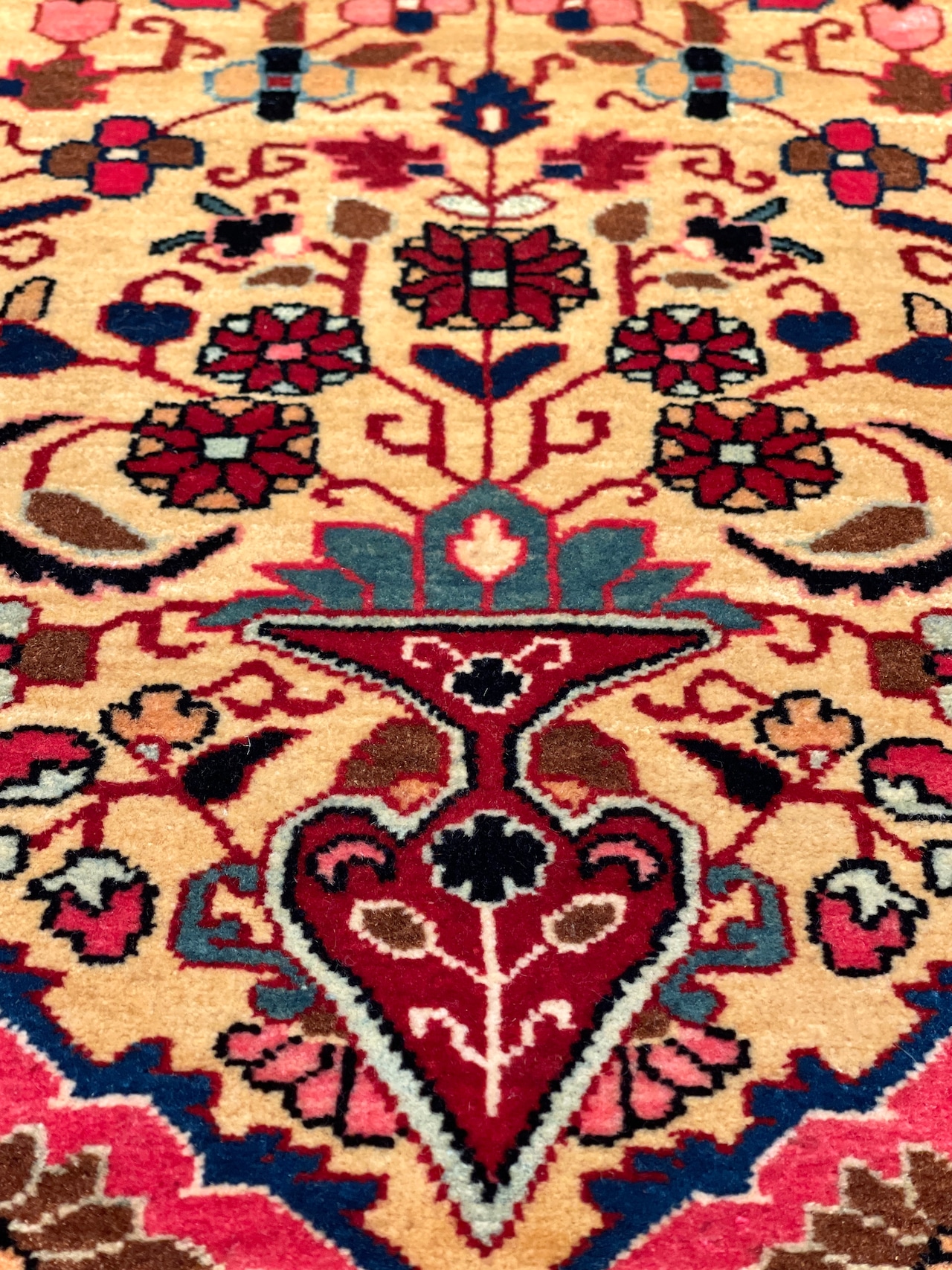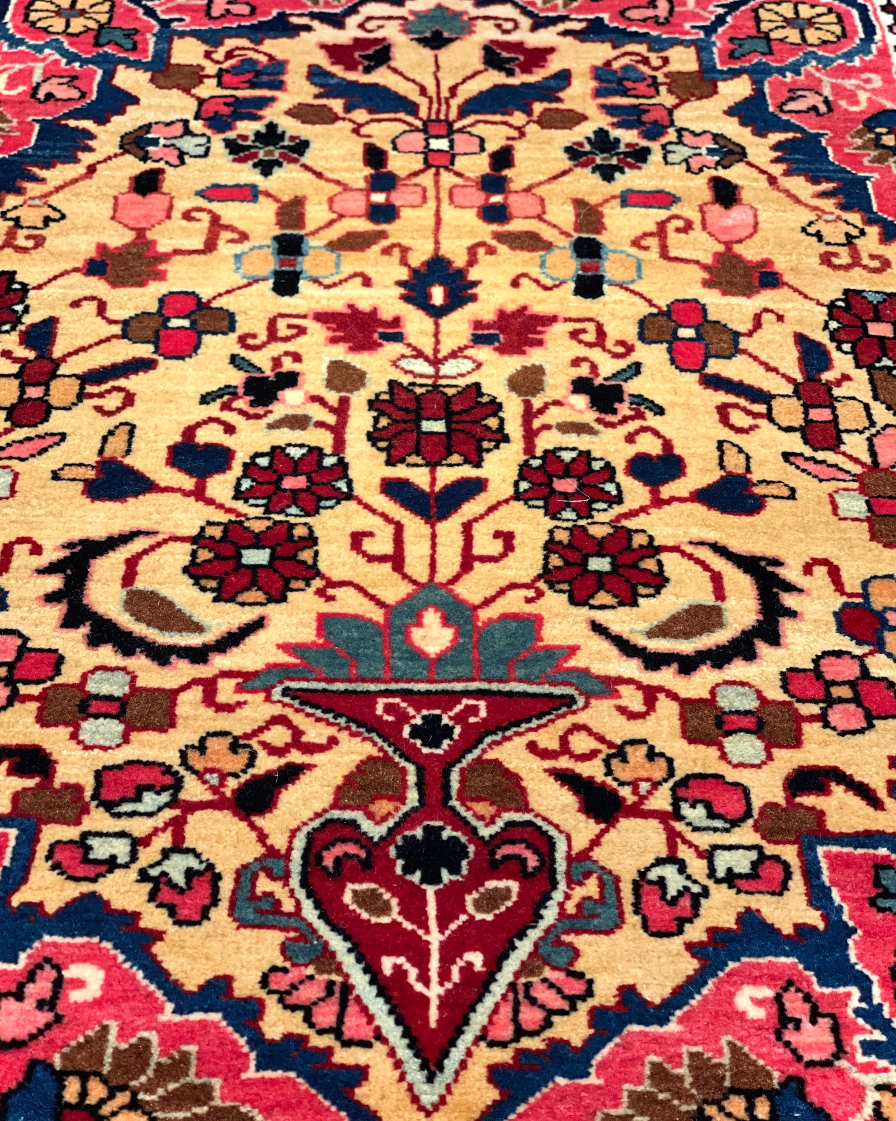 特筆すべきはペルシャの古い絨毯には珍しい「黄色」の基調のお色です。花瓶から溢れ出すような幸福なオーラが、上質なウールの艶と共にいっぱいに広がっています。