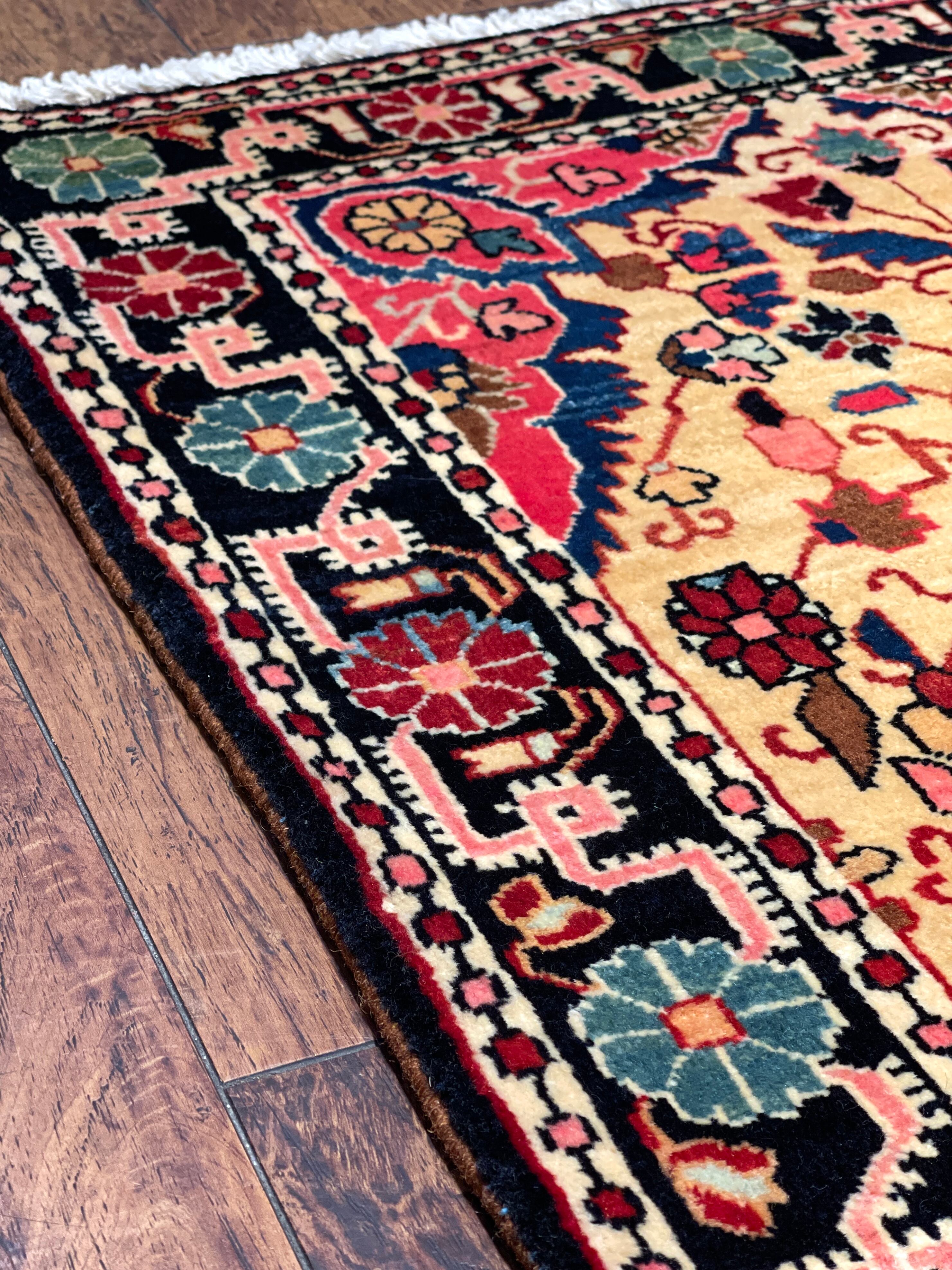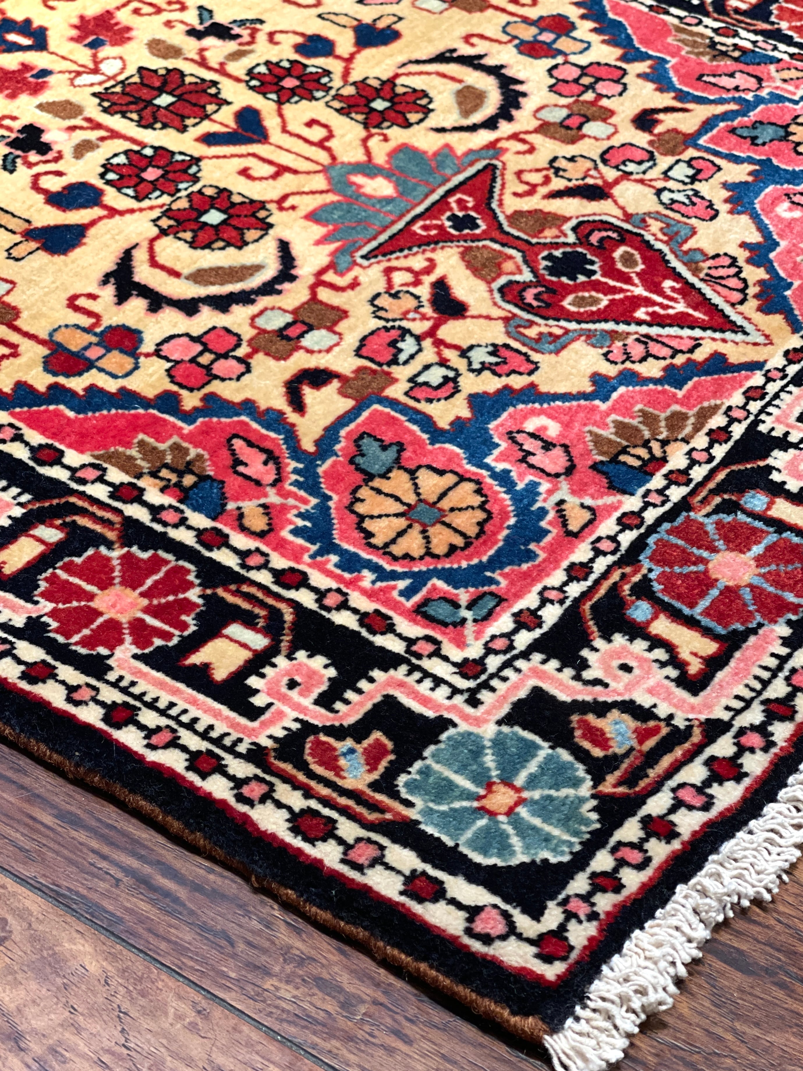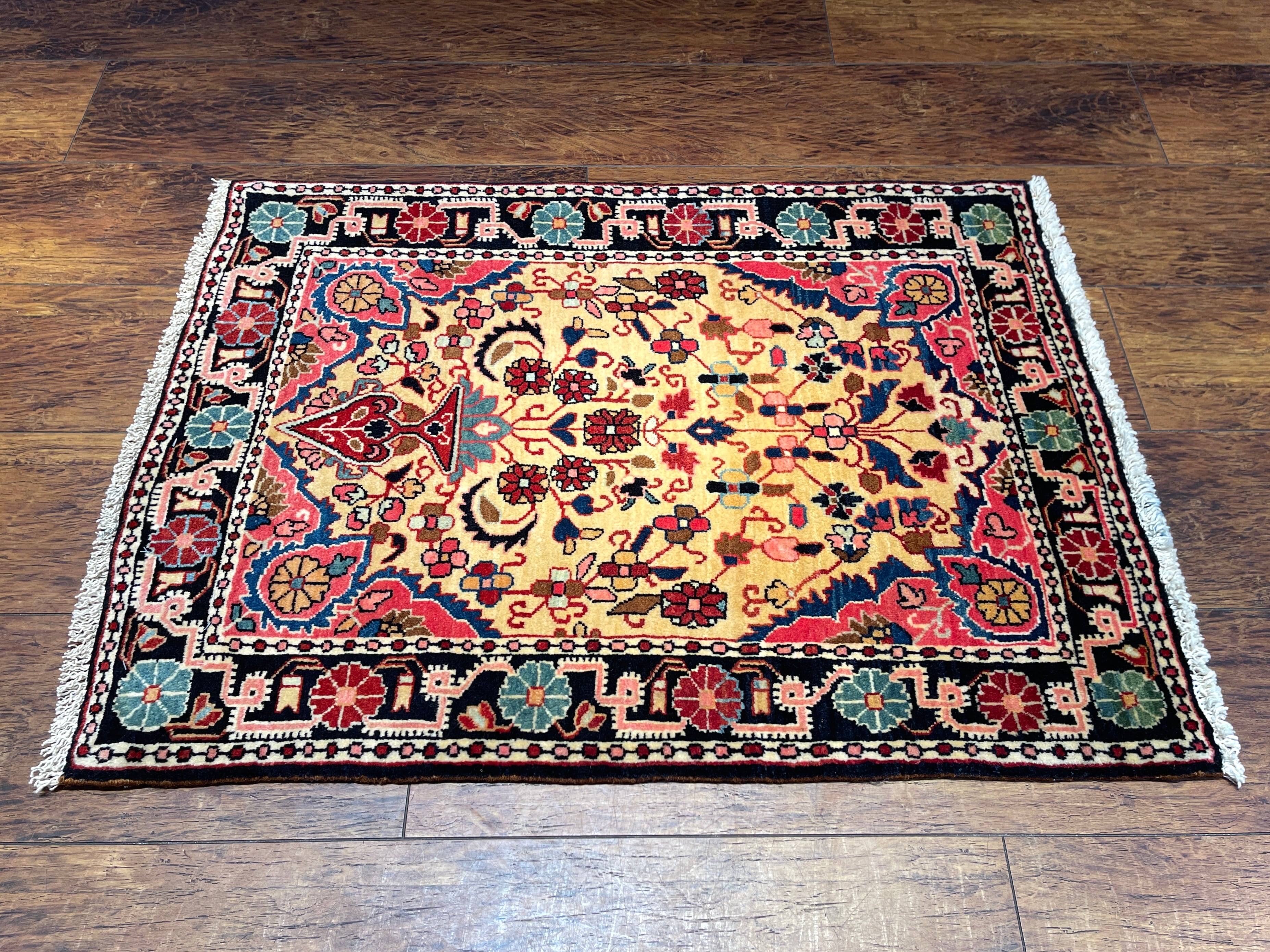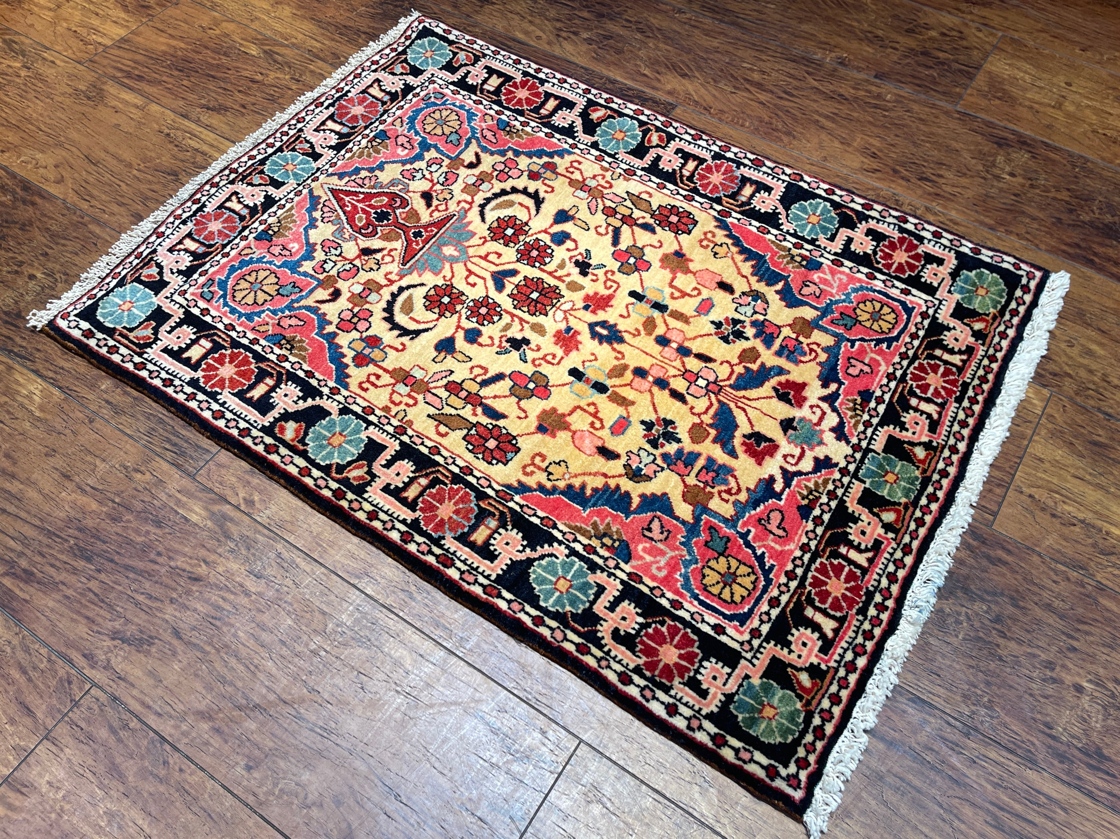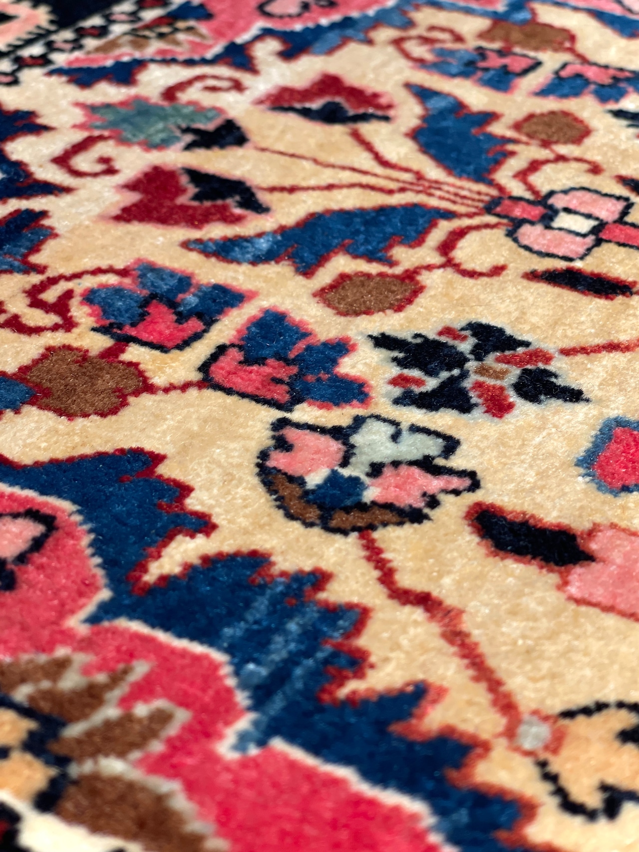 特筆すべきはペルシャの古い絨毯には珍しい「黄色」の基調のお色です。花瓶から溢れ出すような幸福なオーラが、上質なウールの艶と共にいっぱいに広がっています。