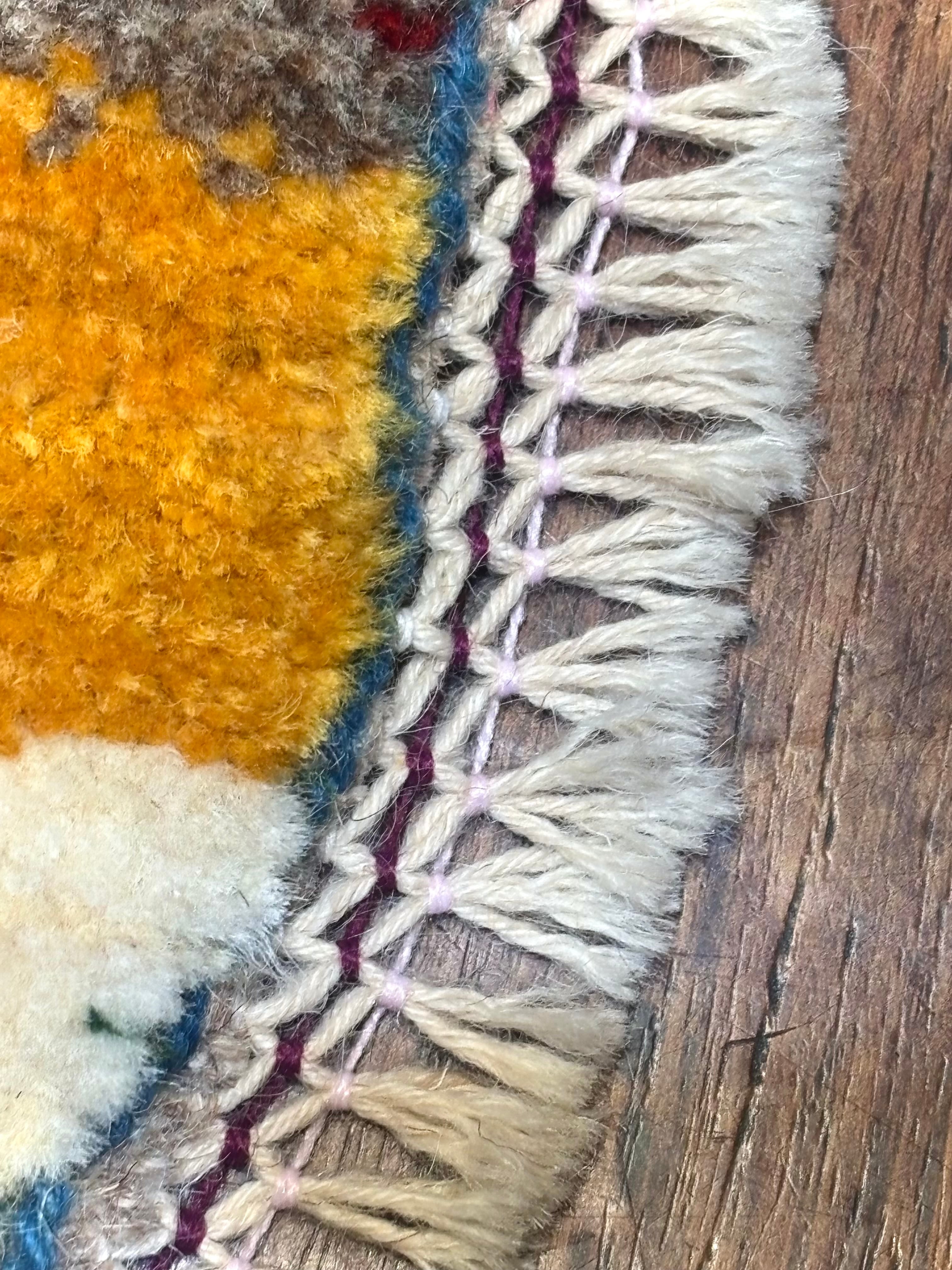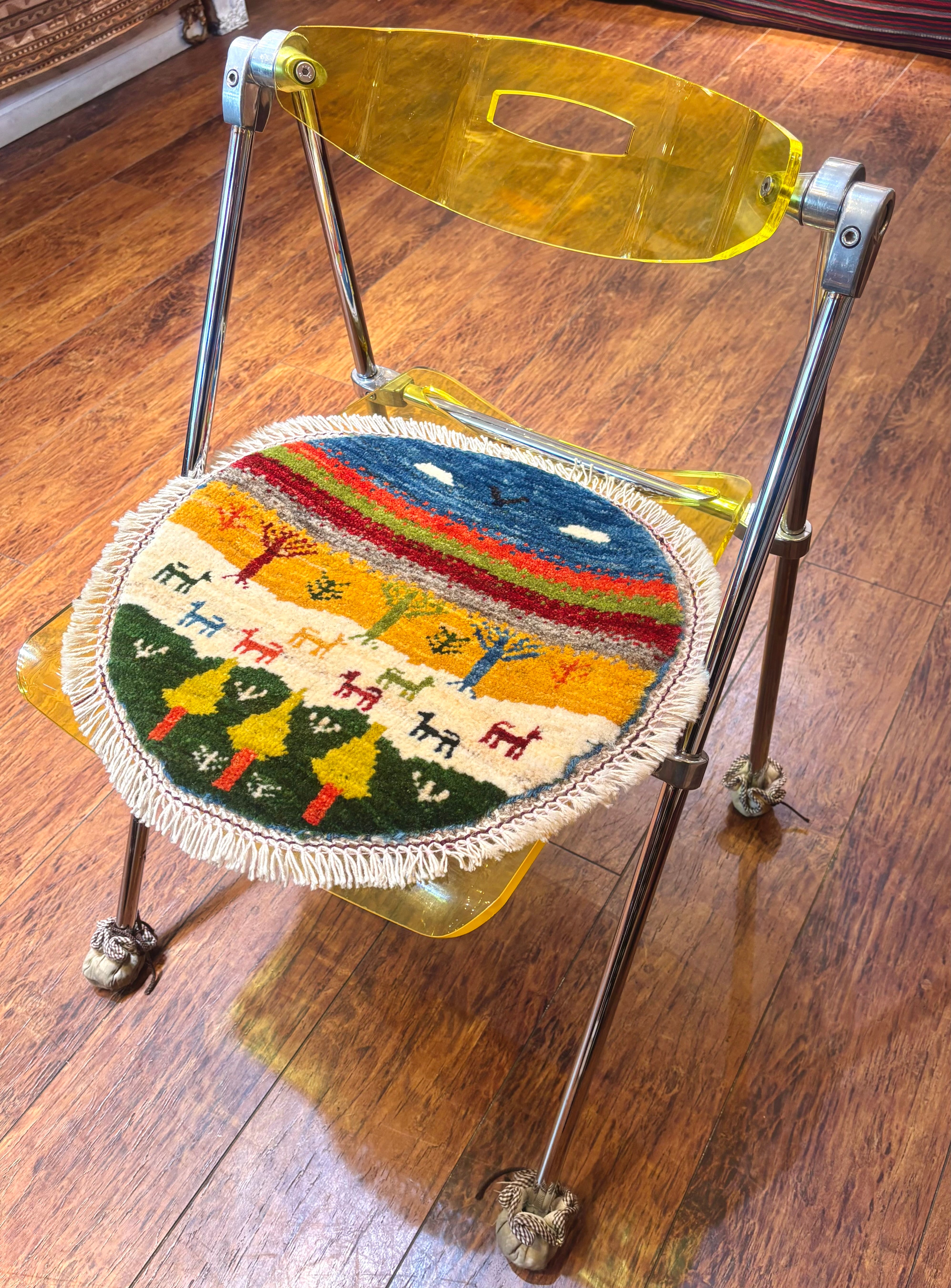 通常タイプのお椅子の座面にお使い頂いても、自然に見えるサイズ感です。座面が円形のお椅子には、是非丸いミニギャッベを合わせたいですね!周囲にフサがつくと、より華やかな印象になります♪