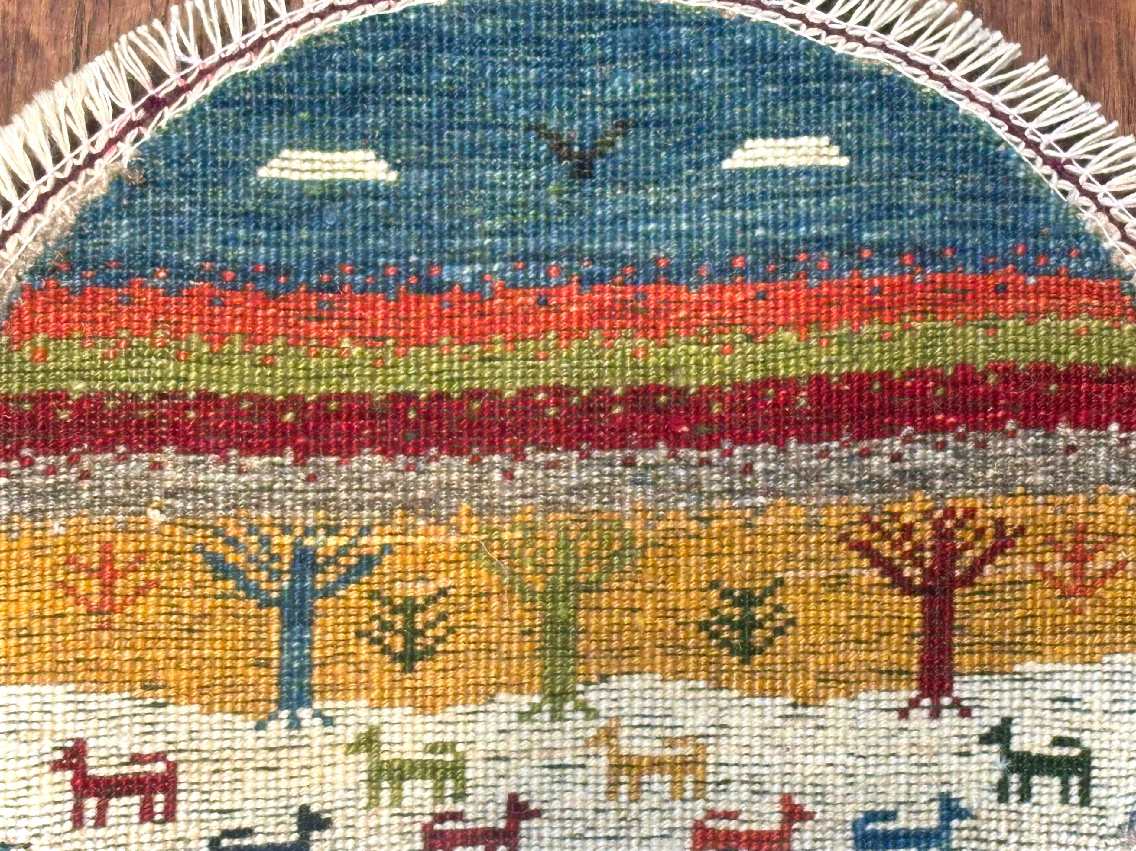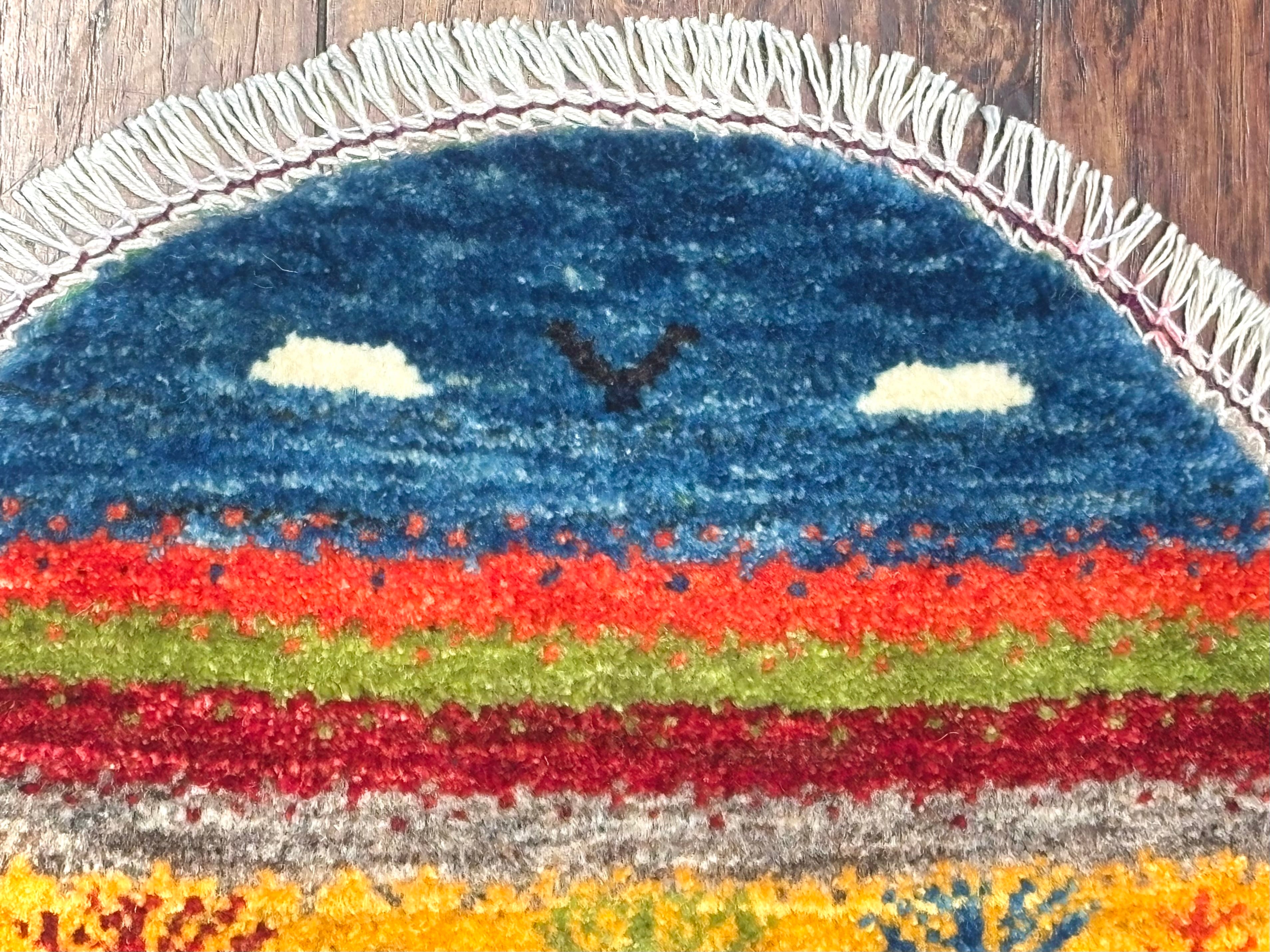 当店では、〈正方形〉と〈円形〉の2種類のタイプのミニギャッベをご用意致しております。円形タイプは、より細めの上質なウールが用いられていることから、織りが細かく、曲線や細密な表現が活かされた景色や動物(ライオン・ラクダ)など、個性的なデザインが揃います。