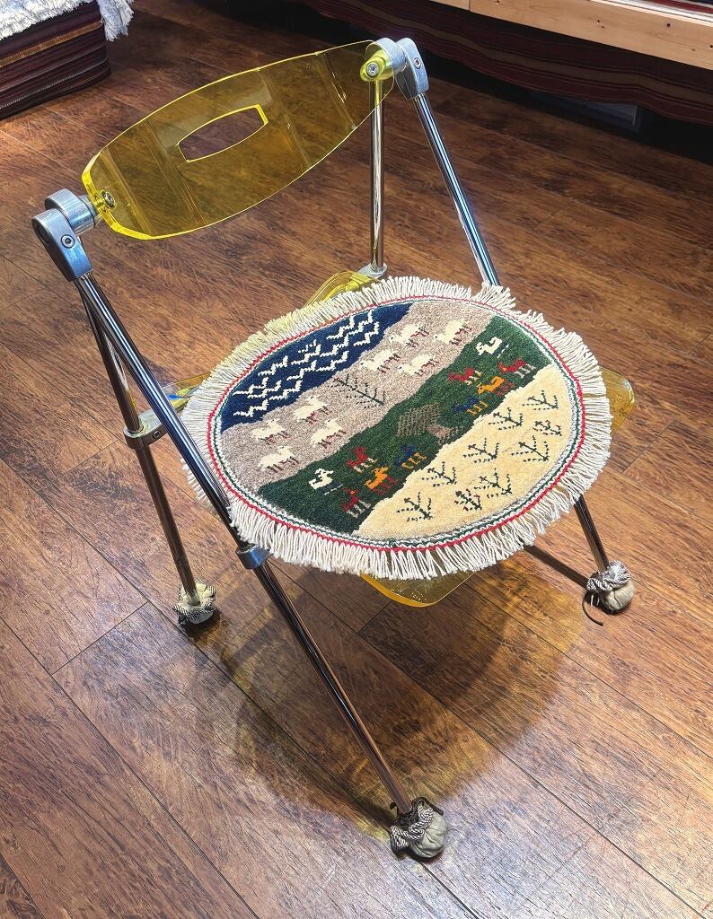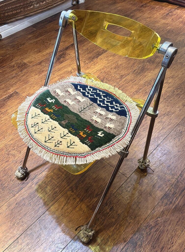 通常タイプのお椅子の座面にお使い頂いても、自然に見えるサイズ感です。座面が円形のお椅子には、是非丸いミニギャッベを合わせたいですね!周囲にフサがつくと、より華やかな印象になります♪