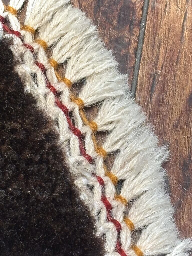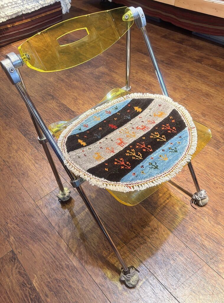 通常タイプのお椅子の座面にお使い頂いても、自然に見えるサイズ感です。座面が円形のお椅子には、是非丸いミニギャッベを合わせたいですね!周囲にフサがつくと、より華やかな印象になります♪