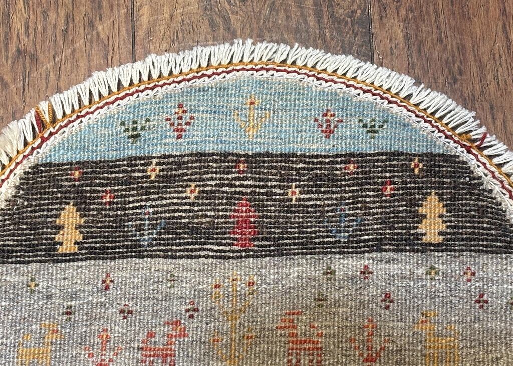 当店では、〈正方形〉と〈円形〉の2種類のタイプのミニギャッベをご用意致しております。円形タイプは、より細めの上質なウールが用いられていることから、織りが細かく、曲線や細密な表現が活かされた景色や動物(ライオン・ラクダ)など、個性的なデザインが揃います。