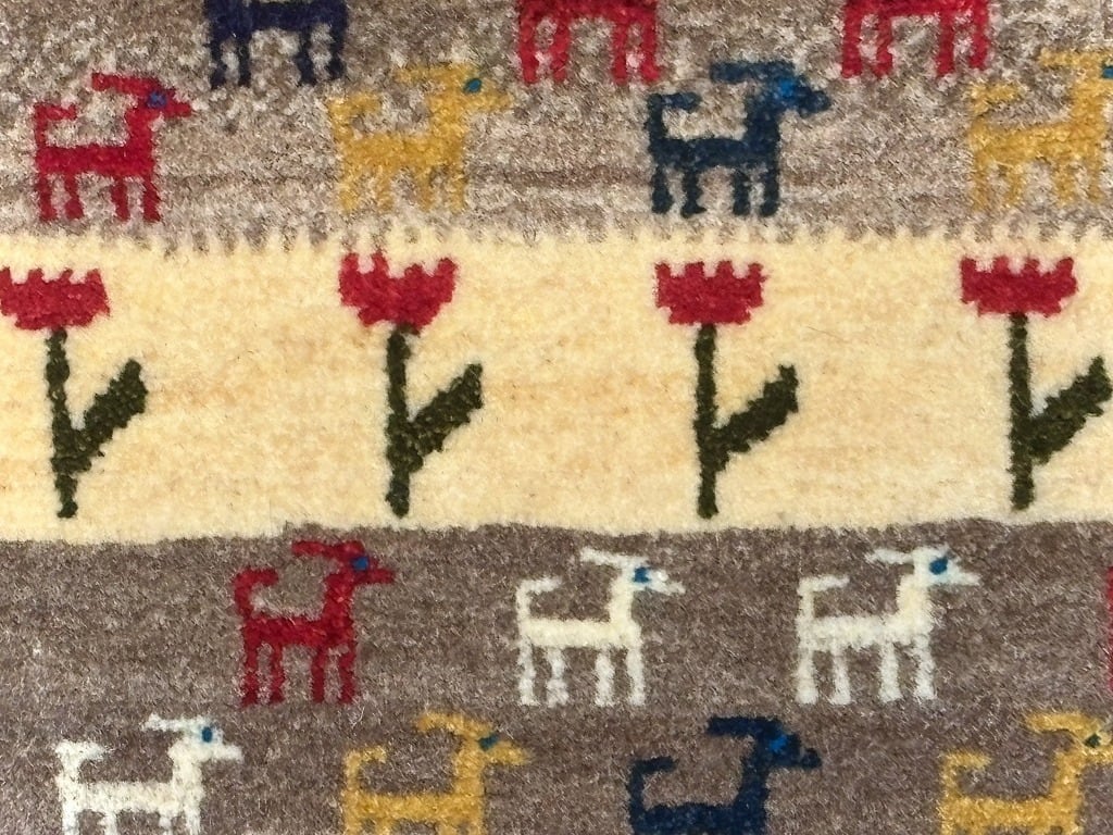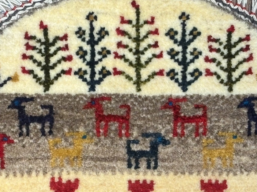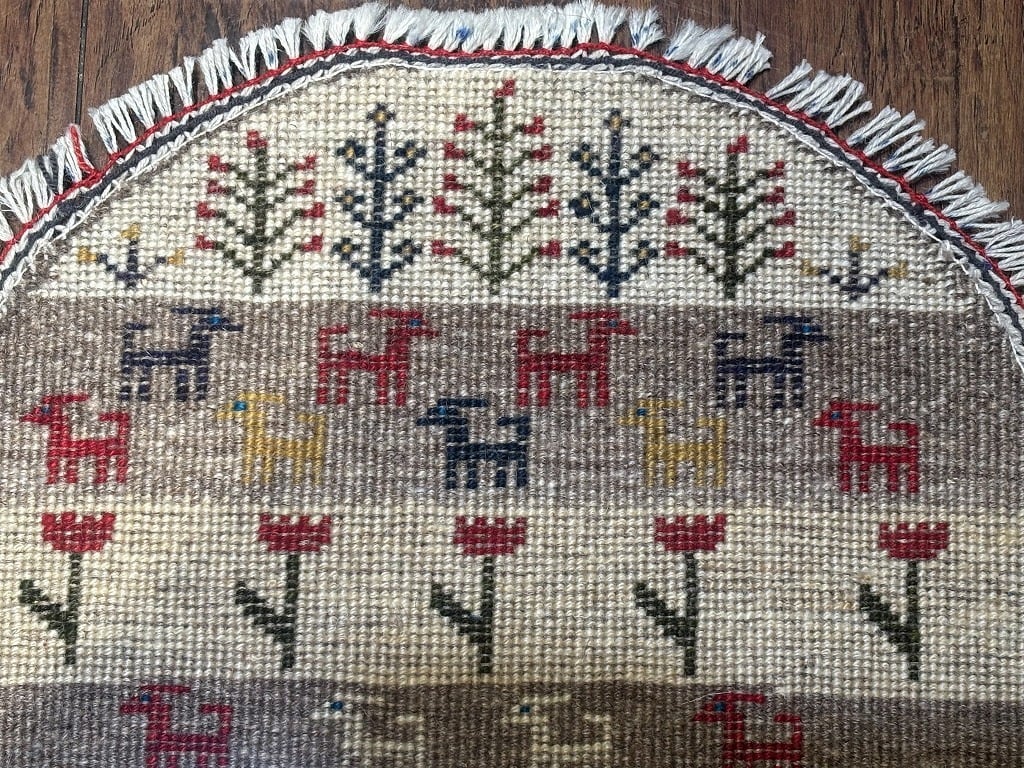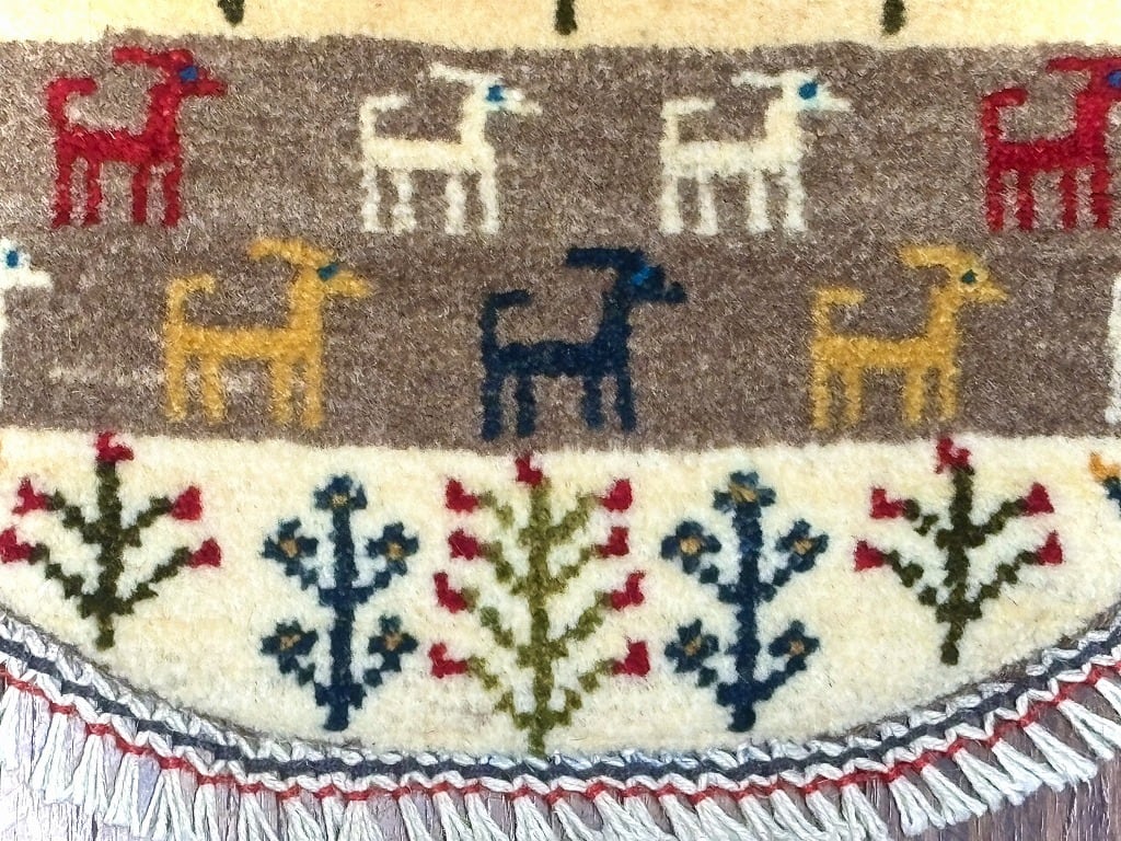 当店では、〈正方形〉と〈円形〉の2種類のタイプのミニギャッベをご用意致しております。円形タイプは、より細めの上質なウールが用いられていることから、織りが細かく、曲線や細密な表現が活かされた景色や動物(ライオン・ラクダ)など、個性的なデザインが揃います。