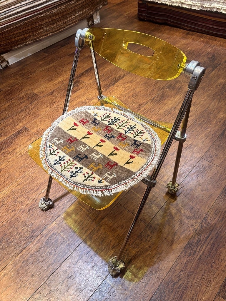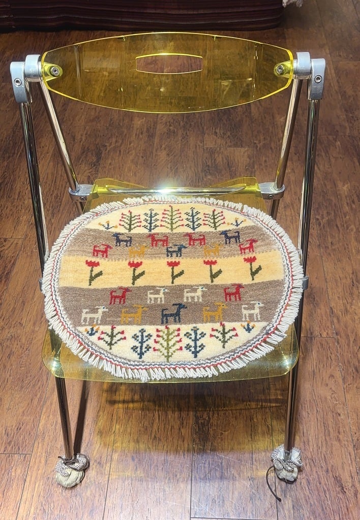 通常タイプのお椅子の座面にお使い頂いても、自然に見えるサイズ感です。座面が円形のお椅子には、是非丸いミニギャッベを合わせたいですね!周囲にフサがつくと、より華やかな印象になります♪