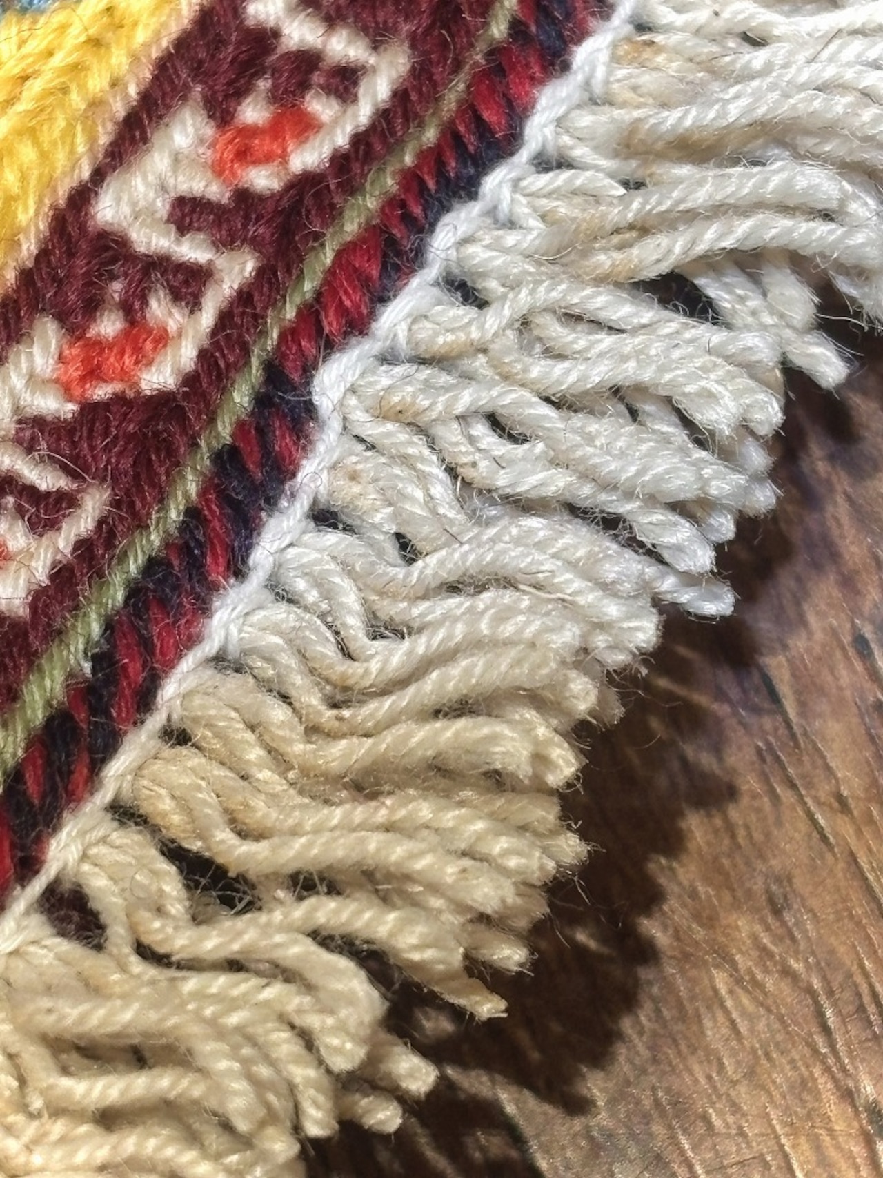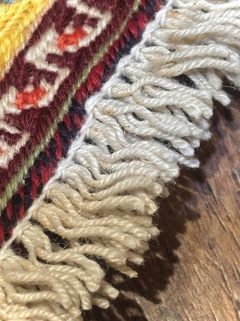 「コルクウール」と呼ばれる羊の肩〜首回りの、細くしなやかな毛を用いて織られた、大変上質な肌触りのキリムです。他の産地のキリムと比較して、上下にフサとして出ている縦糸の本数が多く、またその毛がふんわりとしていることが、素材と織りの良さを物語っています。