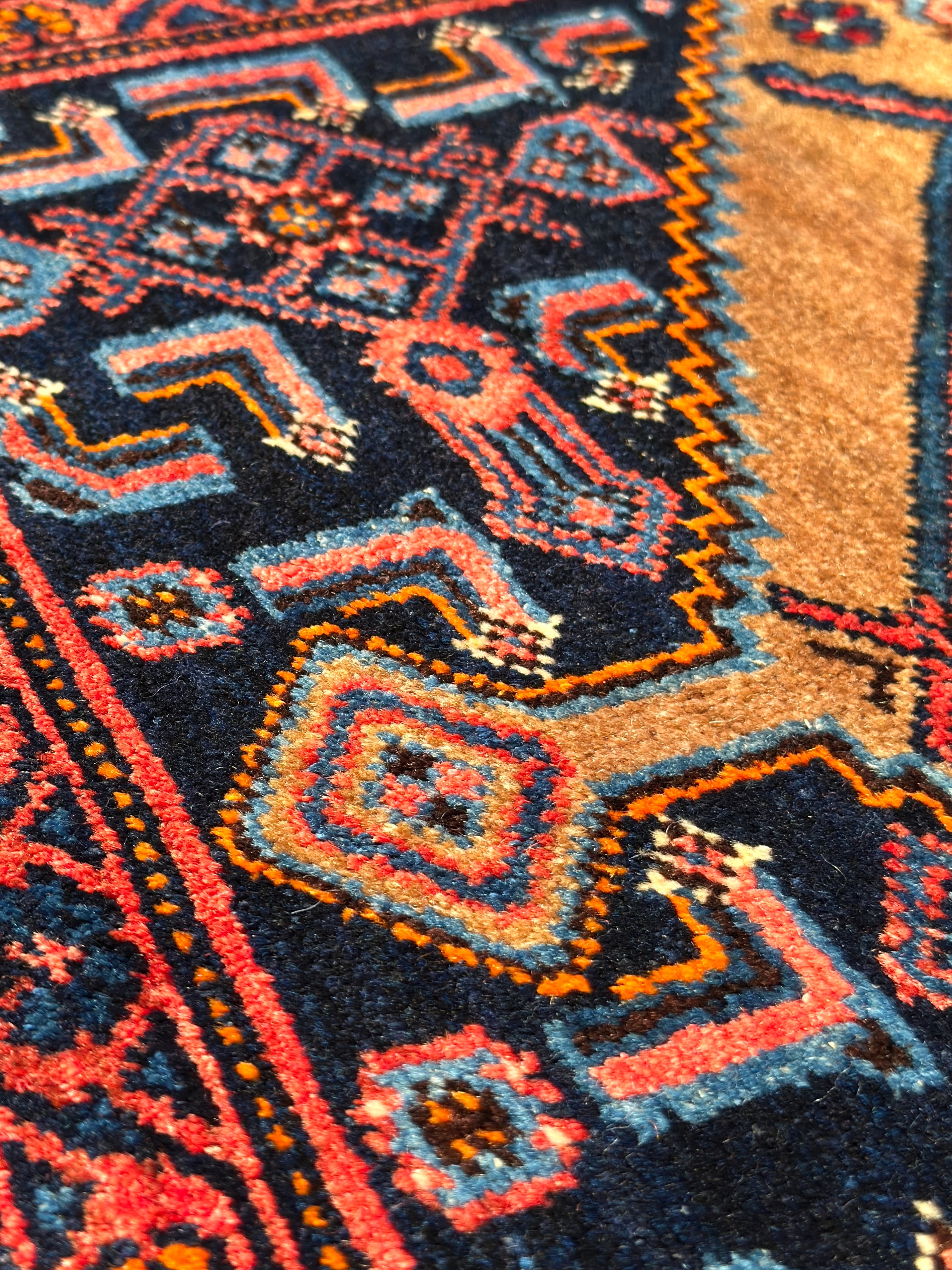 デザインは菱形のシルエットに花が収められ、コーナーに配されたポテっとしたフォルムの大ぶりなマヒ紋様がハマダンらしいポイント。オールド絨毯ならではの温もりが感じられます。