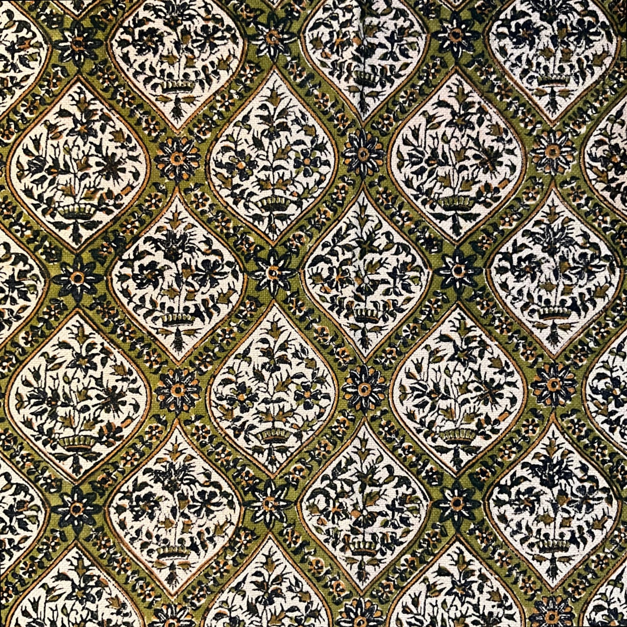 梨の木を彫った木型を使って染められたハンドプリントの綿100%の更紗です。