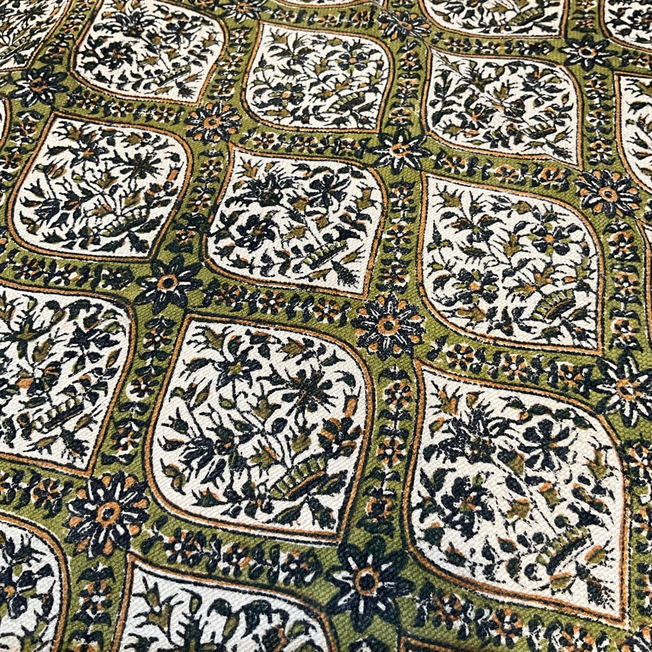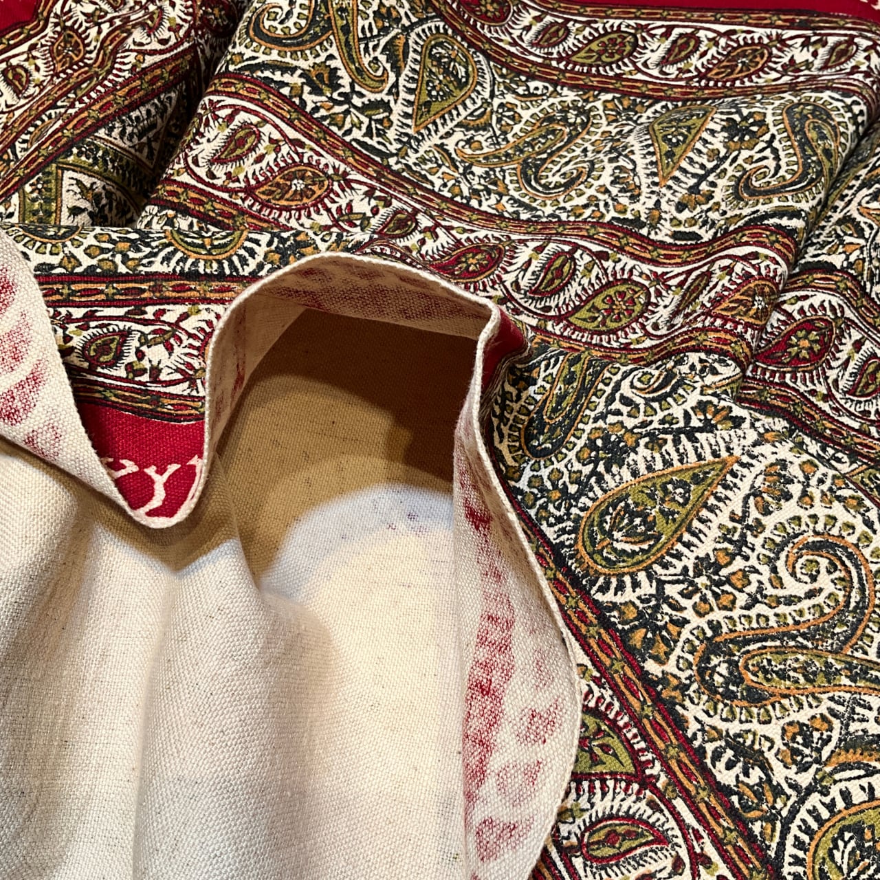 ペルシャ更紗は、イランの古都イスファハンで、伝統的な手法で作られているハンドプリントの手工芸品です。ペルシャ語では「ガラムカーリ」と呼ばれます。更紗職人により、梨の木を繰り抜いて作られた木判で、押し染めを繰り返してデザインを作っていきます。紋様を一つ完成させるのにも、異なる型判や色を塗り替えて押すので、紋様が出来上がるまでには4〜5回もの作業を必要とします。