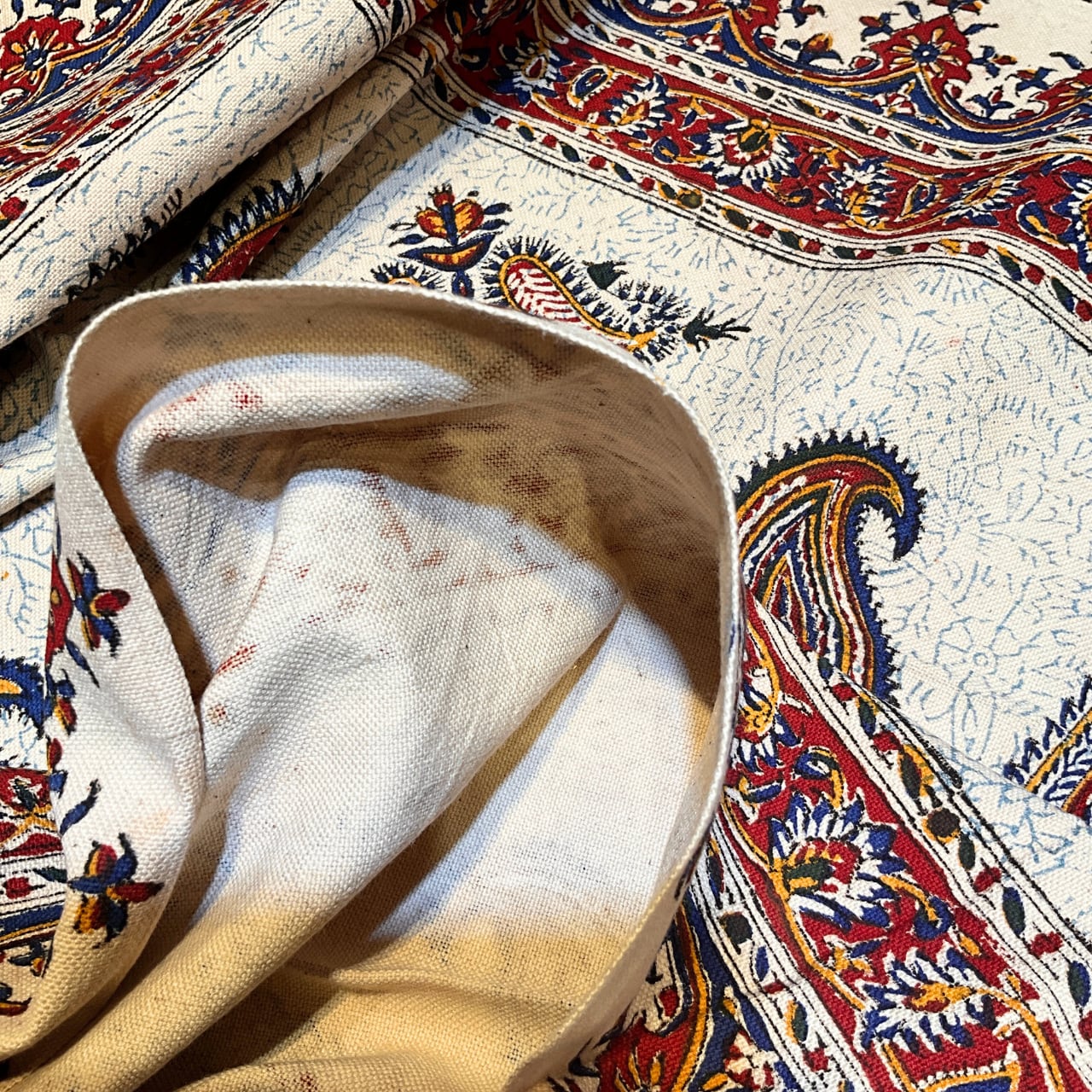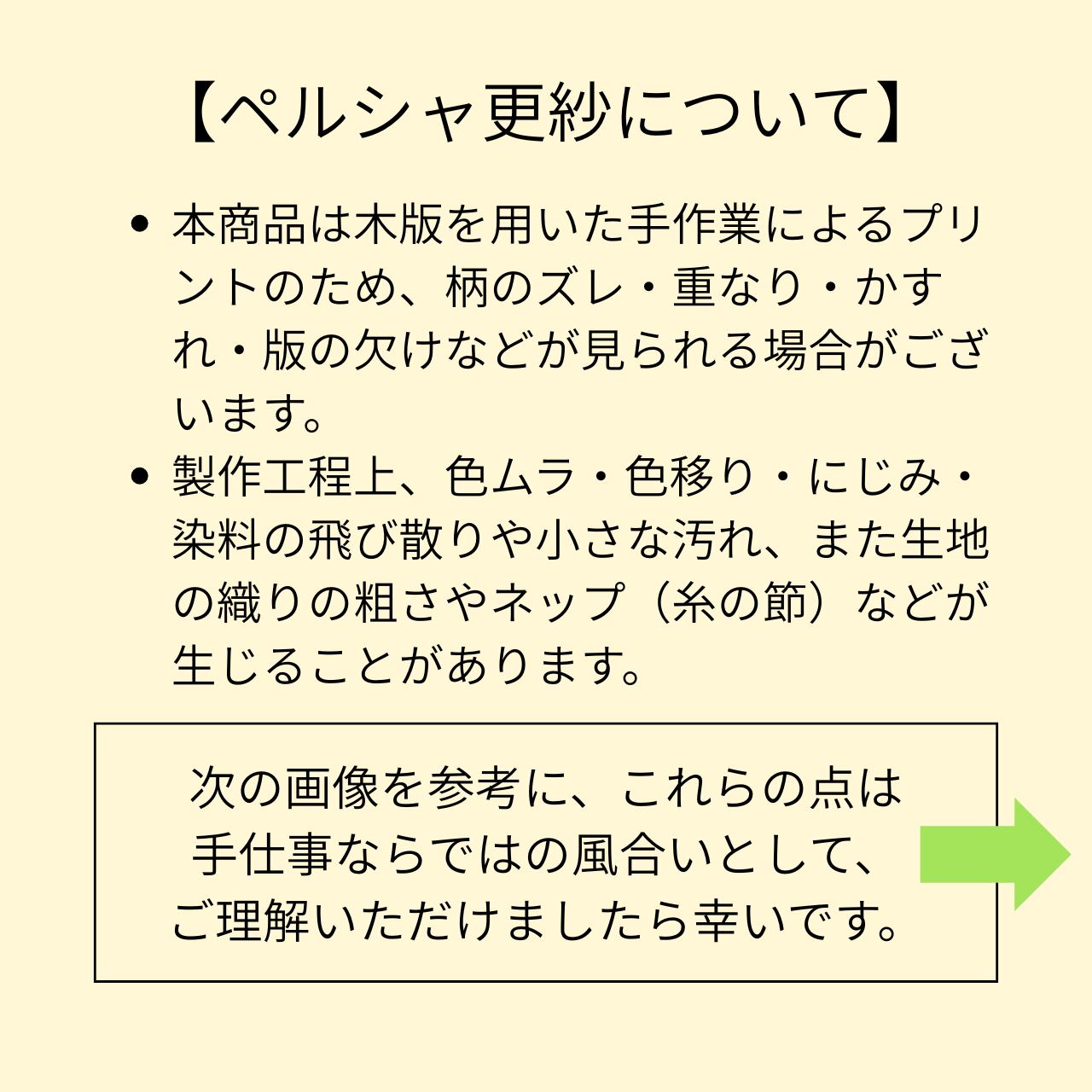 ペルシャ更紗は、イランの古都イスファハンで、伝統的な手法で作られているハンドプリントの手工芸品です。ペルシャ語では「ガラムカーリ」と呼ばれます。更紗職人により、梨の木を繰り抜いて作られた木判で、押し染めを繰り返してデザインを作っていきます。紋様を一つ完成させるのにも、異なる型判や色を塗り替えて押すので、紋様が出来上がるまでには4〜5回もの作業を必要とします。