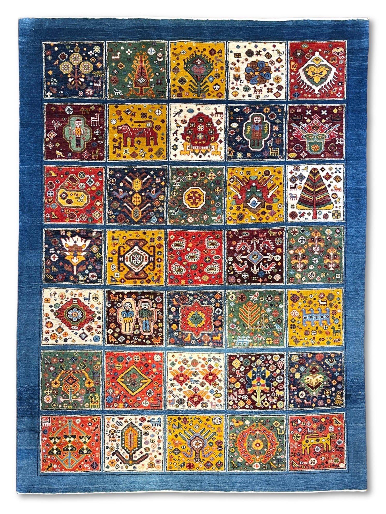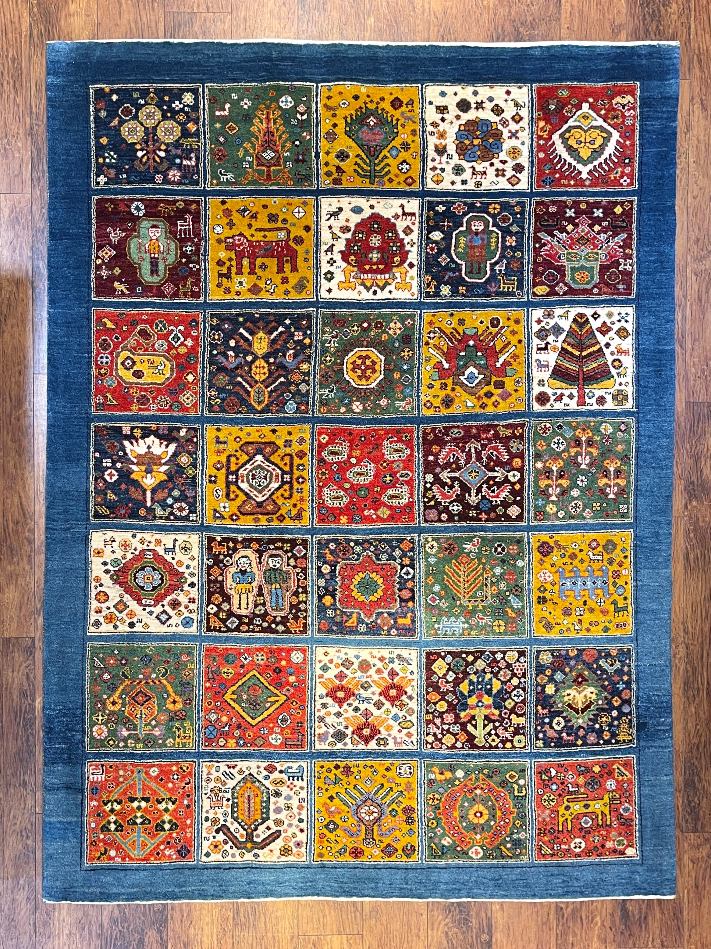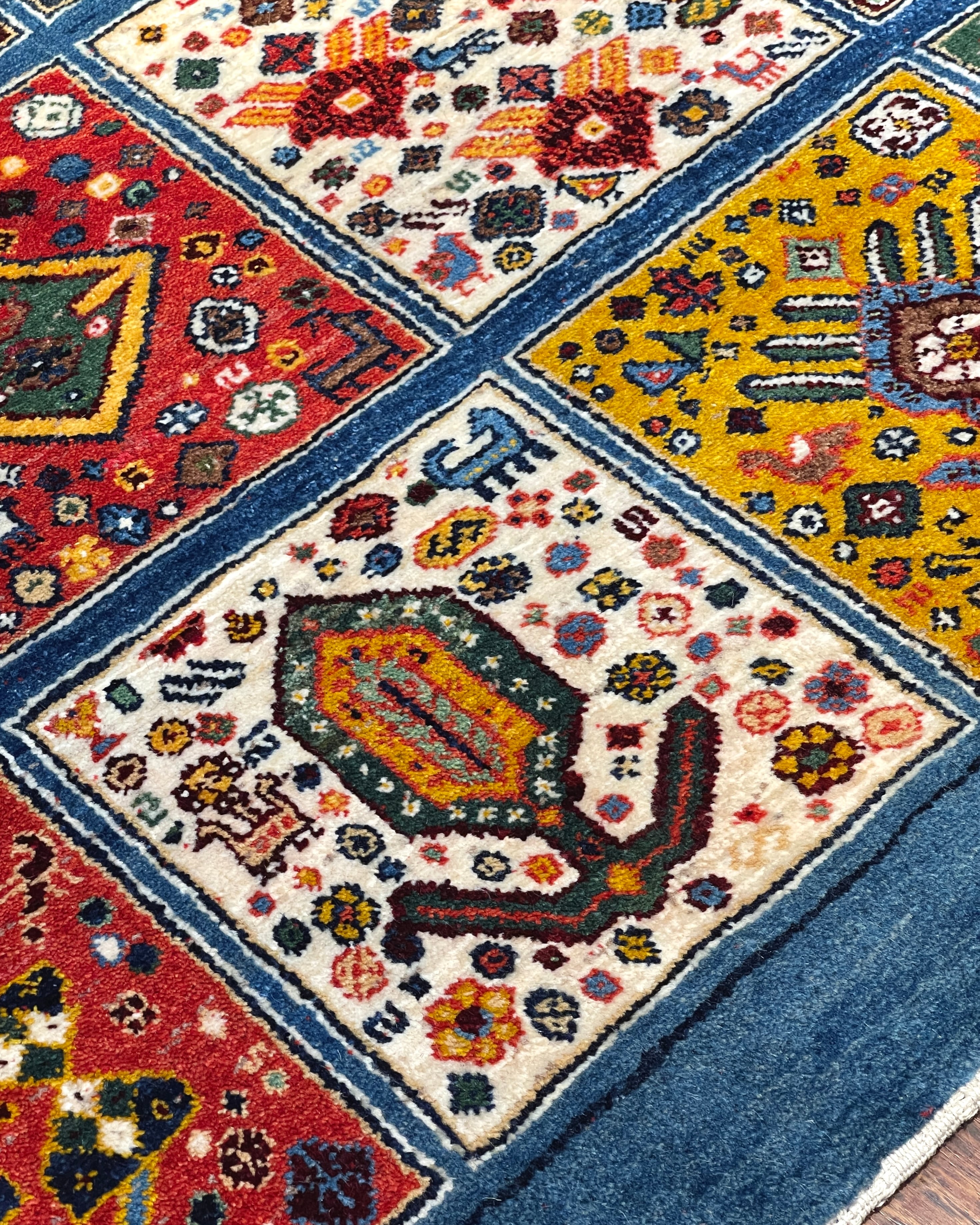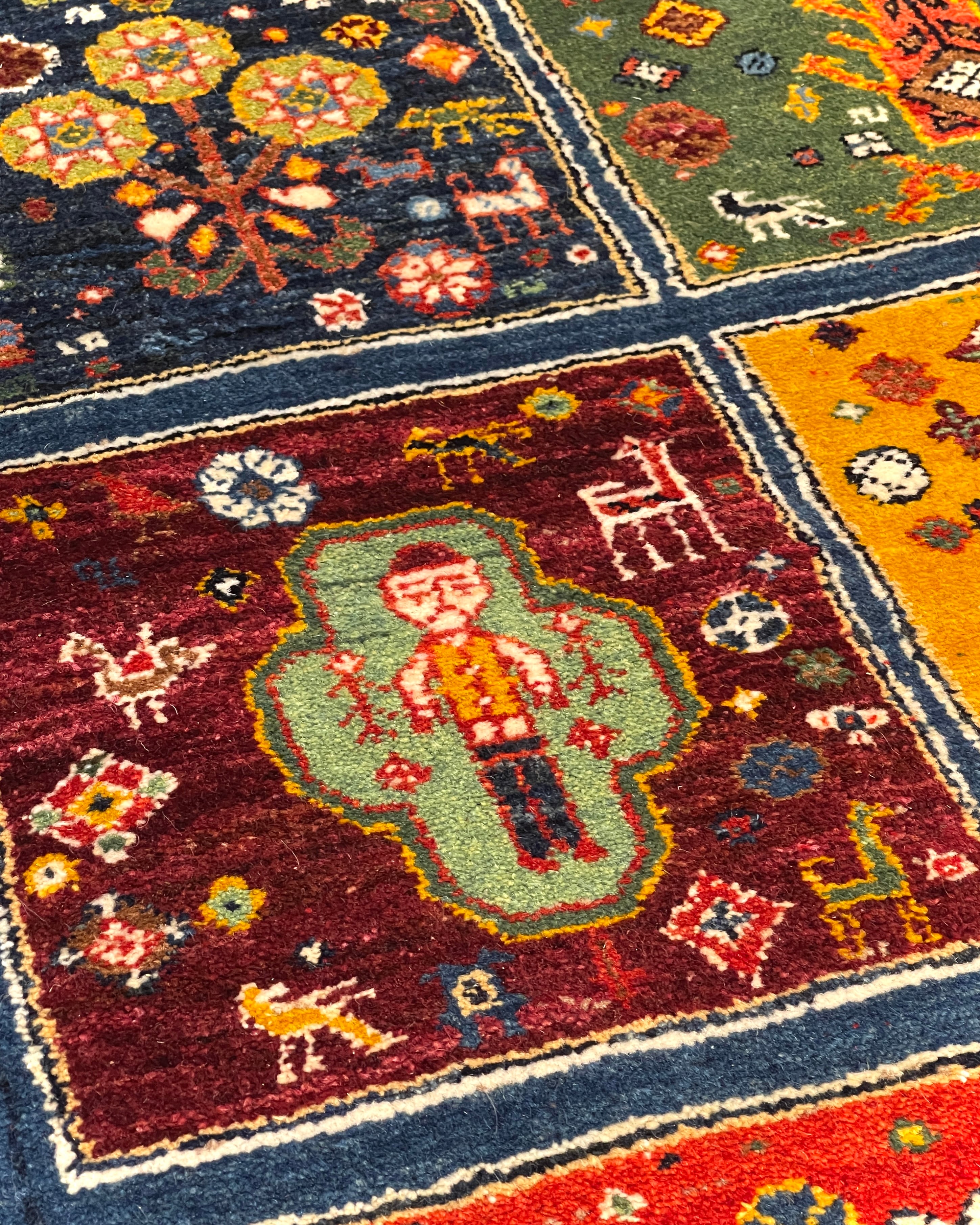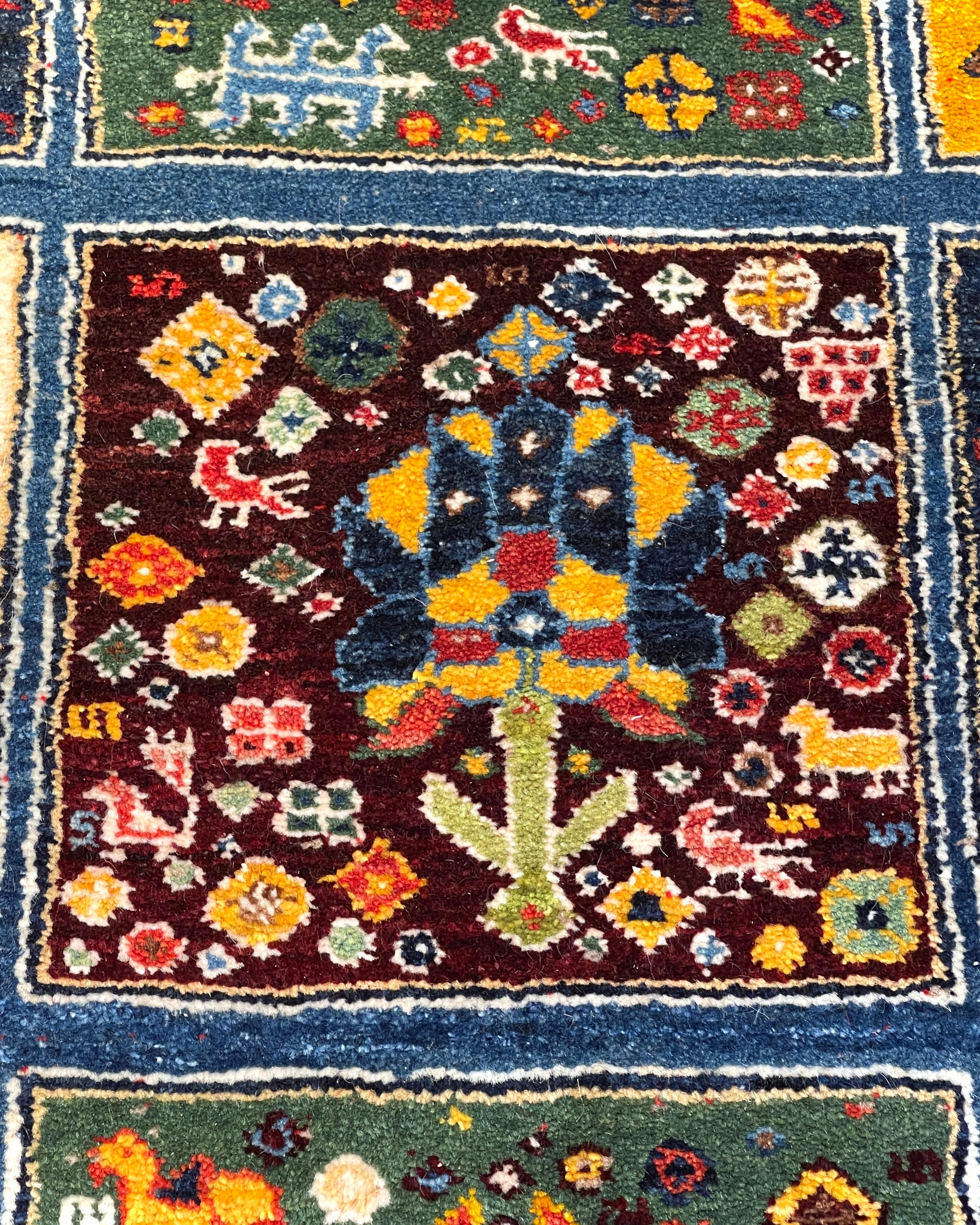 ペルシャ語で『ヘシティ』と呼ばれる、格子柄のデザインのギャッベです。一枠毎に異なるモチーフが収められ、まるで絵本のページをめくるかのよう。ワクワクするデザインとなっております。ご家族やお迎えするお客様との会話も、自然と弾み楽しいひと時を過ごせること間違いなしの一枚となっております。