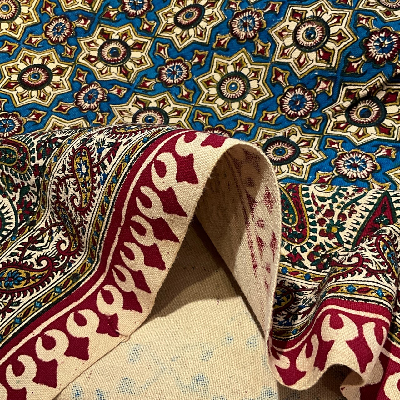 ペルシャ更紗は、イランの古都イスファハンで、伝統的な手法で作られているハンドプリントの手工芸品です。ペルシャ語では「ガラムカーリ」と呼ばれます。更紗職人により、梨の木を繰り抜いて作られた木判で、押し染めを繰り返してデザインを作っていきます。紋様を一つ完成させるのにも、異なる型判や色を塗り替えて押すので、紋様が出来上がるまでには4〜5回もの作業を必要とします。