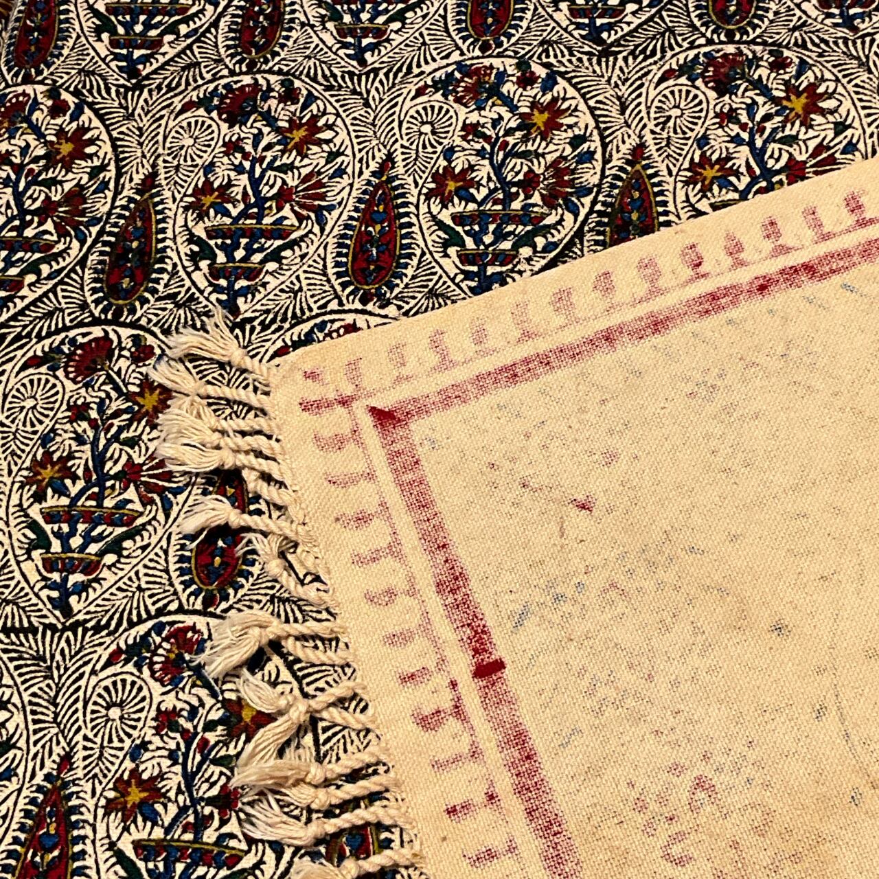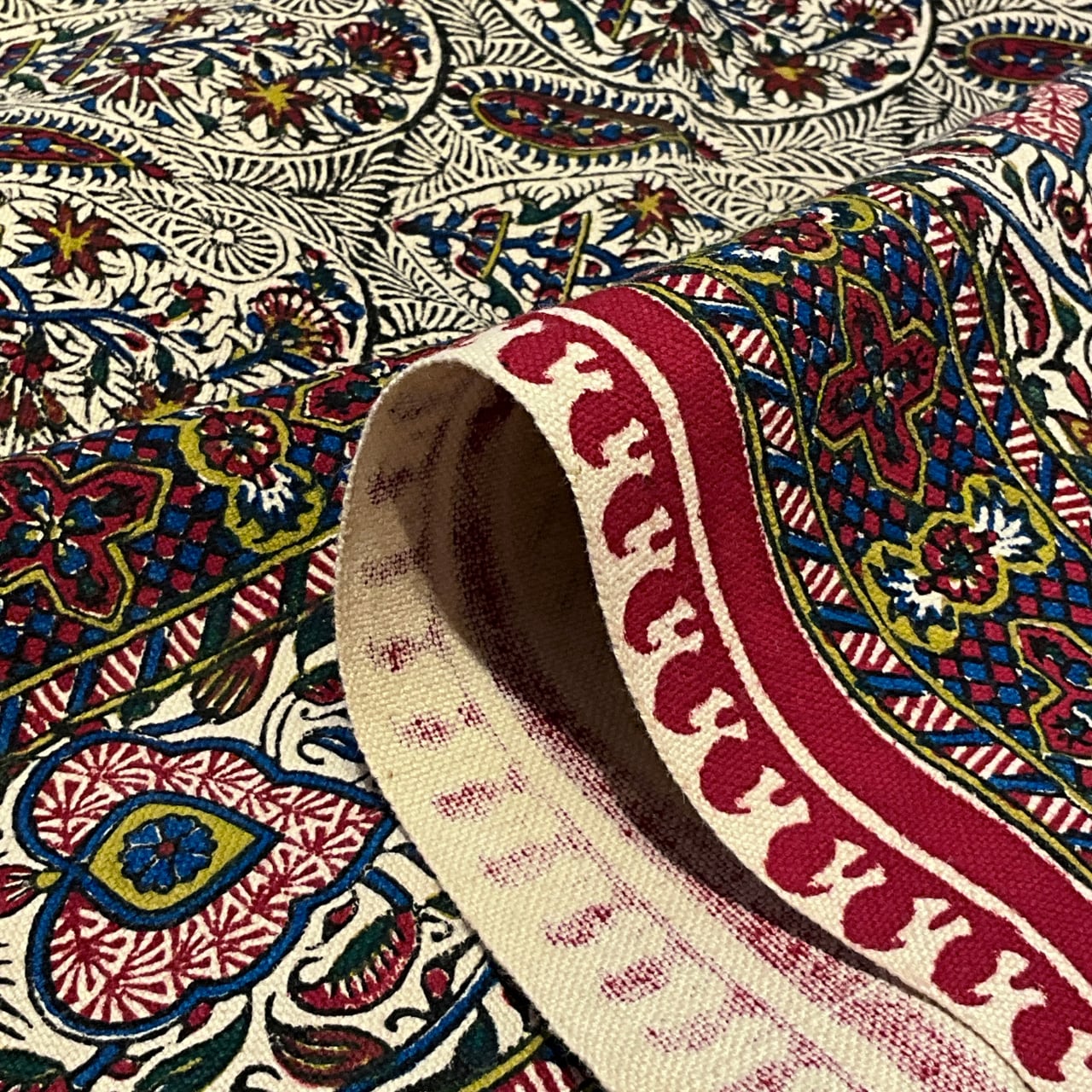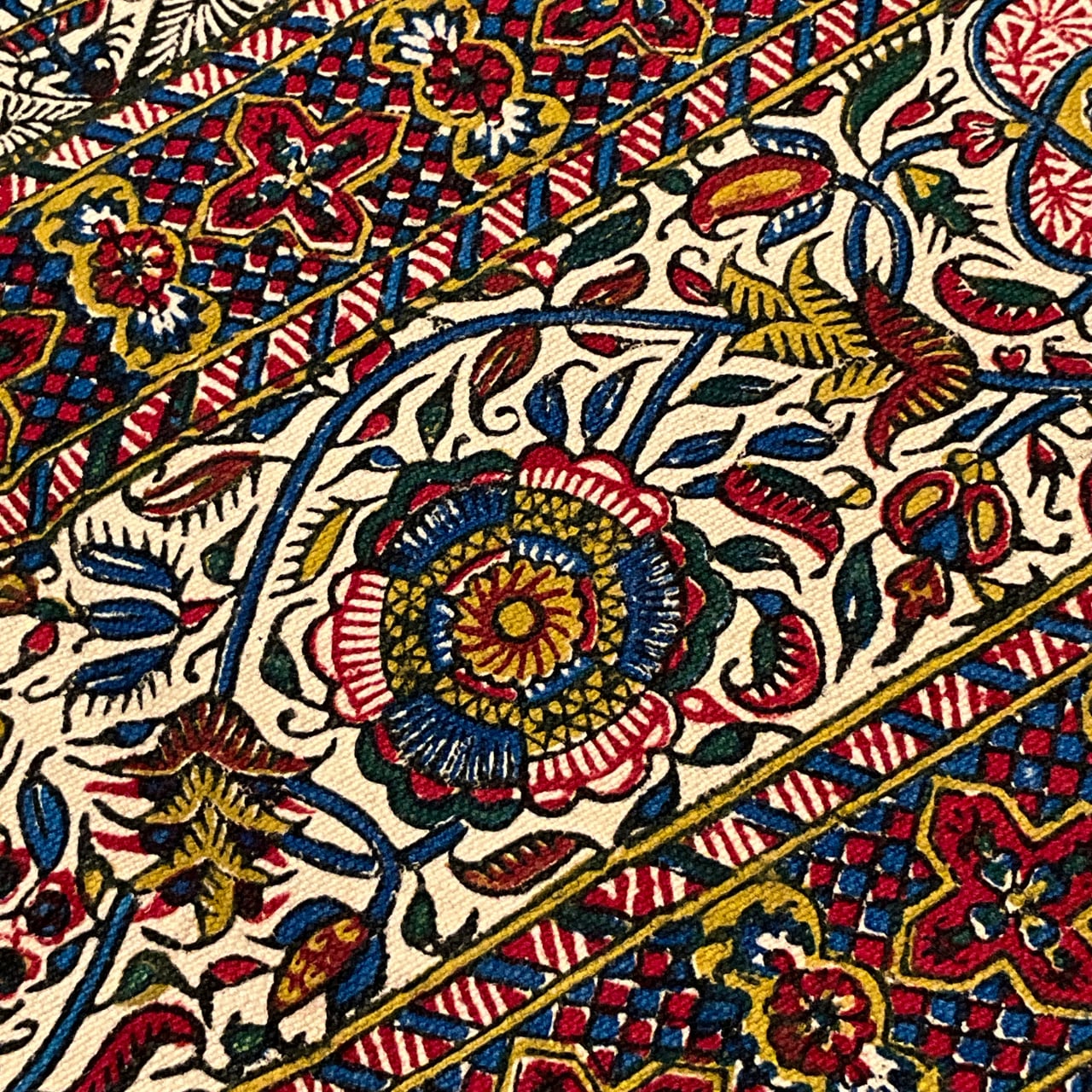 ペルシャ更紗は、イランの古都イスファハンで、伝統的な手法で作られているハンドプリントの手工芸品です。ペルシャ語では「ガラムカーリ」と呼ばれます。更紗職人により、梨の木を繰り抜いて作られた木判で、押し染めを繰り返してデザインを作っていきます。紋様を一つ完成させるのにも、異なる型判や色を塗り替えて押すので、紋様が出来上がるまでには4〜5回もの作業を必要とします。