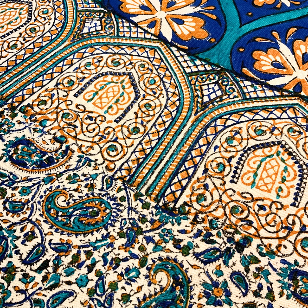 ペルシャ更紗は、イランの古都イスファハンで、伝統的な手法で作られているハンドプリントの手工芸品です。ペルシャ語では「ガラムカーリ」と呼ばれます。更紗職人により、梨の木を繰り抜いて作られた木判で、押し染めを繰り返してデザインを作っていきます。紋様を一つ完成させるのにも、異なる型判や色を塗り替えて押すので、紋様が出来上がるまでには4〜5回もの作業を必要とします。