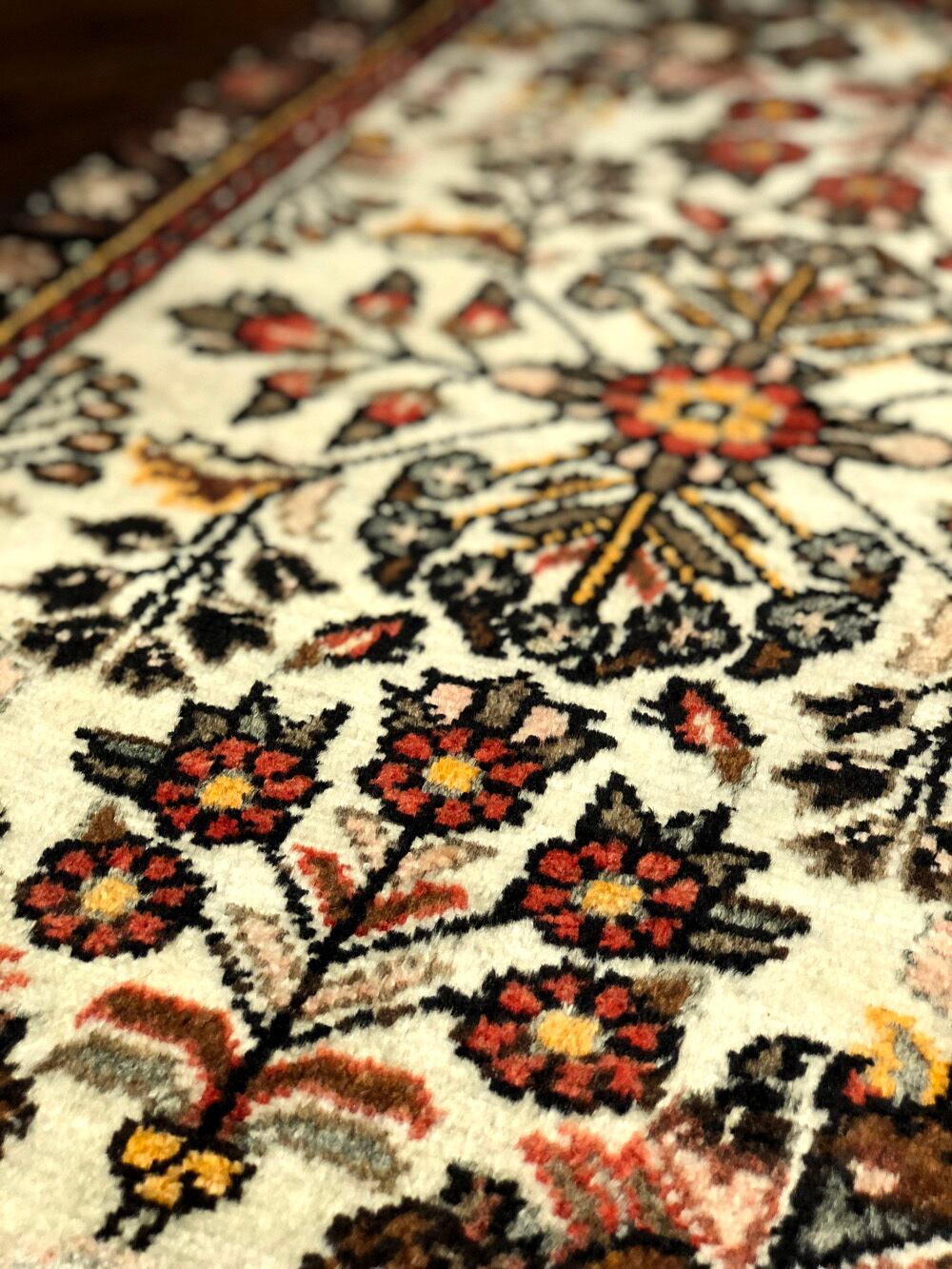 クラシカルで重厚なテイストが多いハマダン産の絨毯ですが、ベージュを基調にフェミニンな印象のこちらの絨毯。紋様の色調は軽やかですが、紋様の輪郭の多くがダークブラウン。そのため小ぶりなサイズですがしっかりとした存在感もあります。ベッドサイドやリビングのアクセントラグとして、目を楽しませてくれる絨毯です。